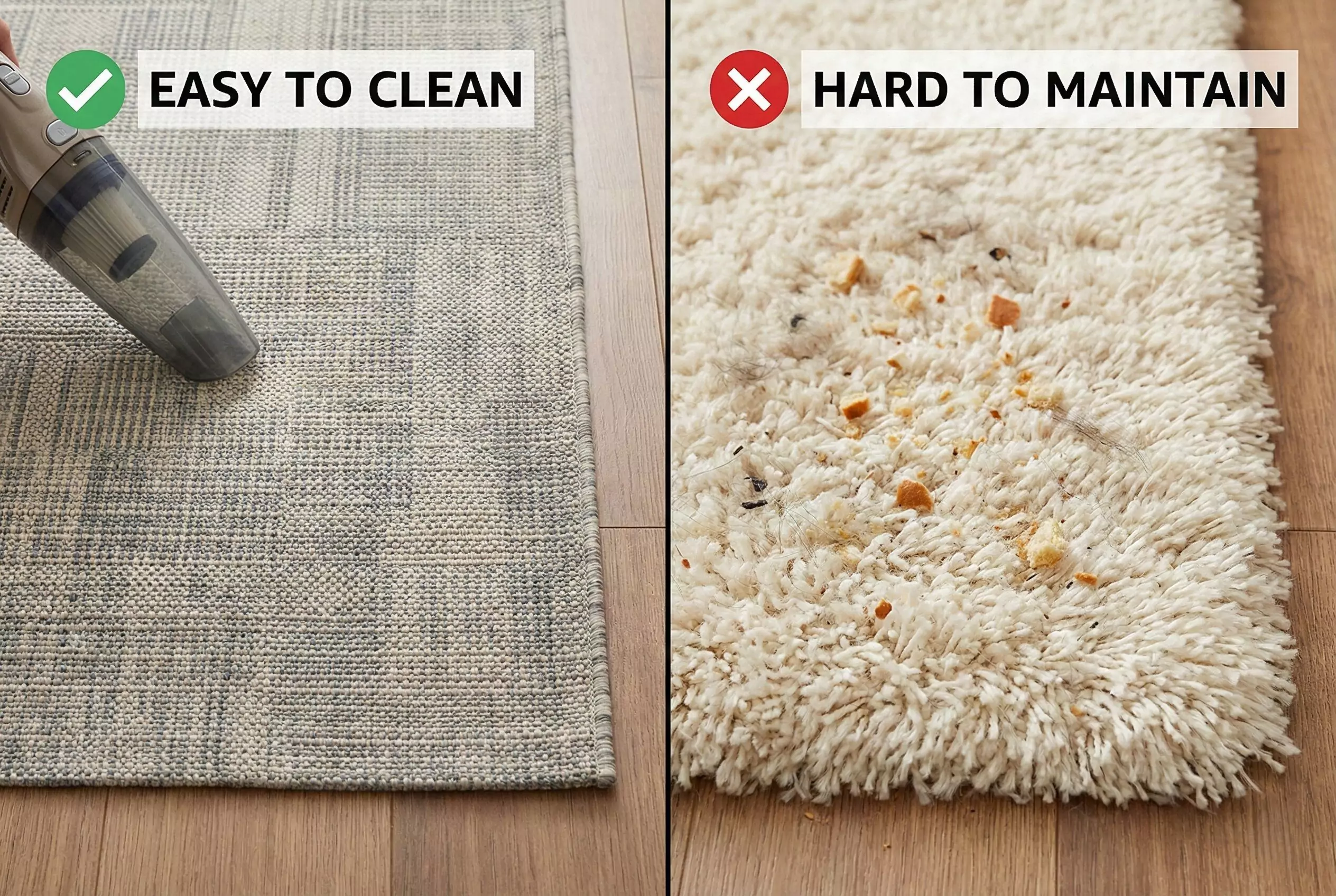 | Material | Polypropylene, Nylon, Washable Cotton, Bamboo | Wool, Silk, High-pile Shag |