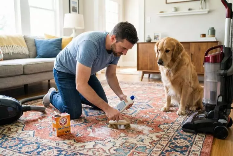 To remove dog smell from a rug, first blot any fresh accidents with a clean towel. For general odours, sprinkle a generous amount of bicarbonate