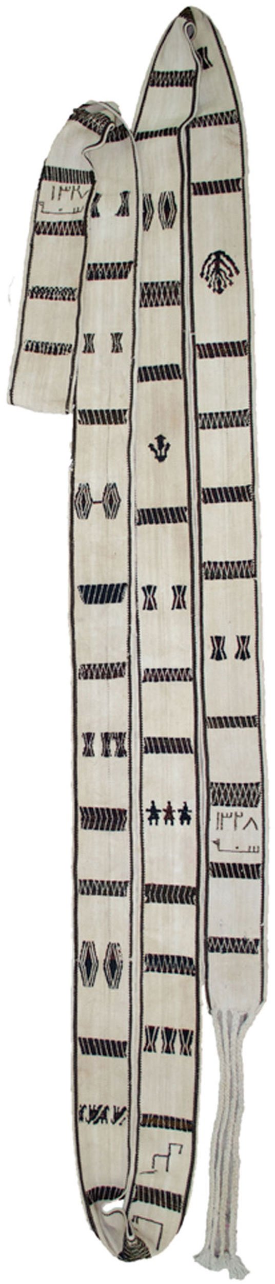The design is rendered in a simple yet charming two-colour palette, featuring bushes, stylised human figures, and tribal motifs, reflecting the daily life, beliefs, and identity of the nomadic weaver. The fine weave and linear format are typical of tentbands, which were traditionally used to secure or decorate the interior and exterior of nomadic tents.