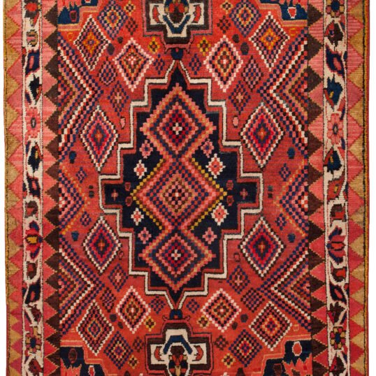 The design is bold yet instinctive. A lively diamond medallion anchors the centre, filled with vibrant tribal colour and movement. Rather than repeating the same motif, the surrounding areas shift and change, revealing the weaver’s freedom of expression and personal rhythm. This variation is what makes the rug feel alive and individual rather than formal or symmetrical.