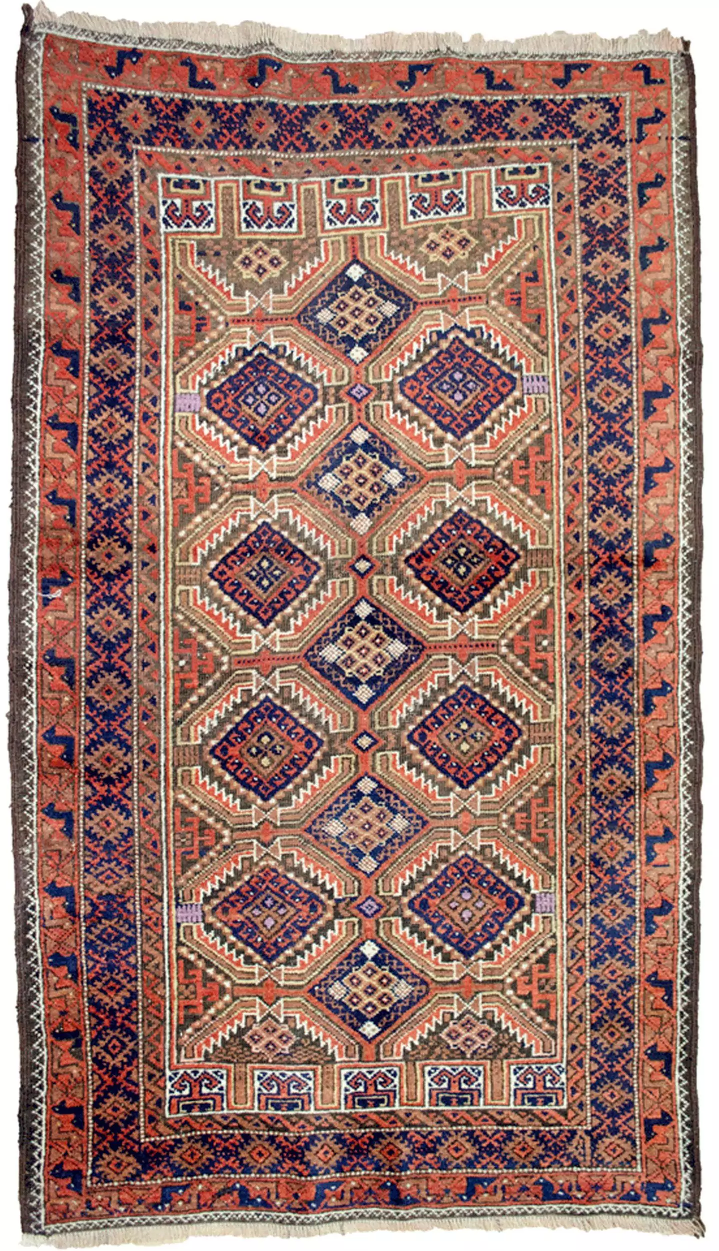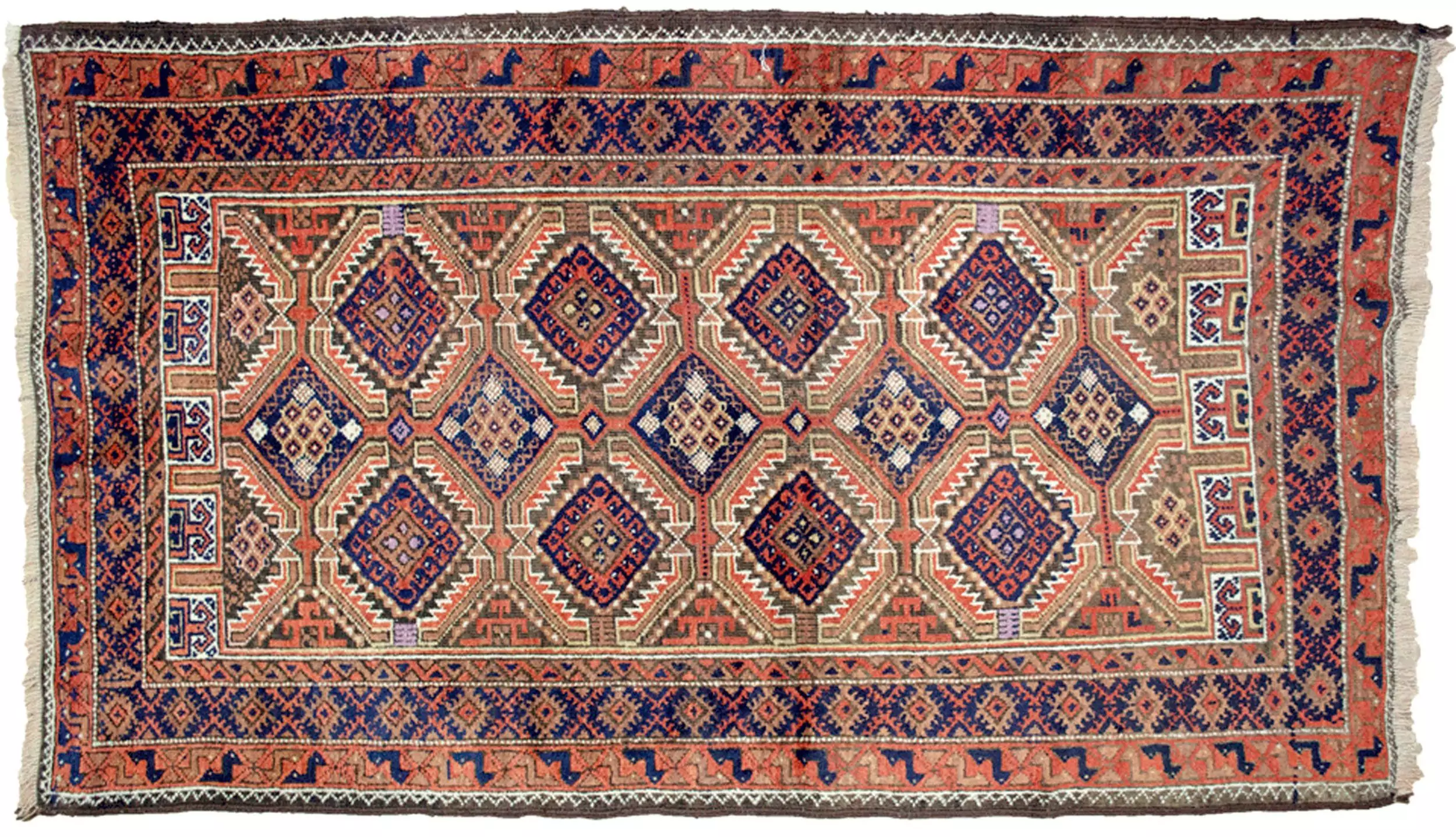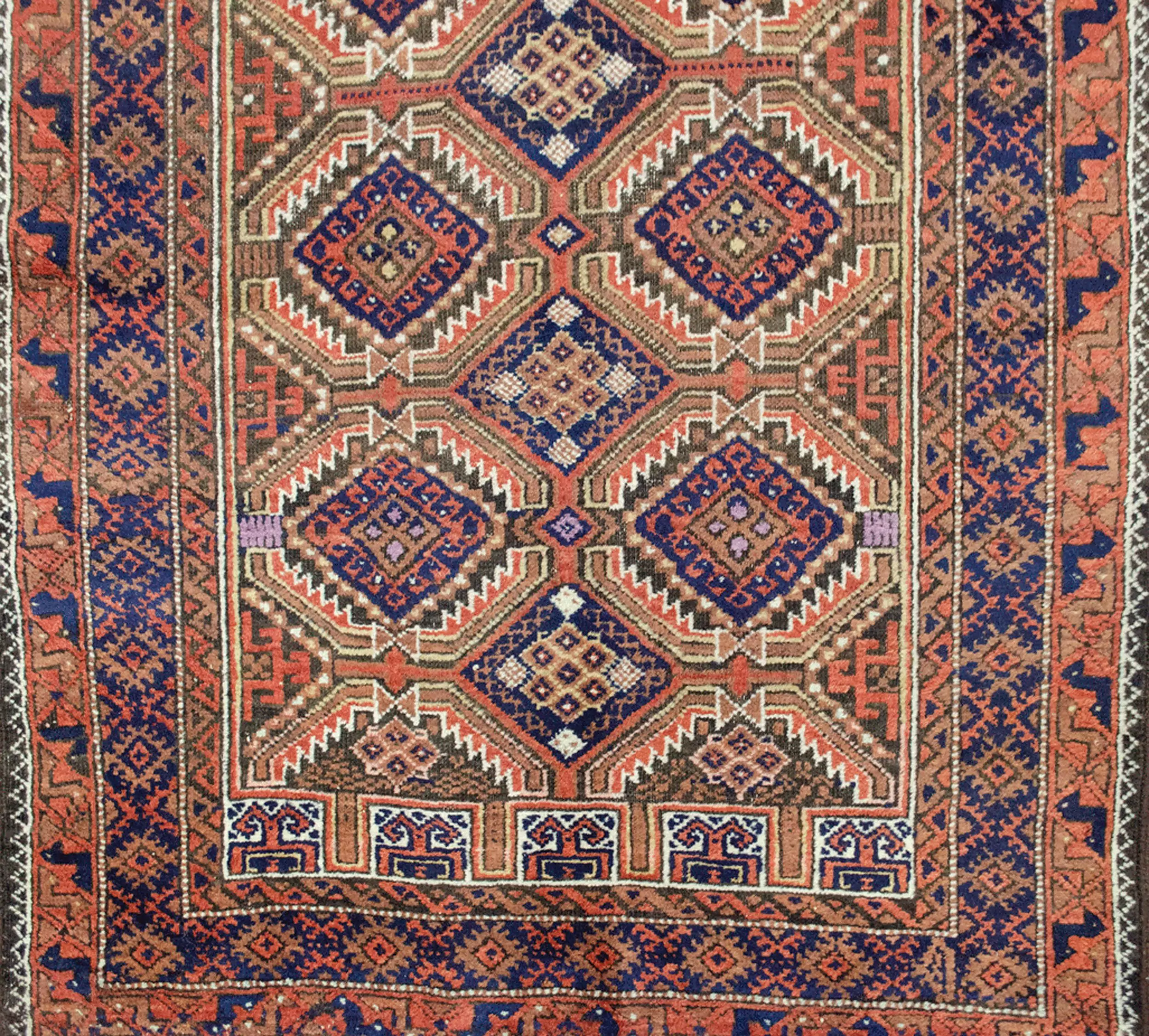 Framing the field is a bold blue inner border, which gives the design clarity and contrast, followed by an outer terracotta guard border decorated with stylised peacocks—a motif rarely found in Baluch rugs and believed to symbolise protection and beauty.
