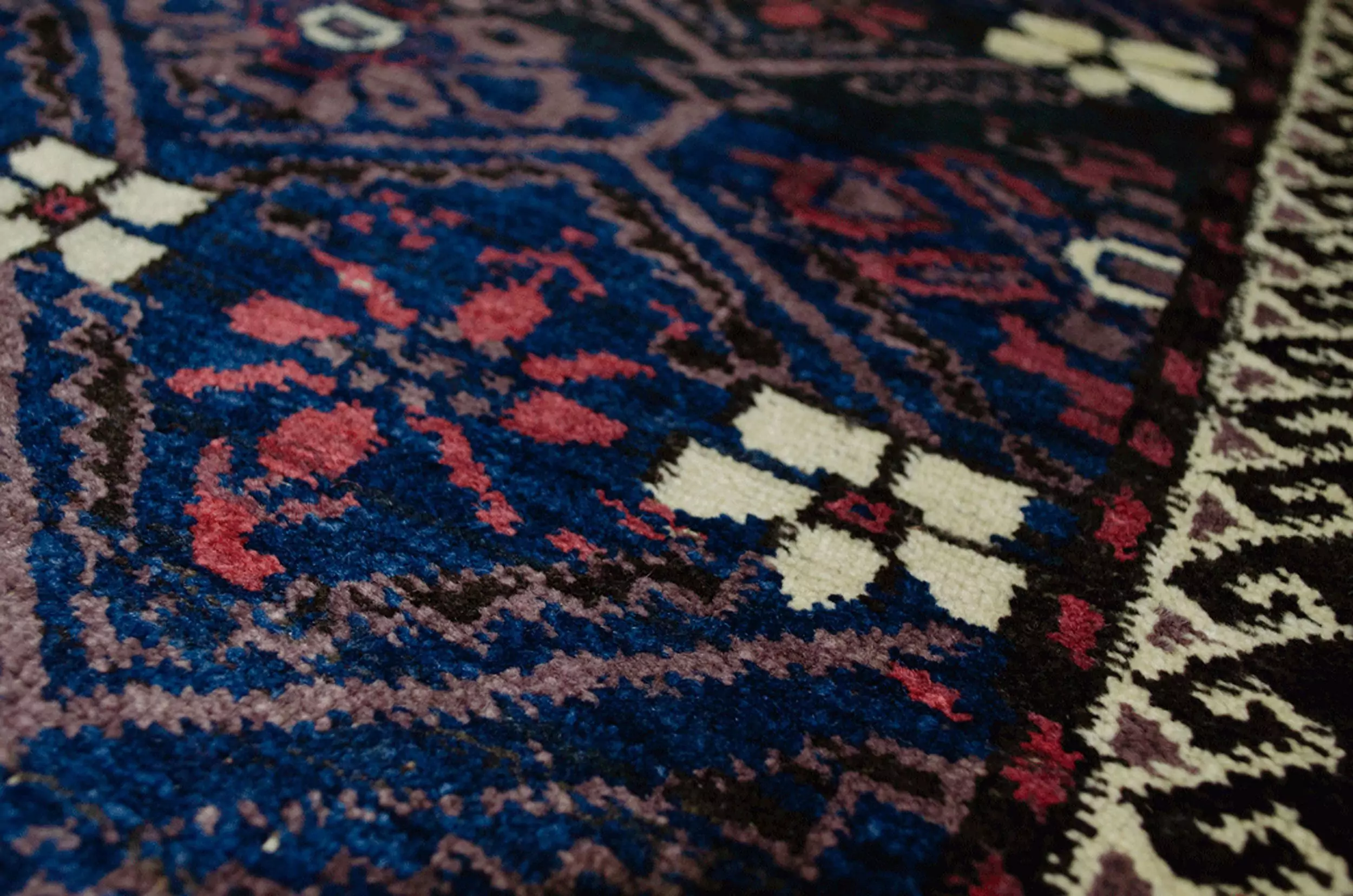 Woven entirely on a wool foundation, the rug features soft, shiny wool that reflects its high material quality. The blue and purple field, rich with subtle abrushes (natural colour variations), is adorned with the Minakhani gul pattern—an iconic design consisting of interlinked flower motifs symbolising abundance and harmony.
