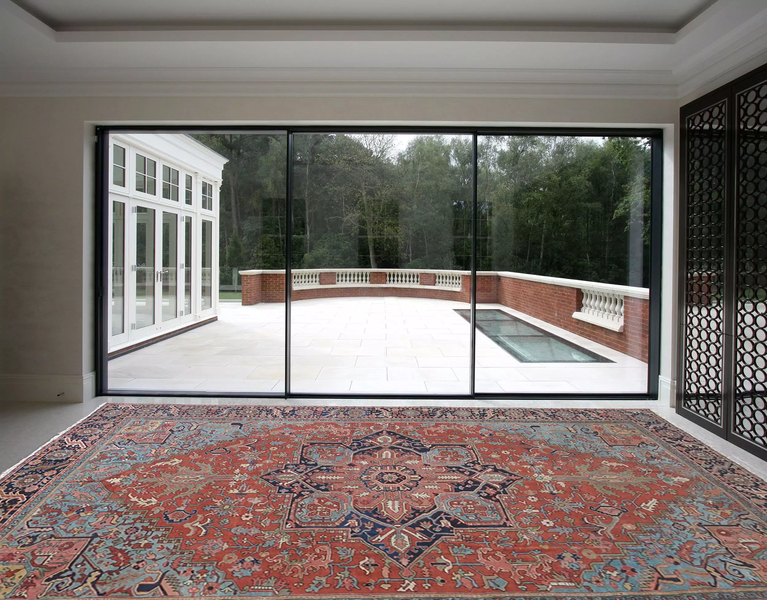 With its impressive dimensions, this Heriz carpet is ideally suited to a large living room or formal dining space, where its scale and confident geometry can be fully appreciated. It is a carpet of substance and authority, offering timeless Persian craftsmanship and enduring decorative power.