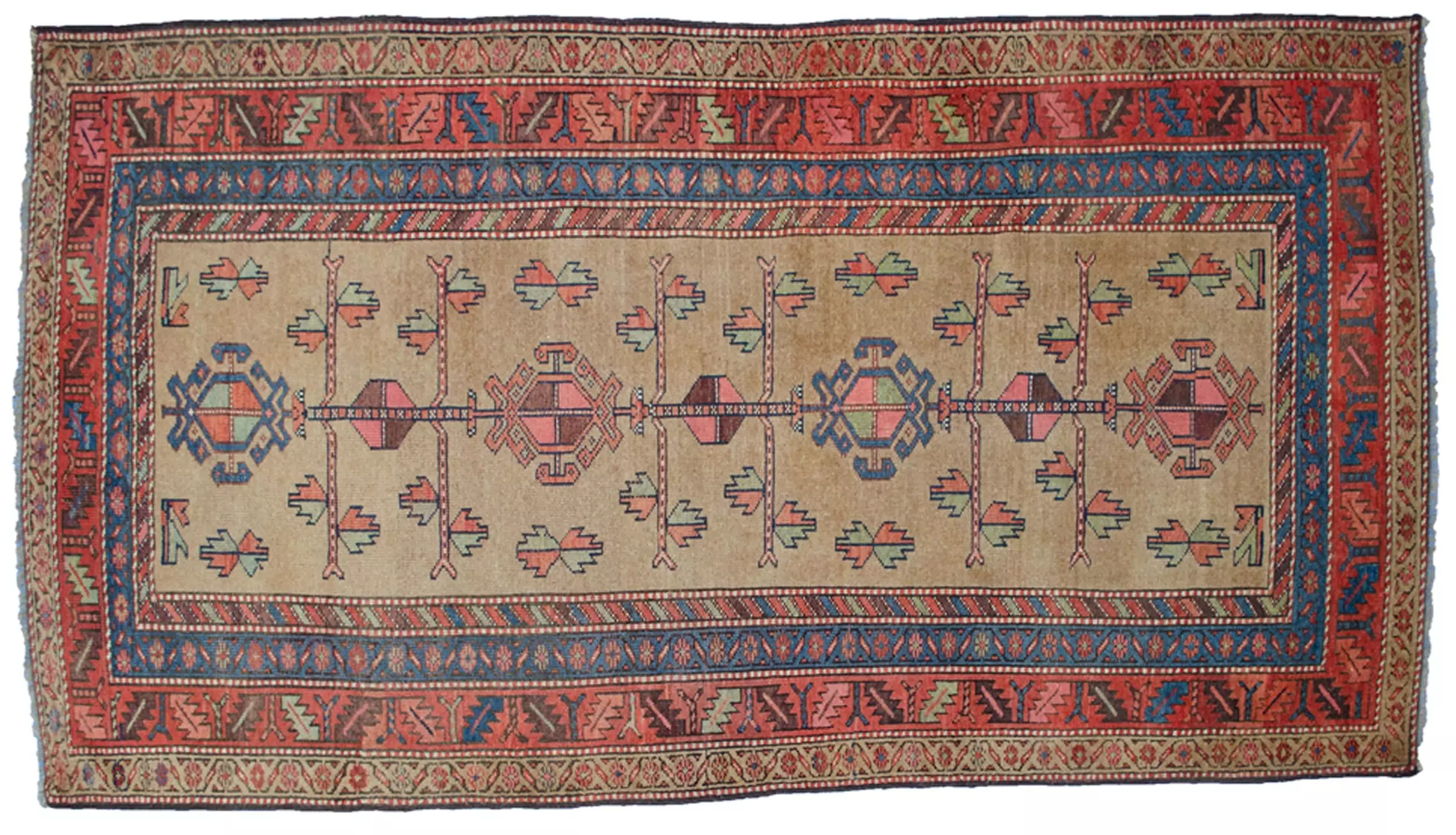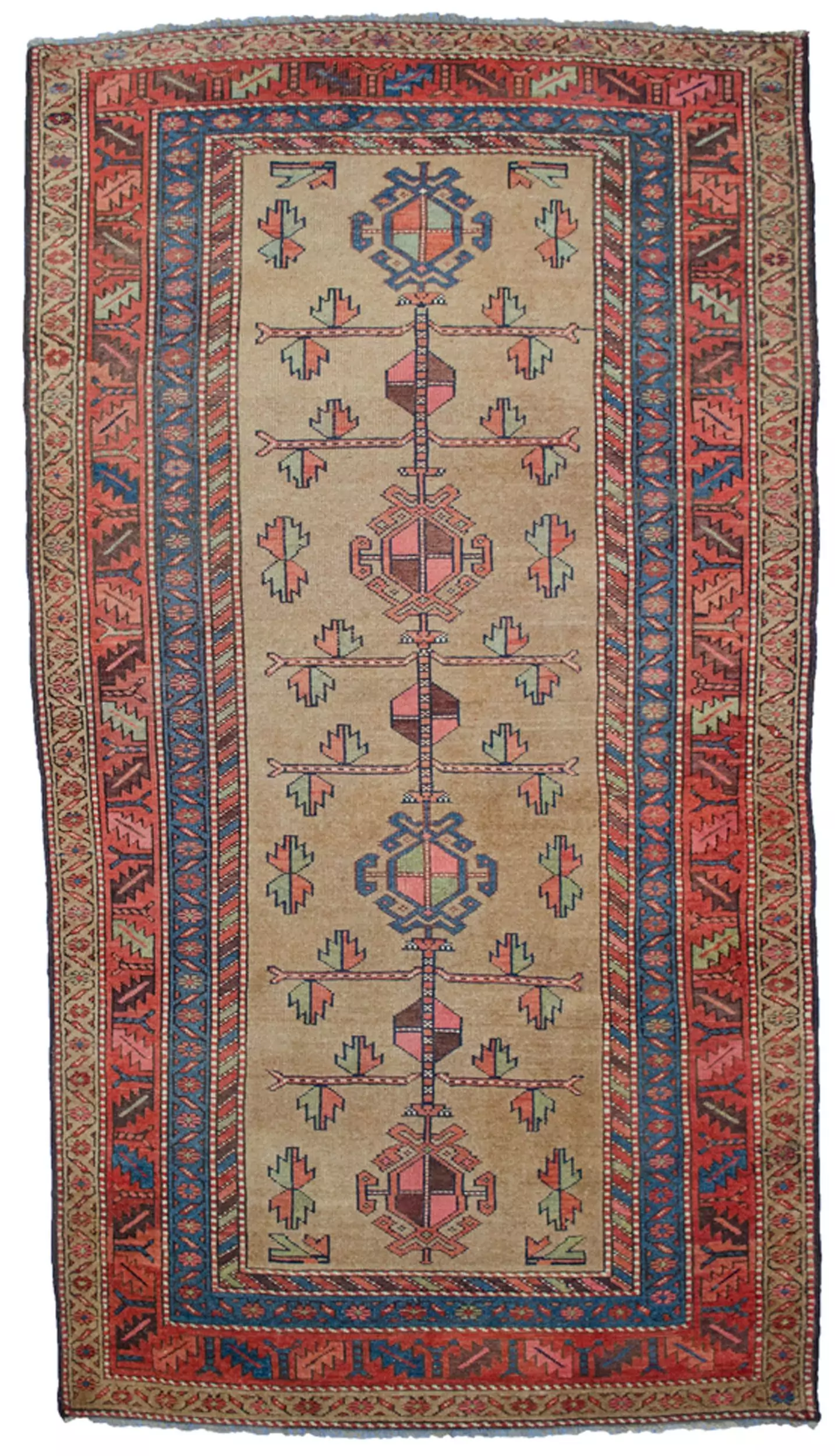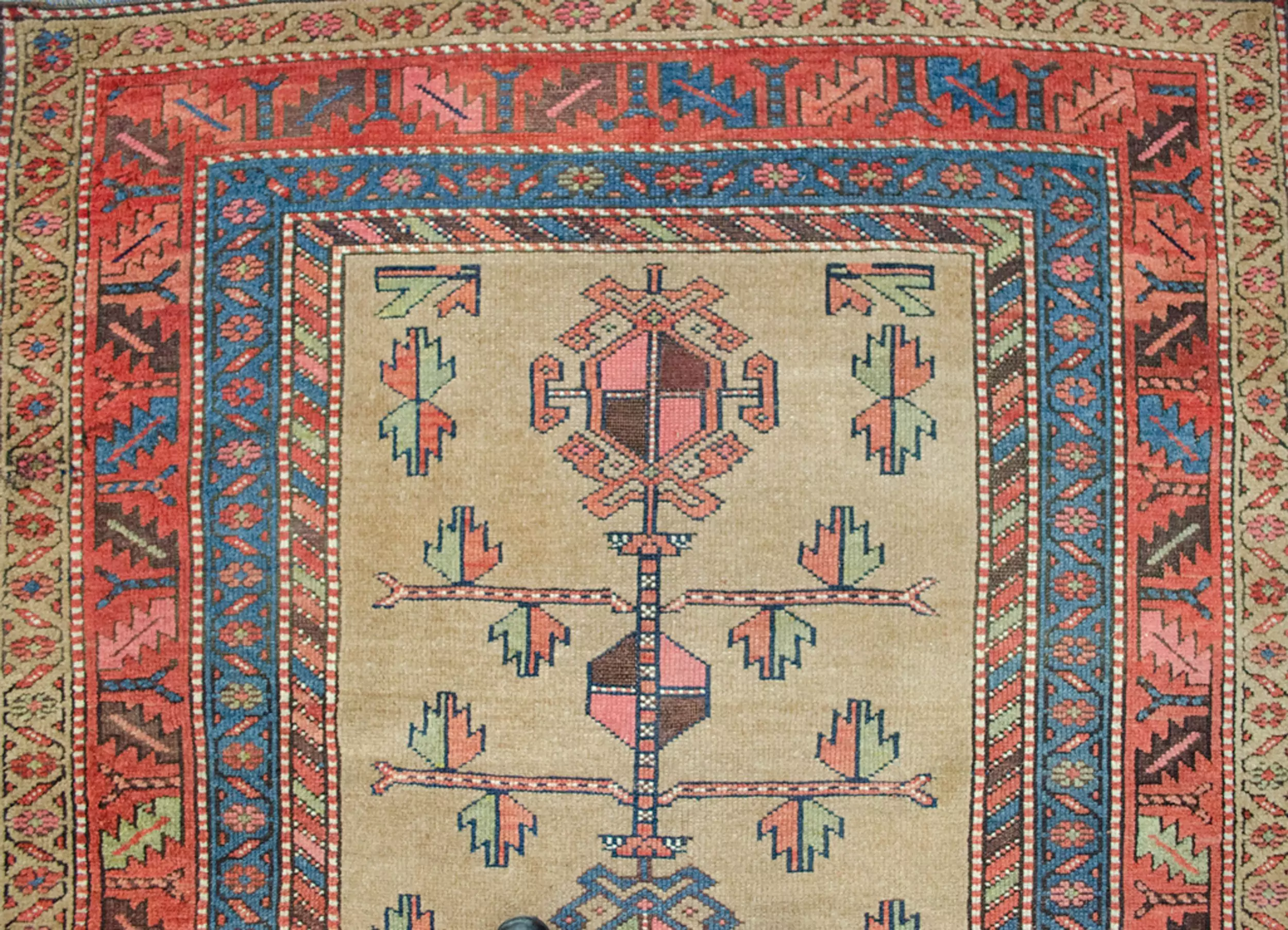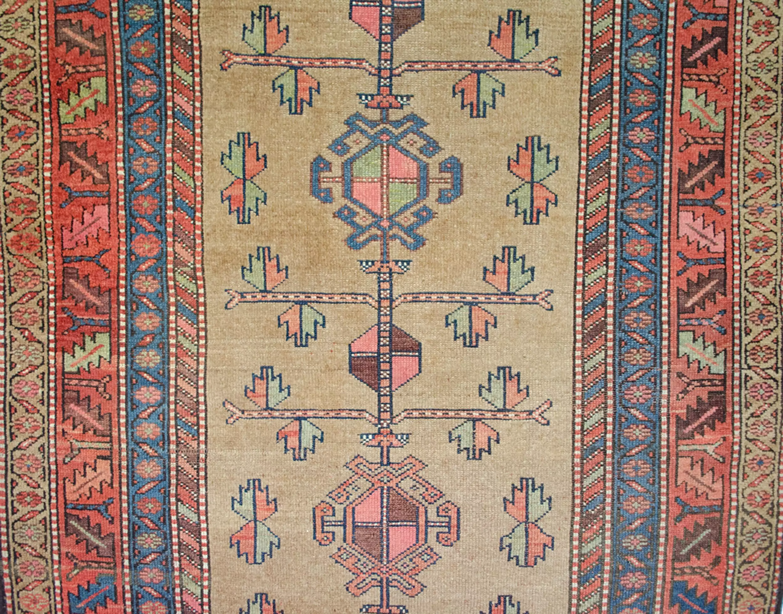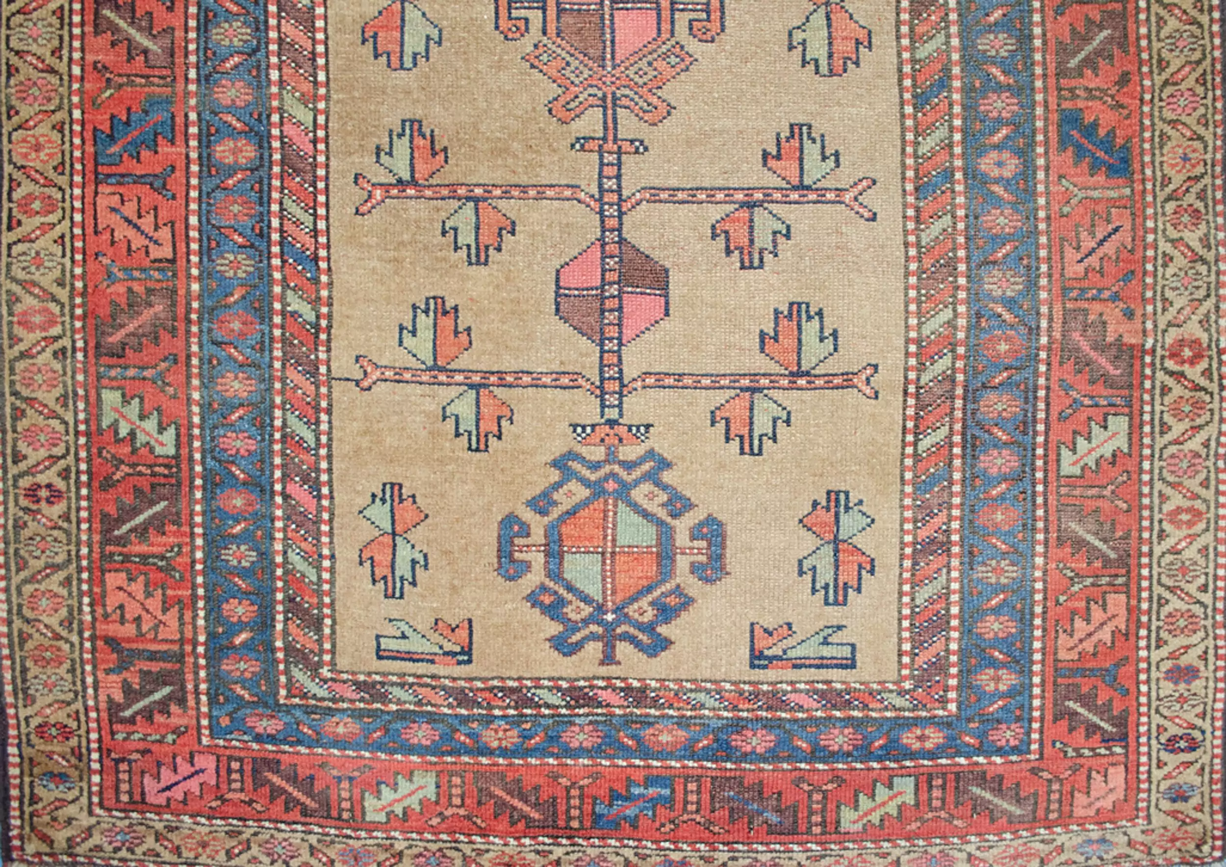 Early 20th-century antique Kordi rug from Iran. Hand-knotted wool with a soft beige and rose palette and tribal geometric design. Ideal for living or sitting rooms.
