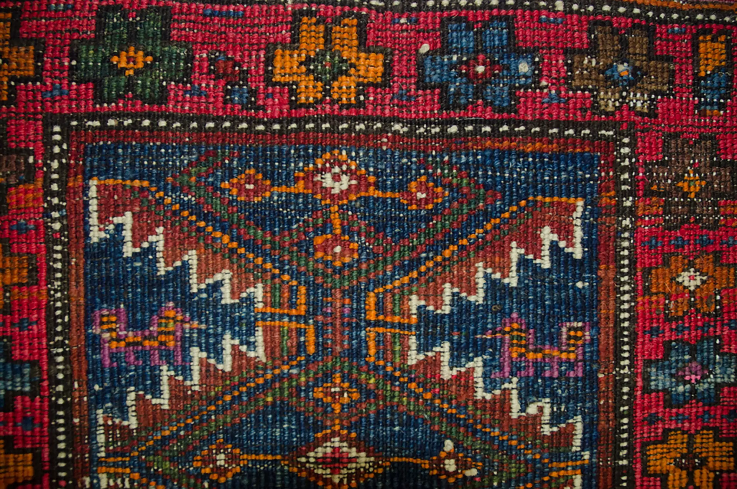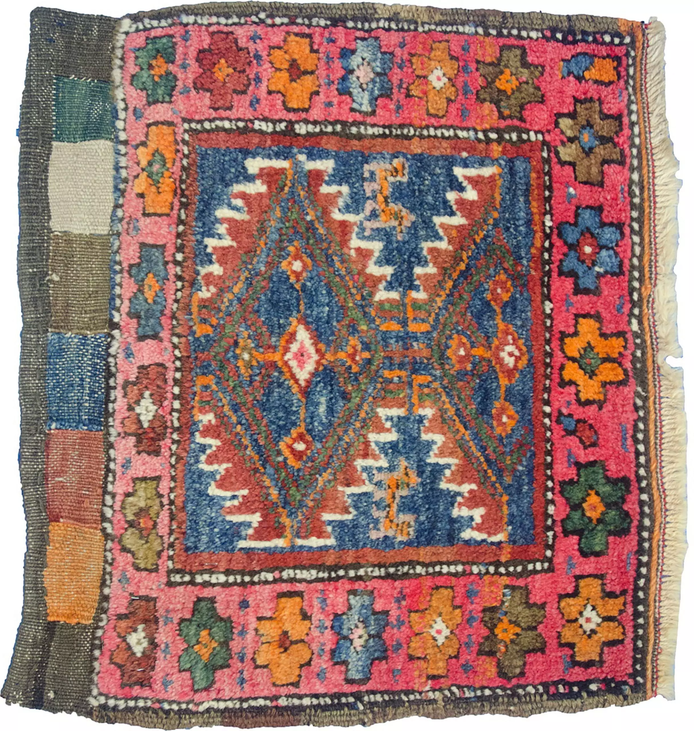 Pretty antique Lori Bag face from the West of Iran. Beautiful pink border with flower heads and blue ground with lozenge medallions containing crosses and two dogs. The wool is handspun, and the dyes are natural.