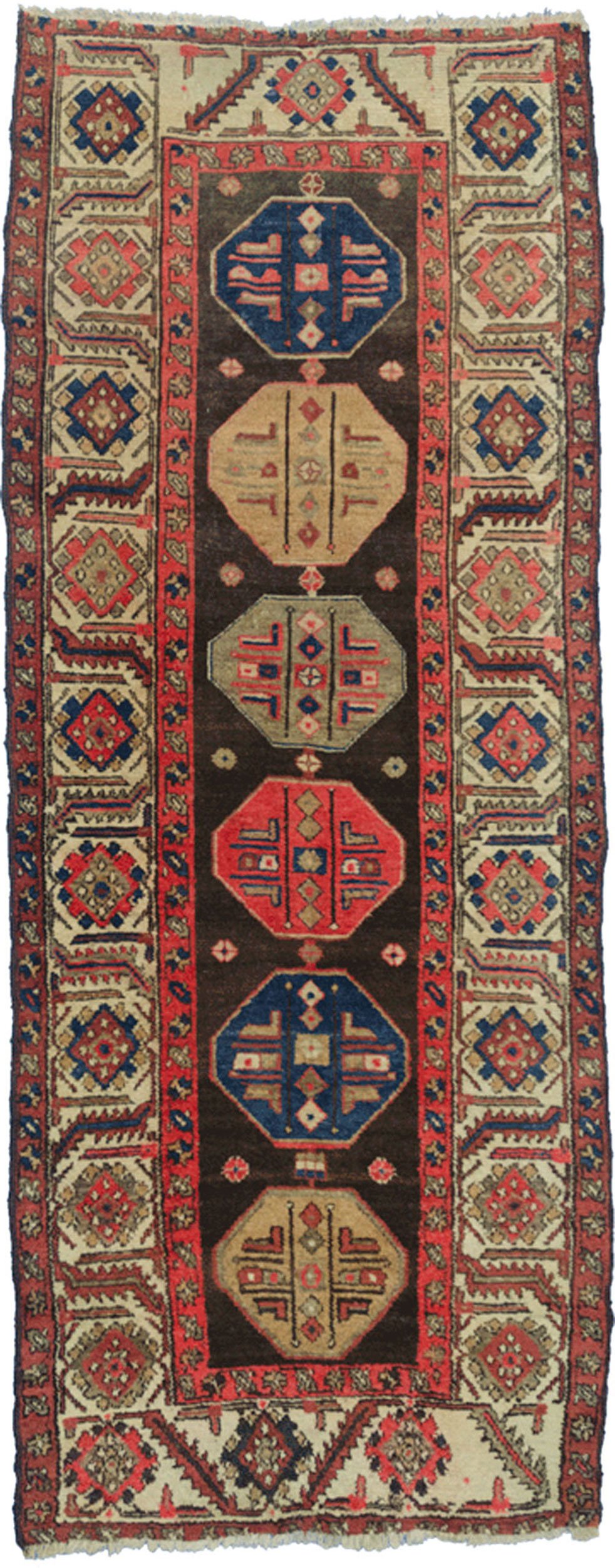 Attractive Antique Malayer runner from West Iran. Six hexagonal medallions with different colours on a brown background and a very impressive geometric cream border.
