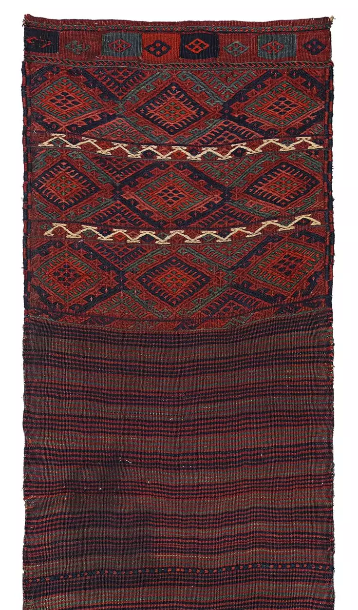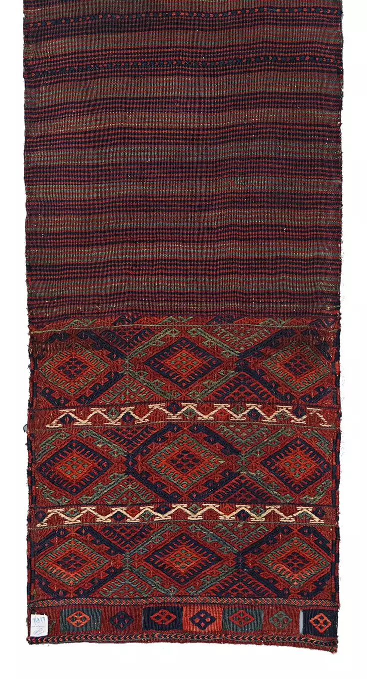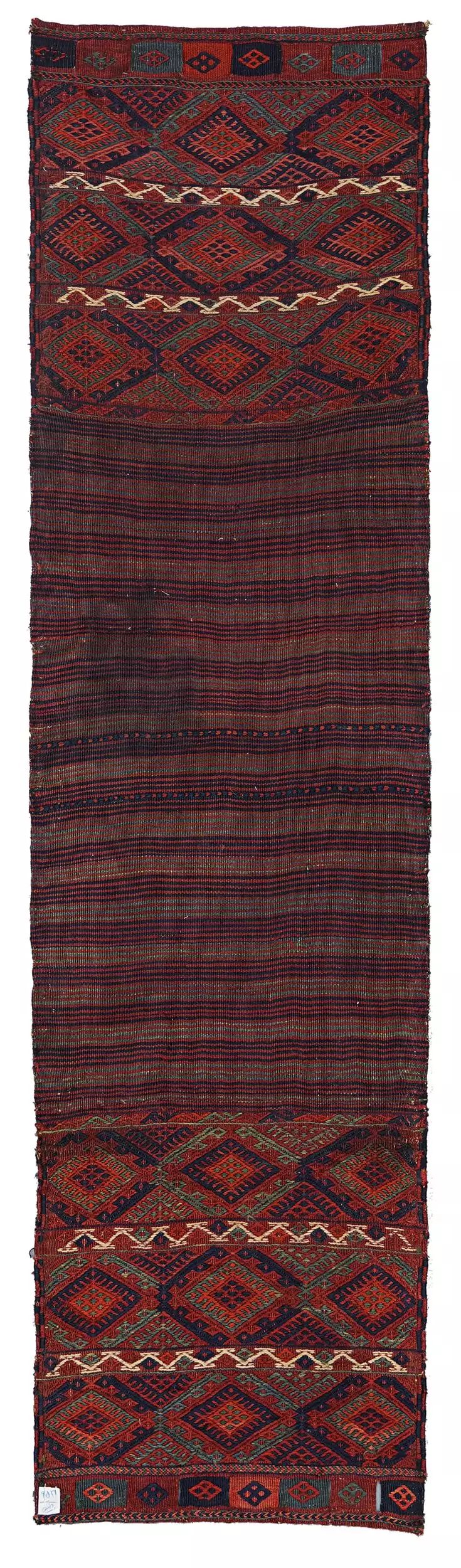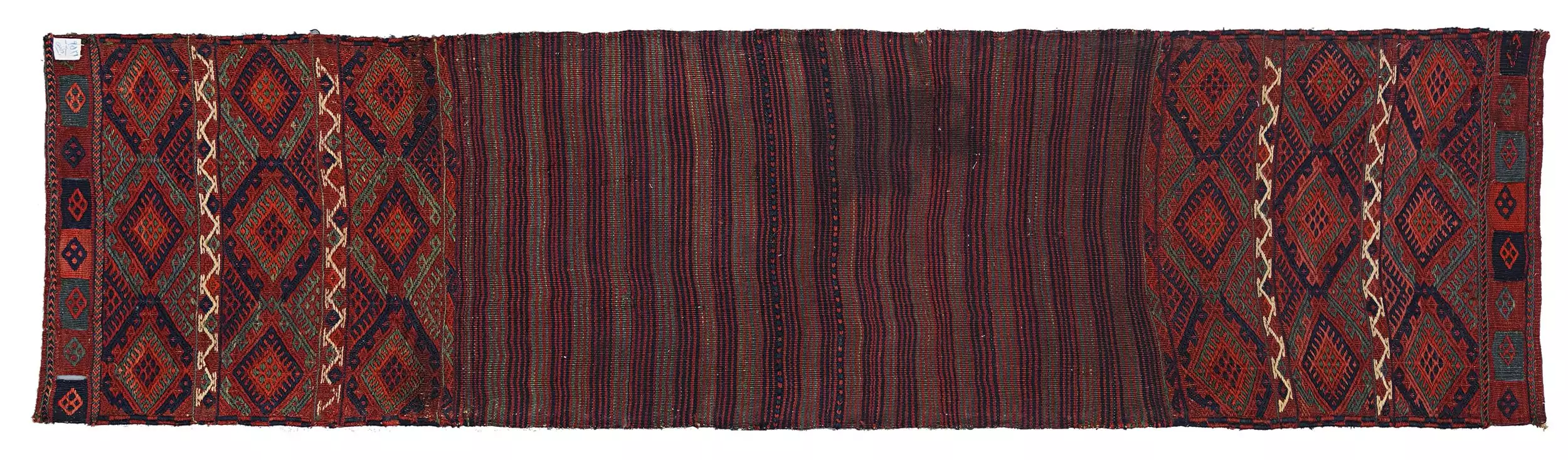 An antique Qashqai kilim bag opened flat and used as a narrow runner. Handwoven wool with natural dyes, rich stripes, and authentic tribal character.