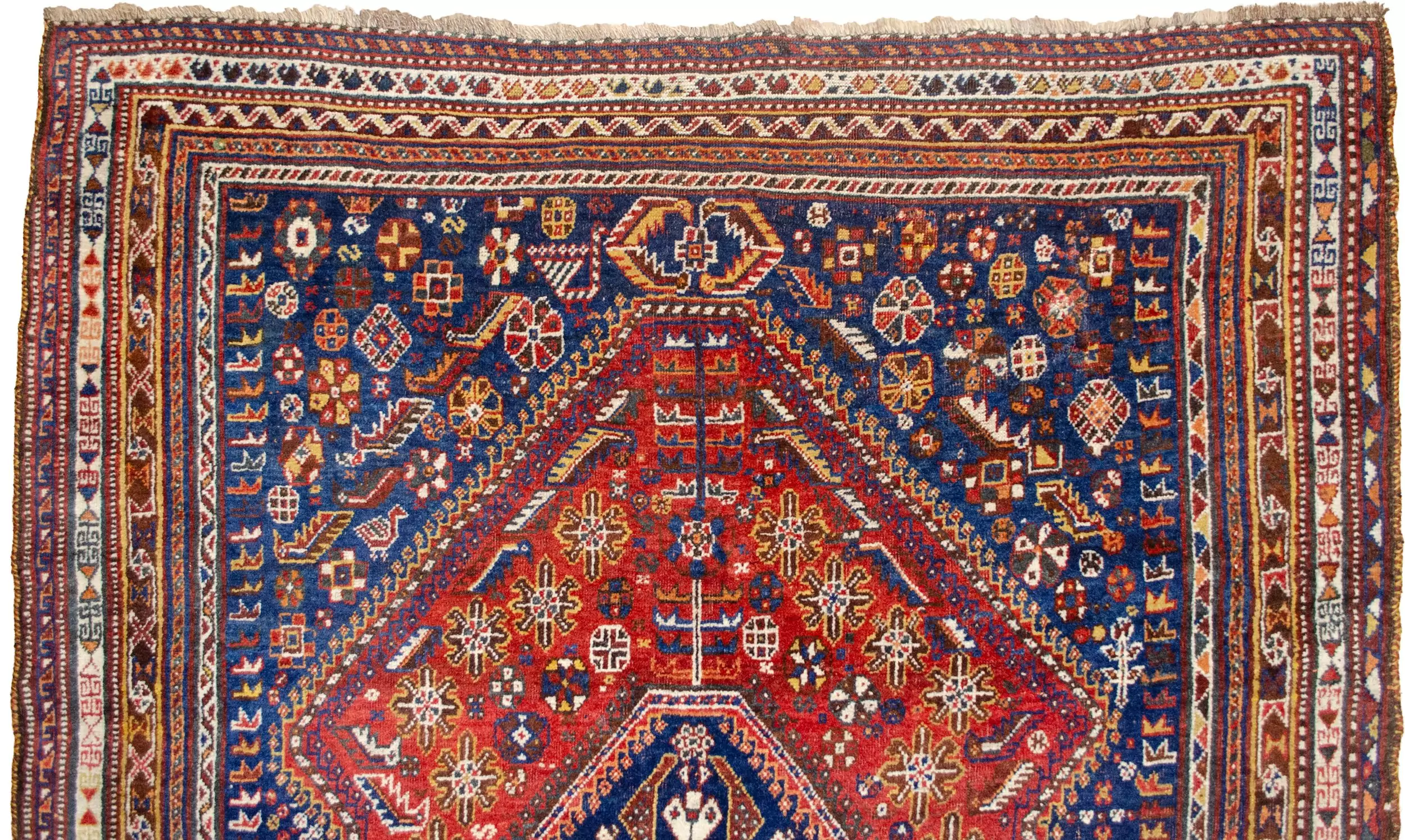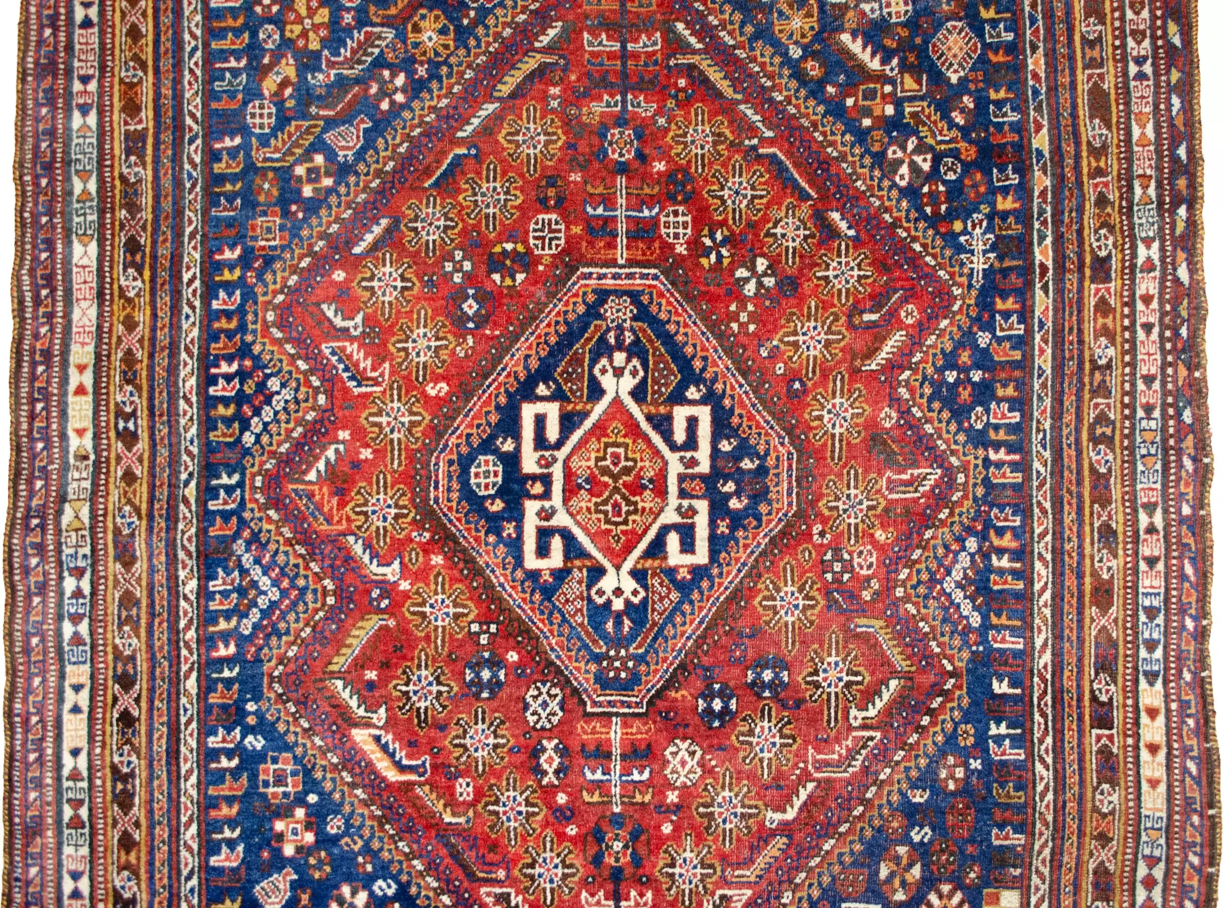This antique Qashqai rug is a striking representation of South Persian tribal art at its most symbolic. Anchored by a rich, saturated red ground, the piece features a commanding indigo blue central medallion. At the heart of this medallion lies the famous Qashqai “Scarab Beetle” motif—an ancient tribal symbol of protection and rebirth—with distinctive poles protruding from each end, a signature of the most traditional Qashqai lineages.