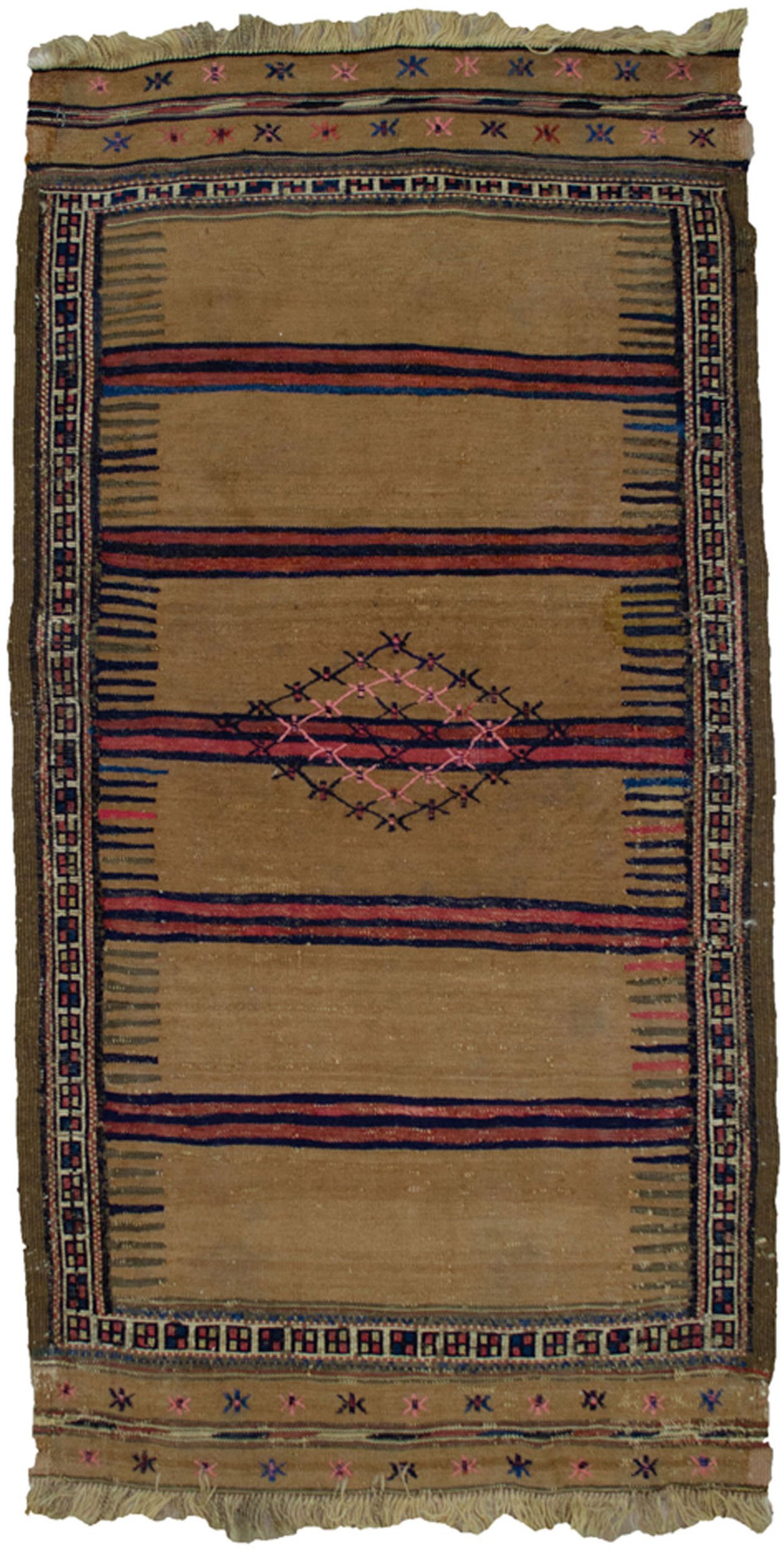 Design: Camel ground with red & blue bands, lozenge stars, cream square border