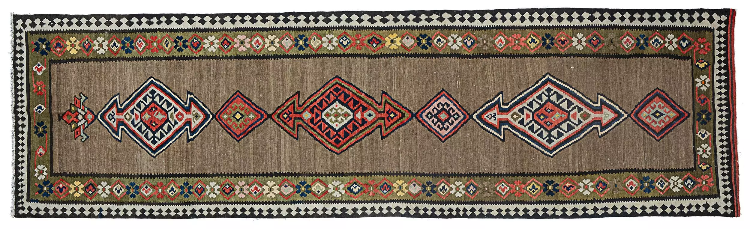 An antique Shahsavan kilim runner with three bold medallions and refined tribal geometry. Finely woven wool with natural abrushes and elegant borders.