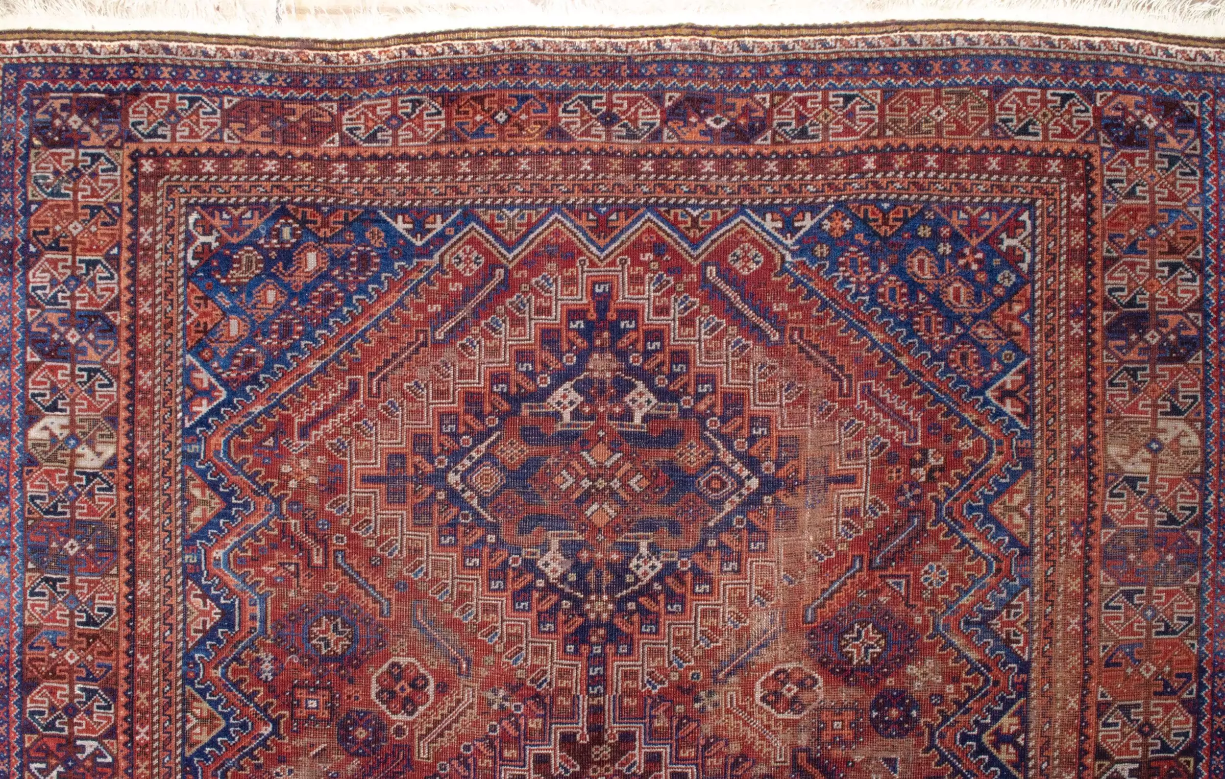 Nothing can beat the colours of an Antique rug. The ageing of good quality wool and natural dyes is what brings about such good decorative colours. While they can be quite expensive, but if you can get them in a shabby chic state, you have most of an antique rug’s characteristics without the pile condition. The other plus point is that you get them at a fraction of the price. This Shiraz rug, with its terrific hues of red and blue, fits the bill very well.
