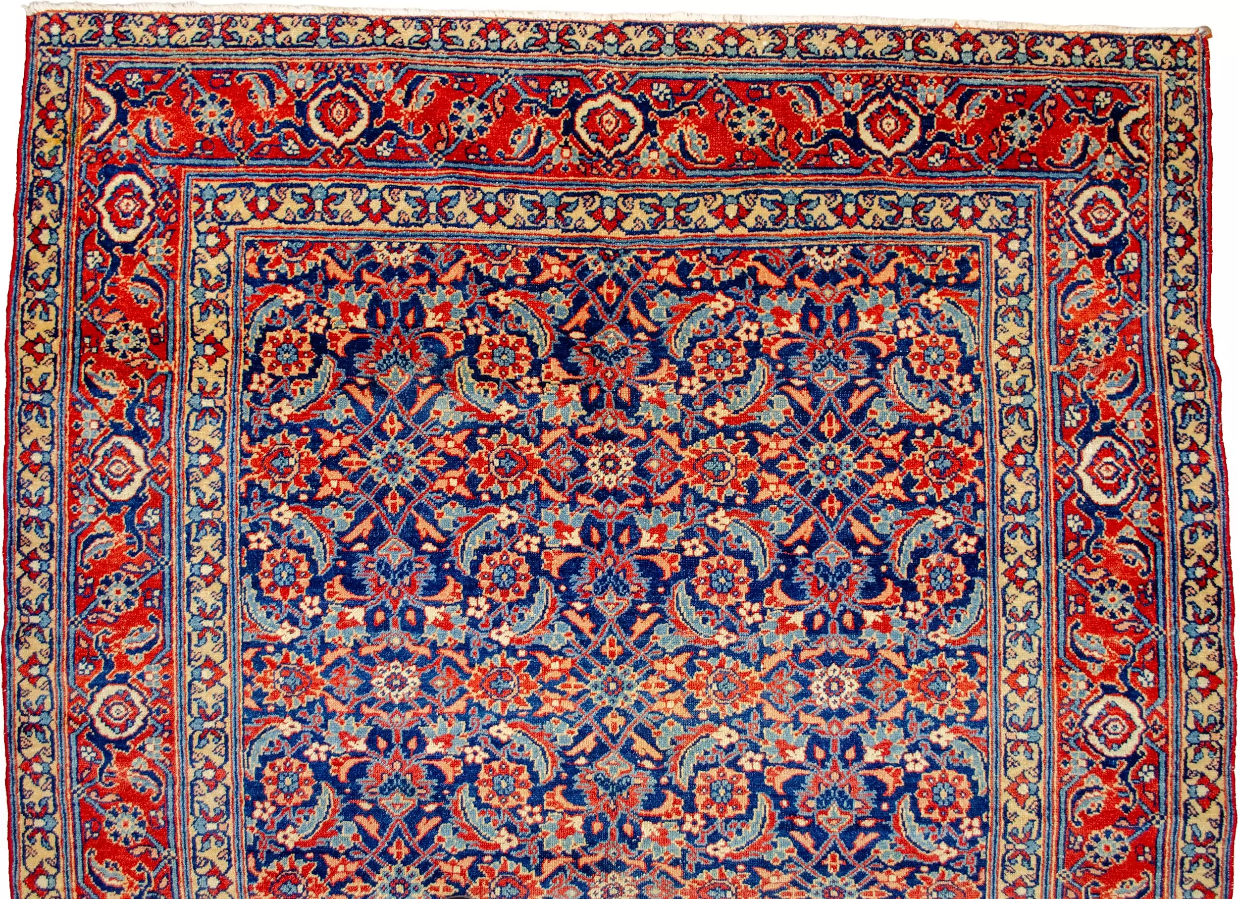 The Palette: A striking royal blue ground provides a deep, regal backdrop that allows the intricate Mahi motifs to shimmer. This is perfectly balanced by a rich red border, creating a classic and commanding “Power Rug” aesthetic.