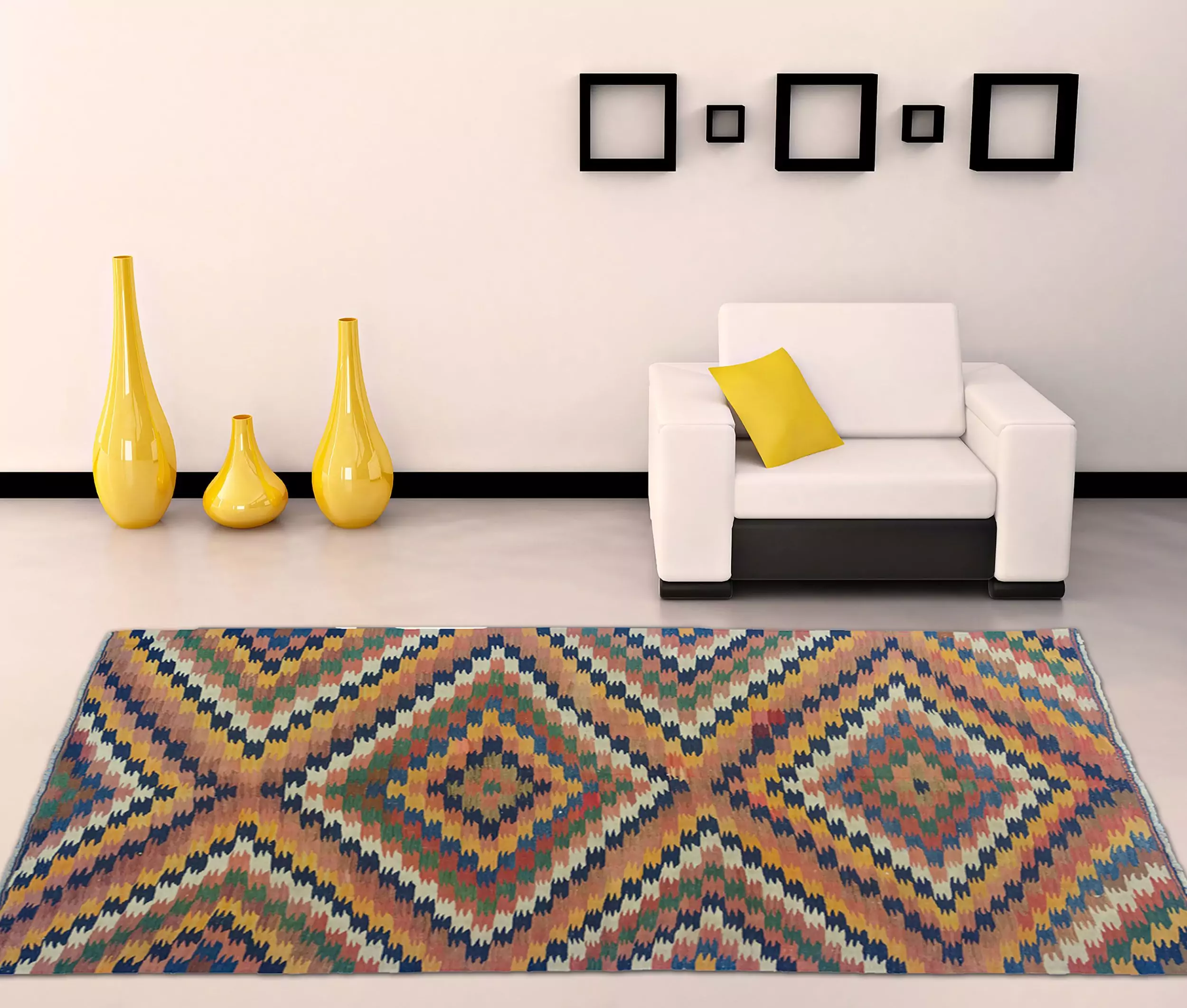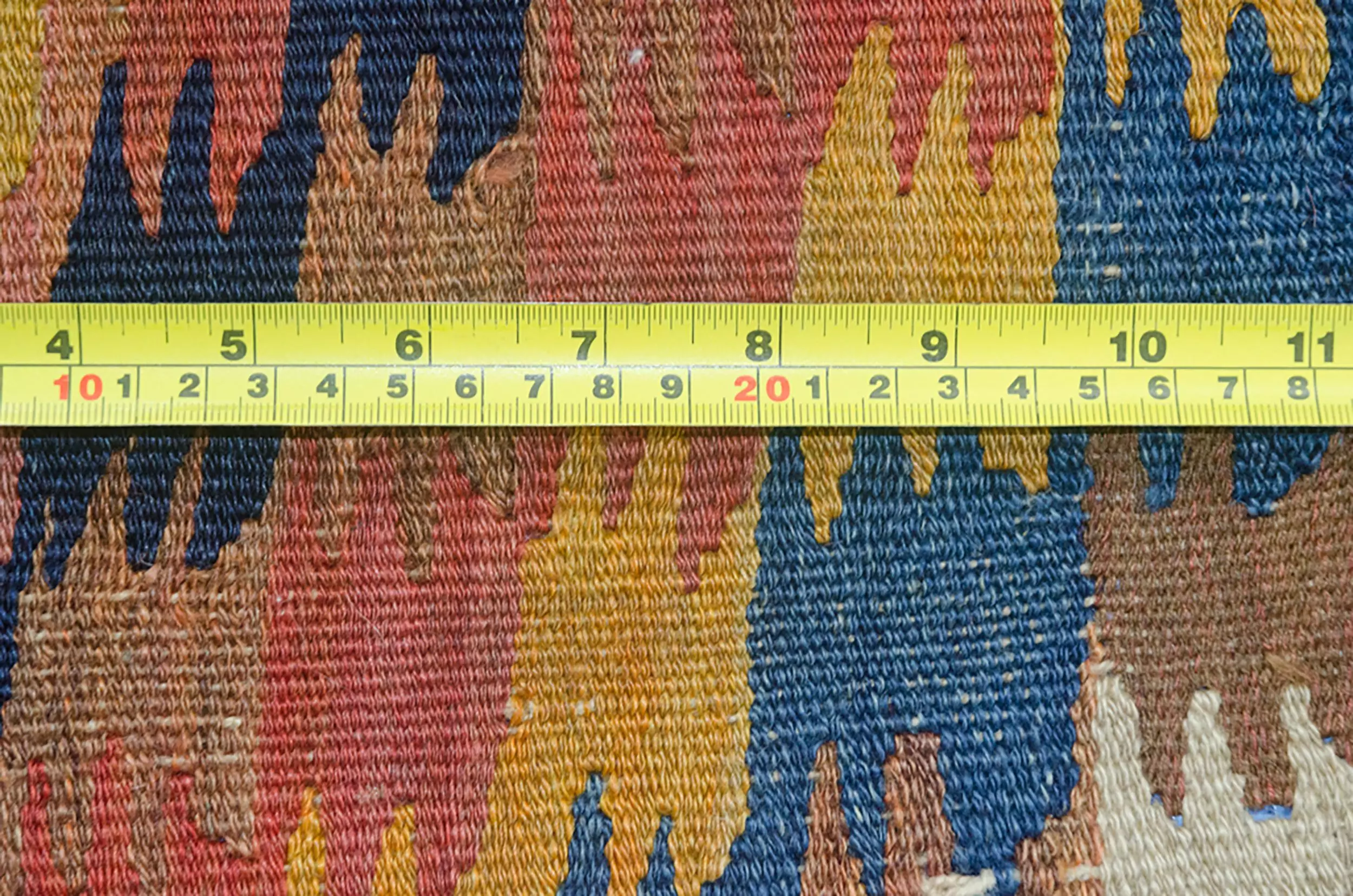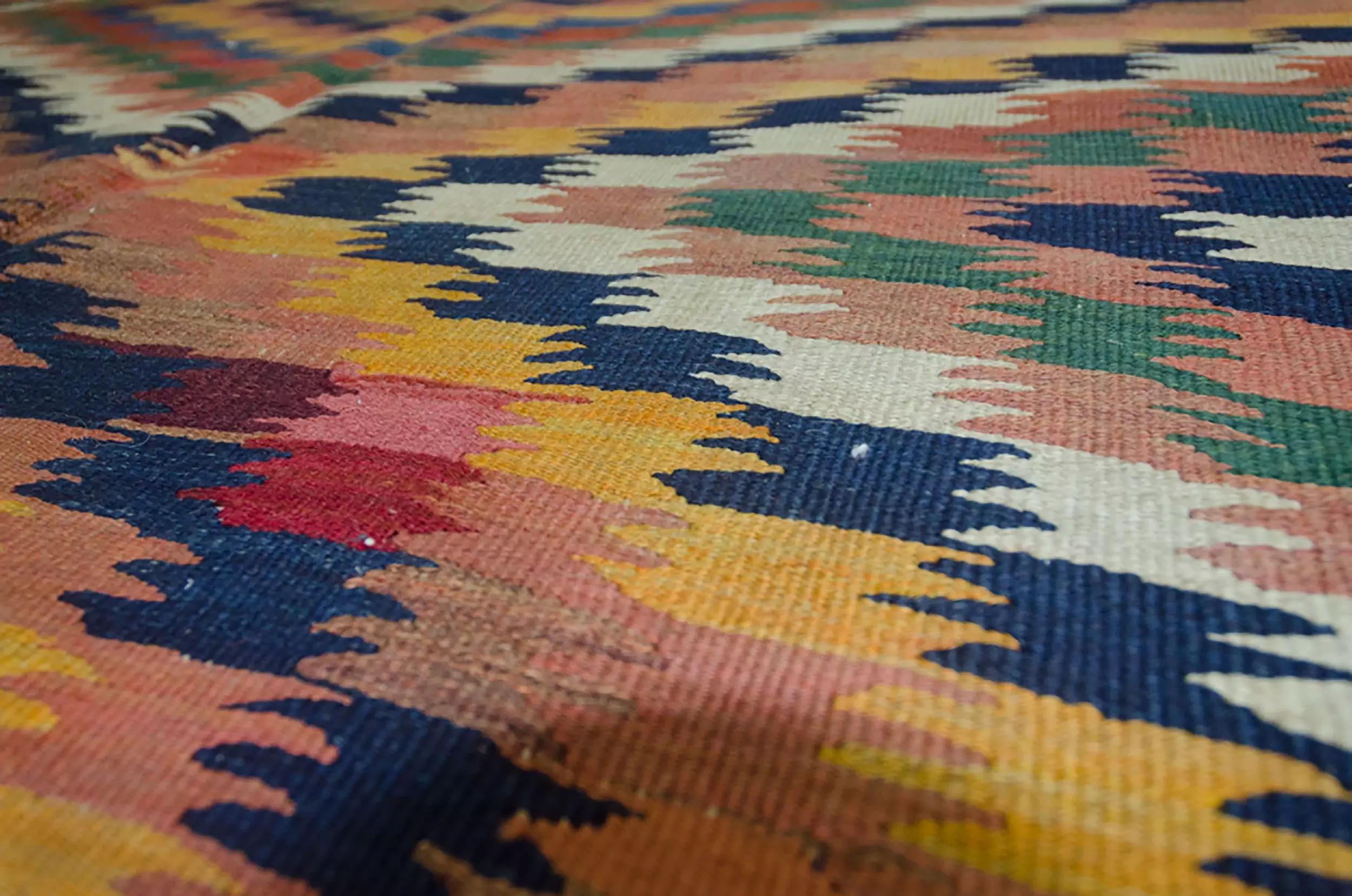 Woven in the traditional eye dazzler design, the kilim features a lively interplay of blue, red, yellow, and green, resulting in a bold, rhythmic composition that commands attention. The clarity and brightness of the colours are a testament to the use of natural dyes and high-grade handspun wool, while the balanced repetition of geometric motifs speaks to the weaver’s skill and precision.