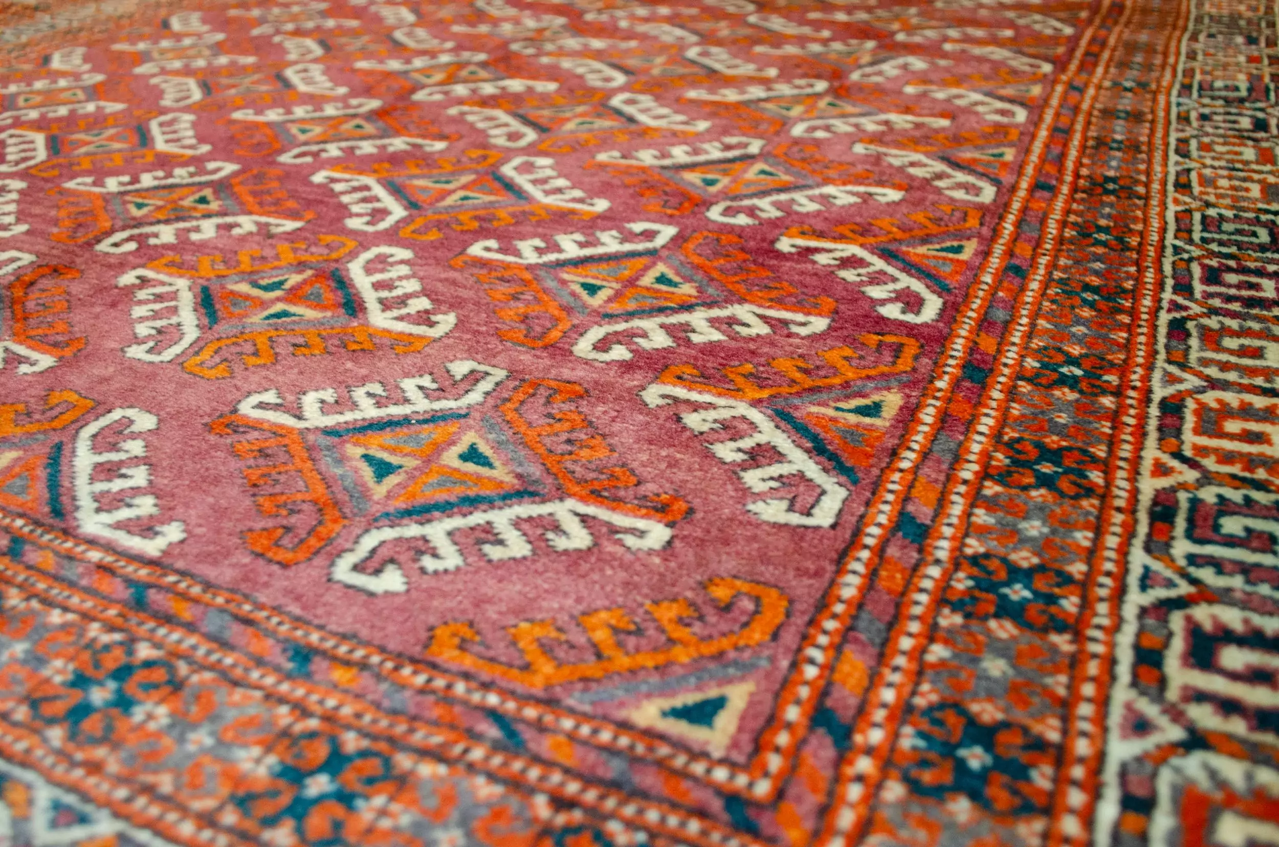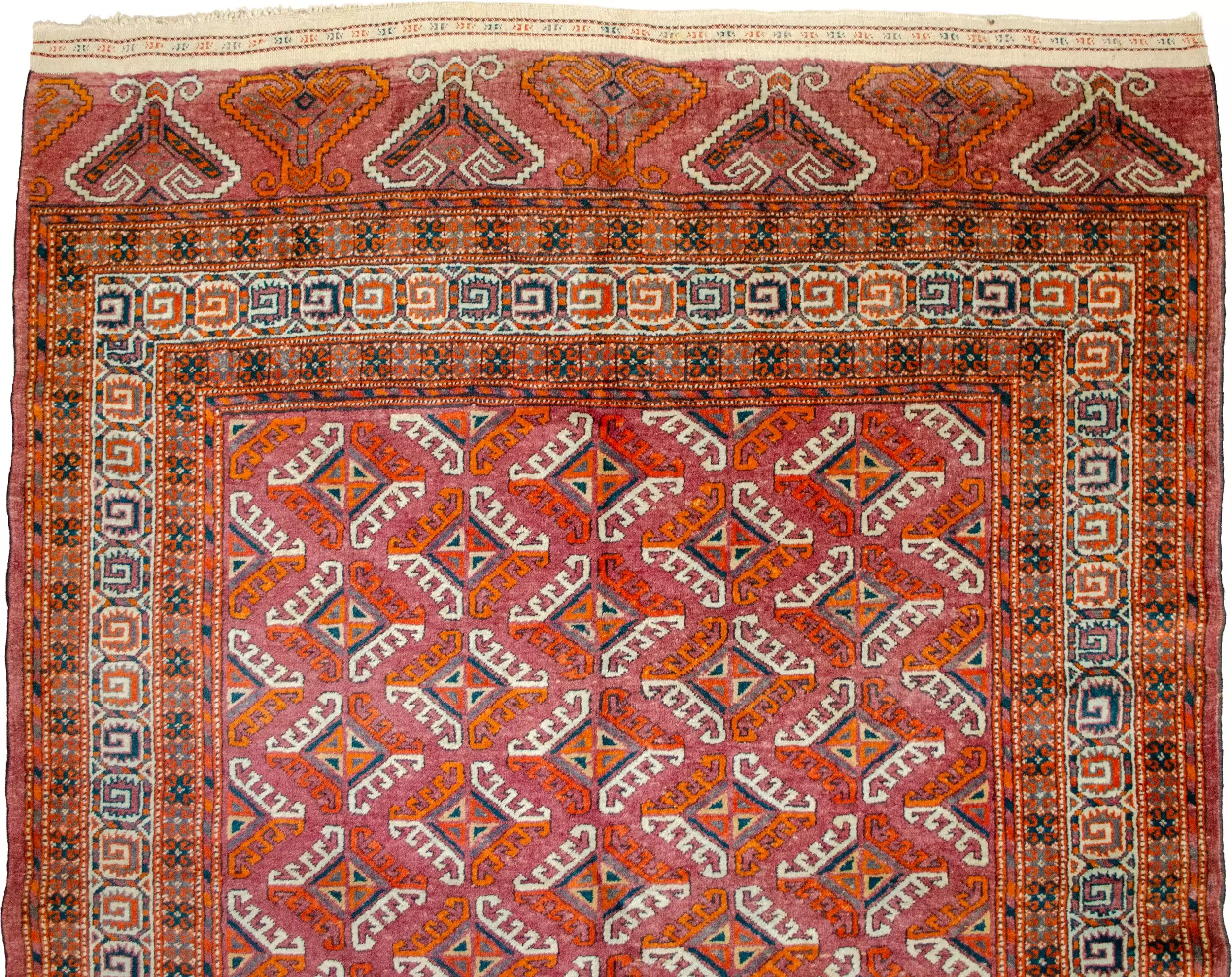 This Turkmen Yomut (Yamout) rug is a fascinating example of nomadic symbolism and sophisticated color theory. Standing out from the typical deep mahoganies of the region, this piece features an unusual mauvish red ground, a rare and hauntingly beautiful shade that gives the rug a unique presence in any light.