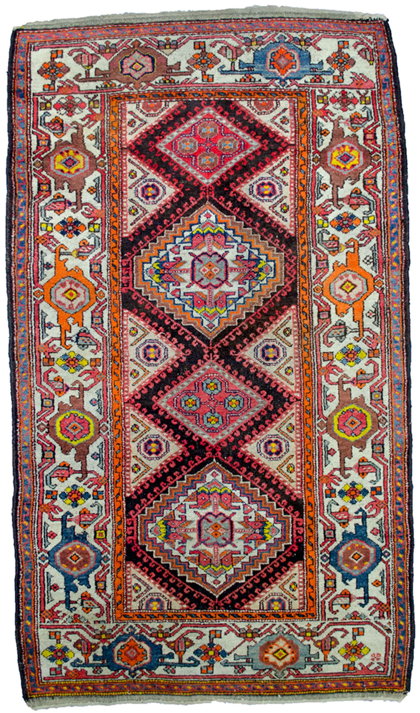 The standout feature of this rug is its cream geometric border, which frames the entire composition with strength and refinement. Subtle abrash (natural shade variations) within the border adds to its authentic charm, reflecting the organic dyeing methods used by master artisans.