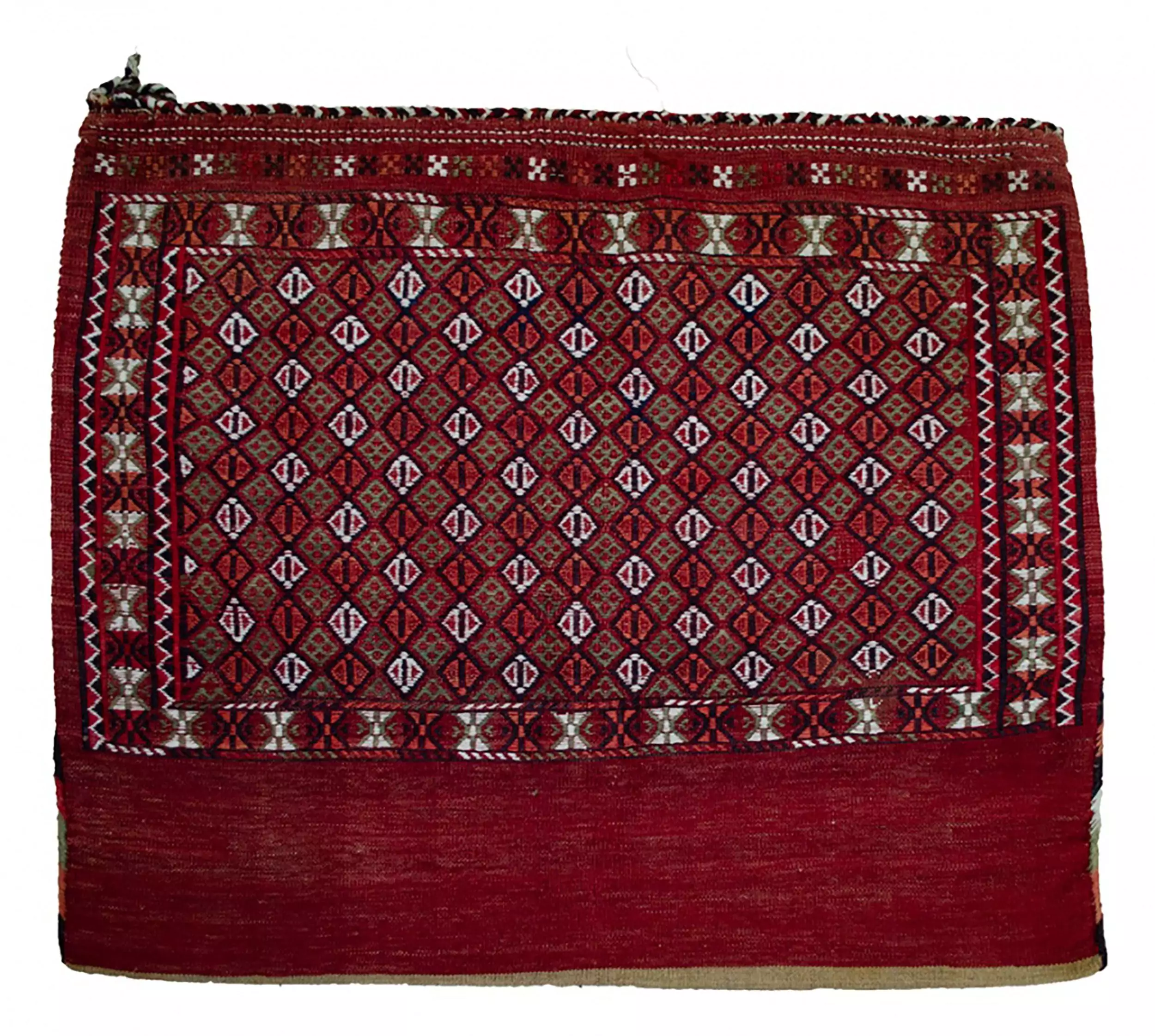 Traditionally used by Turkman nomads for storing and transporting essentials, Tobreh bags like this one combine functionality with artistic expression. The motifs are not just decorative; they reflect the cultural identity and storytelling heritage of the weaver.