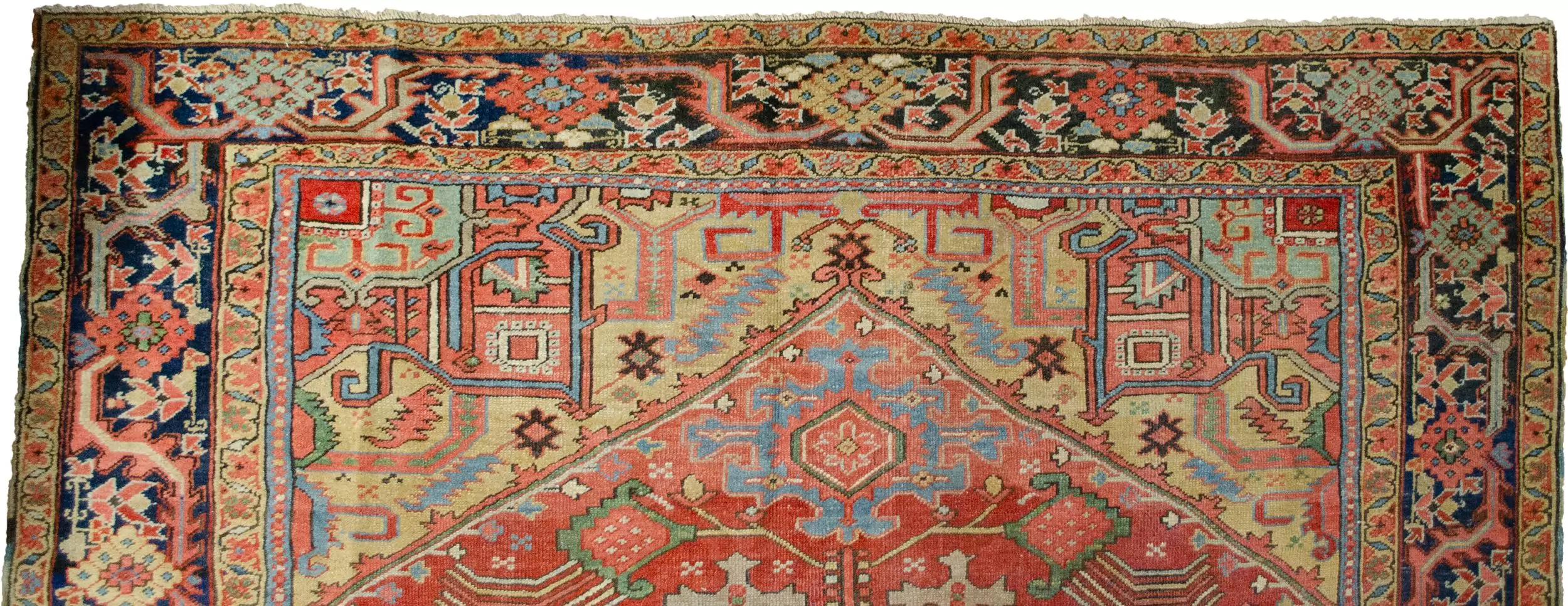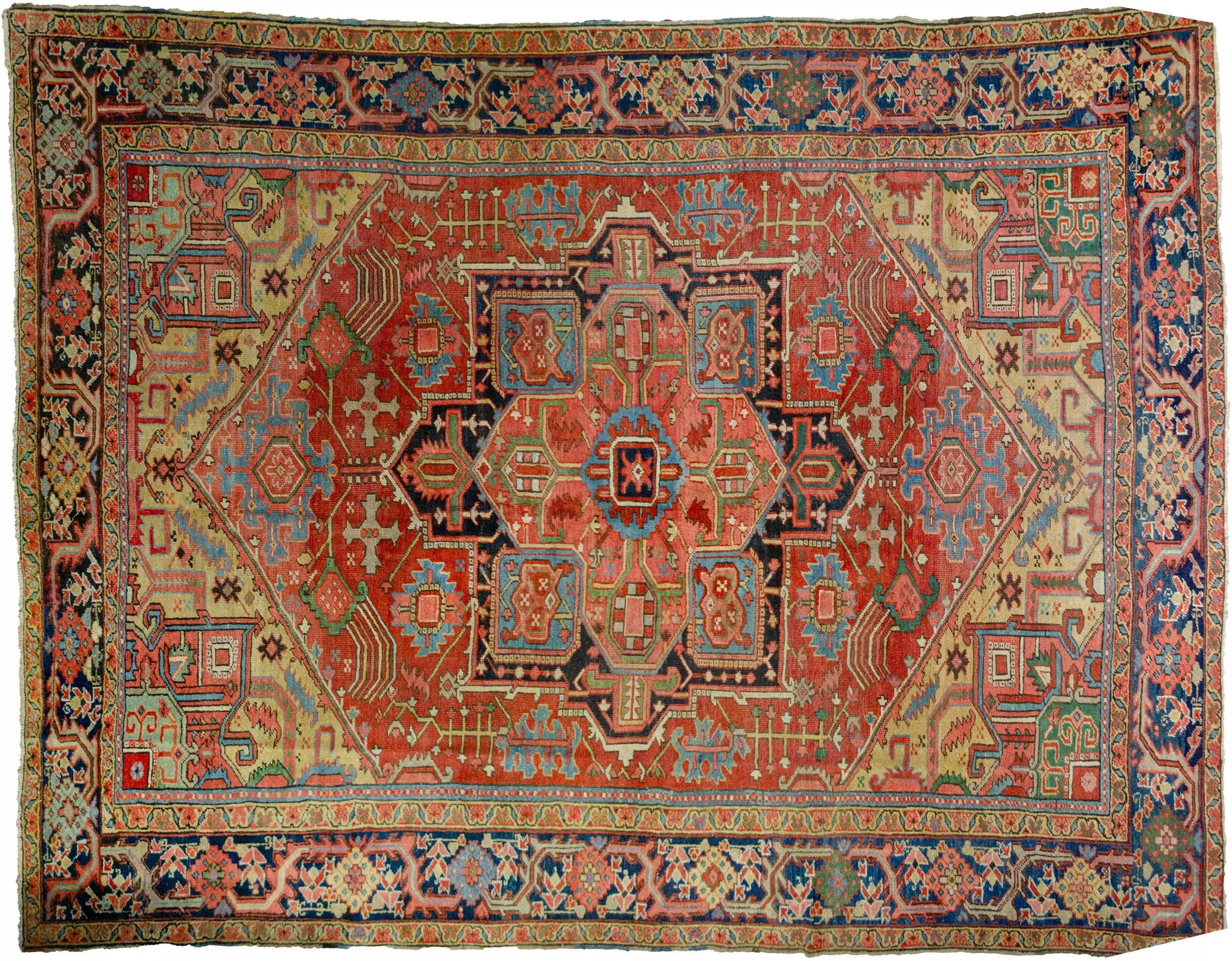 Design: Large red medallion, floral motifs, multicolored branches, blue leaves