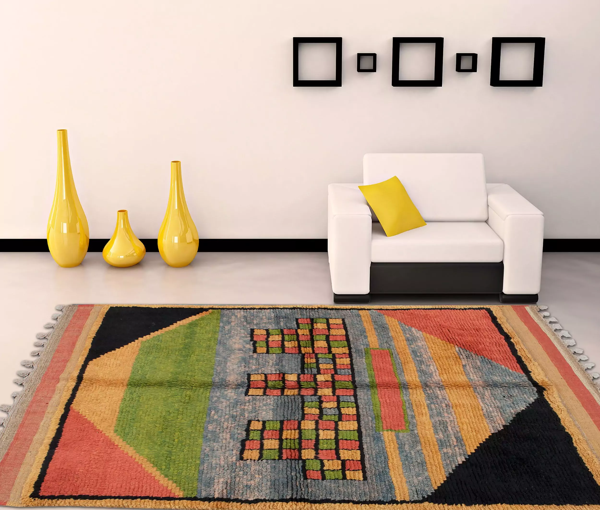 A handmade Bakhtiari Gabbeh rug with a soft shaggy texture, natural dyes, and expressive tribal design. A warm, character-rich statement piece for relaxed living spaces.