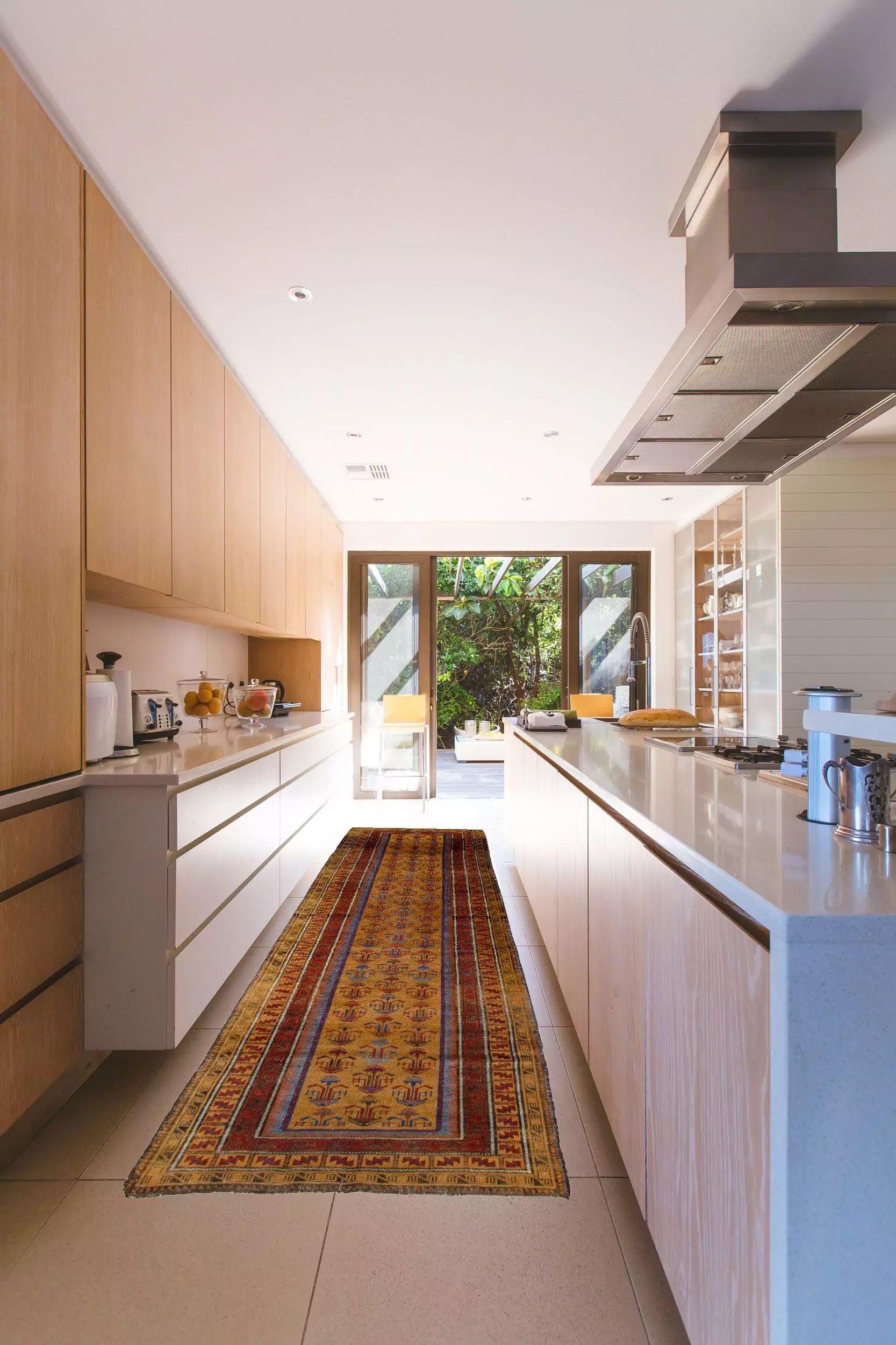The most distinctive feature of this runner is its rare gold field. Warm and luminous, this tone is seldom seen in Baluch rugs and brings a gentle sense of richness without feeling decorative or overpowering. Scattered across the field are delicate flower pot motifs, each carefully balanced and thoughtfully spaced. These motifs traditionally symbolise growth, abundance, and domestic harmony, adding a layer of meaning alongside visual charm.