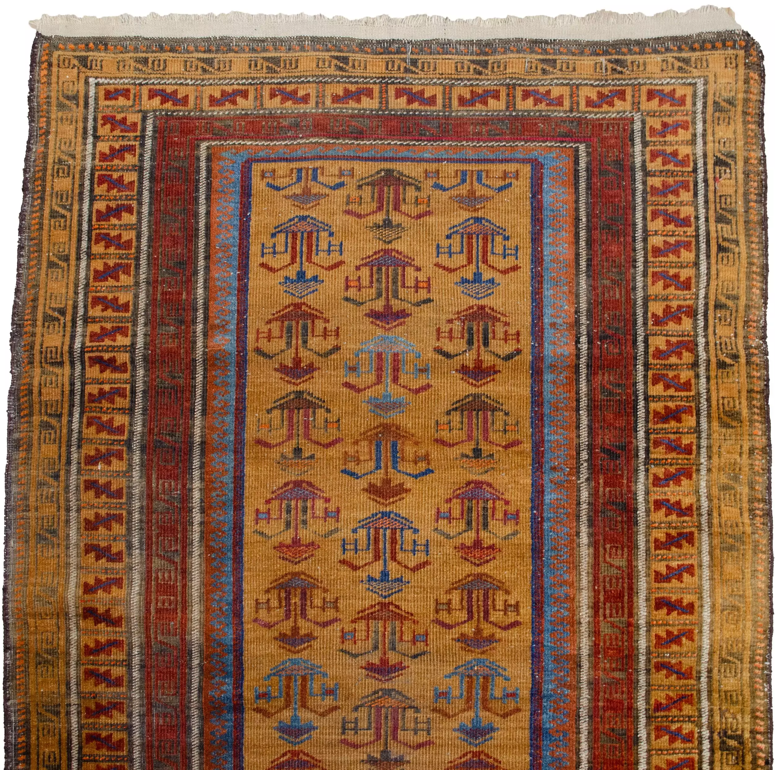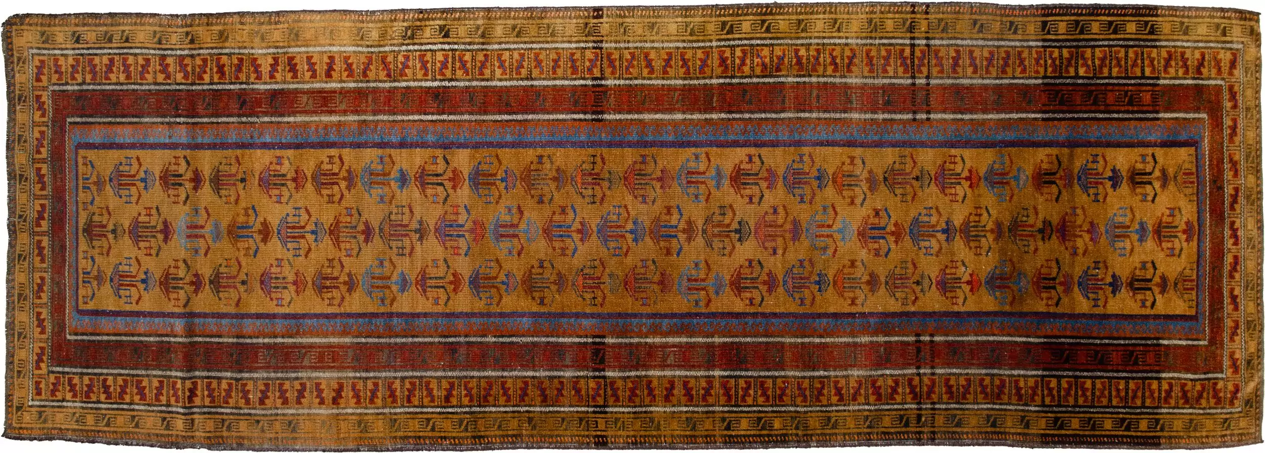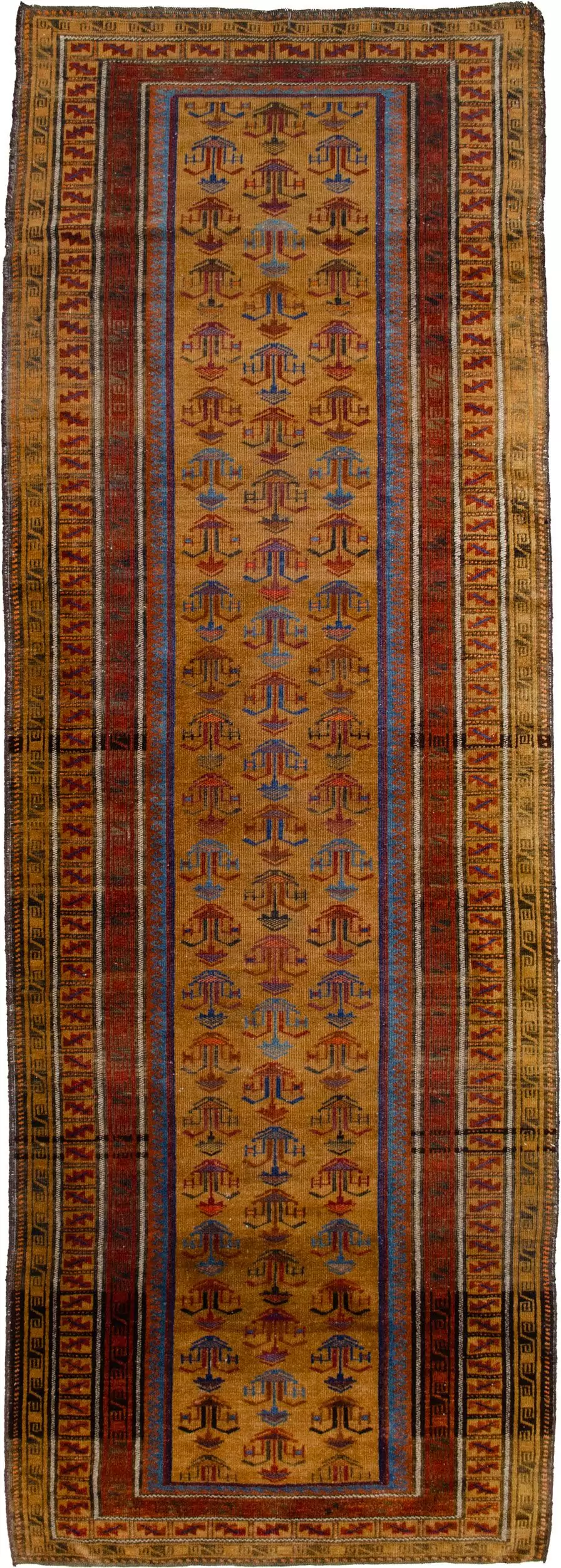 An antique Baluch runner with a rare gold field and delicate flower pot motifs. A soft, handwoven wool piece ideal for hallways and narrow spaces.