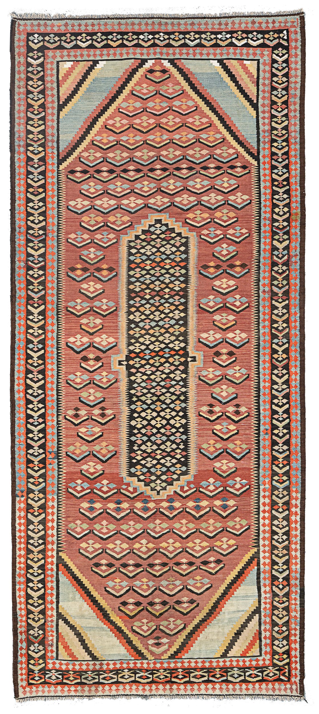 This rare antique Bijar kilim is a masterful example of Persian flatweave artistry, showcasing the rich textile heritage of the Bijar region in northwest Iran. Renowned for their durability and bold design, Bijar kilims are prized by collectors—and this particular piece is no exception.