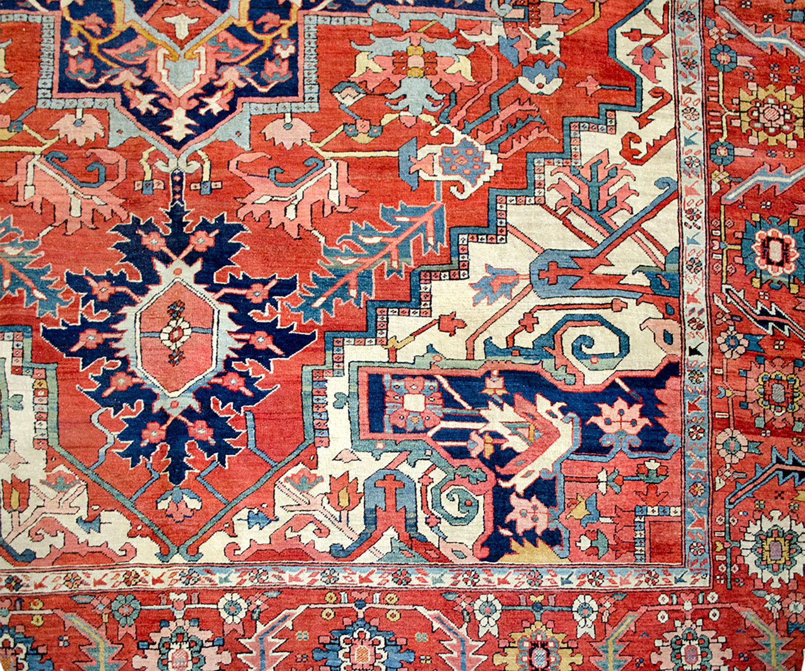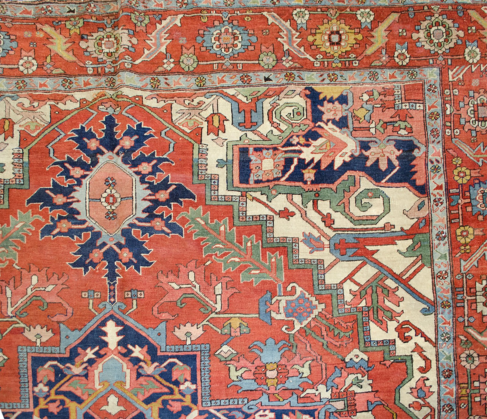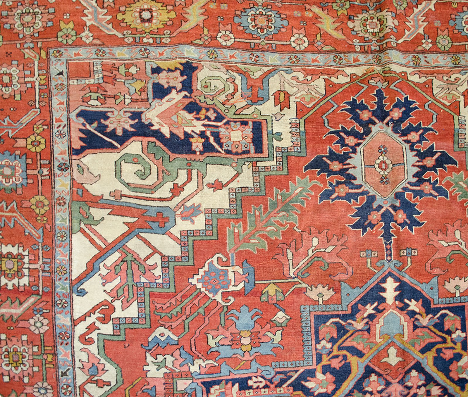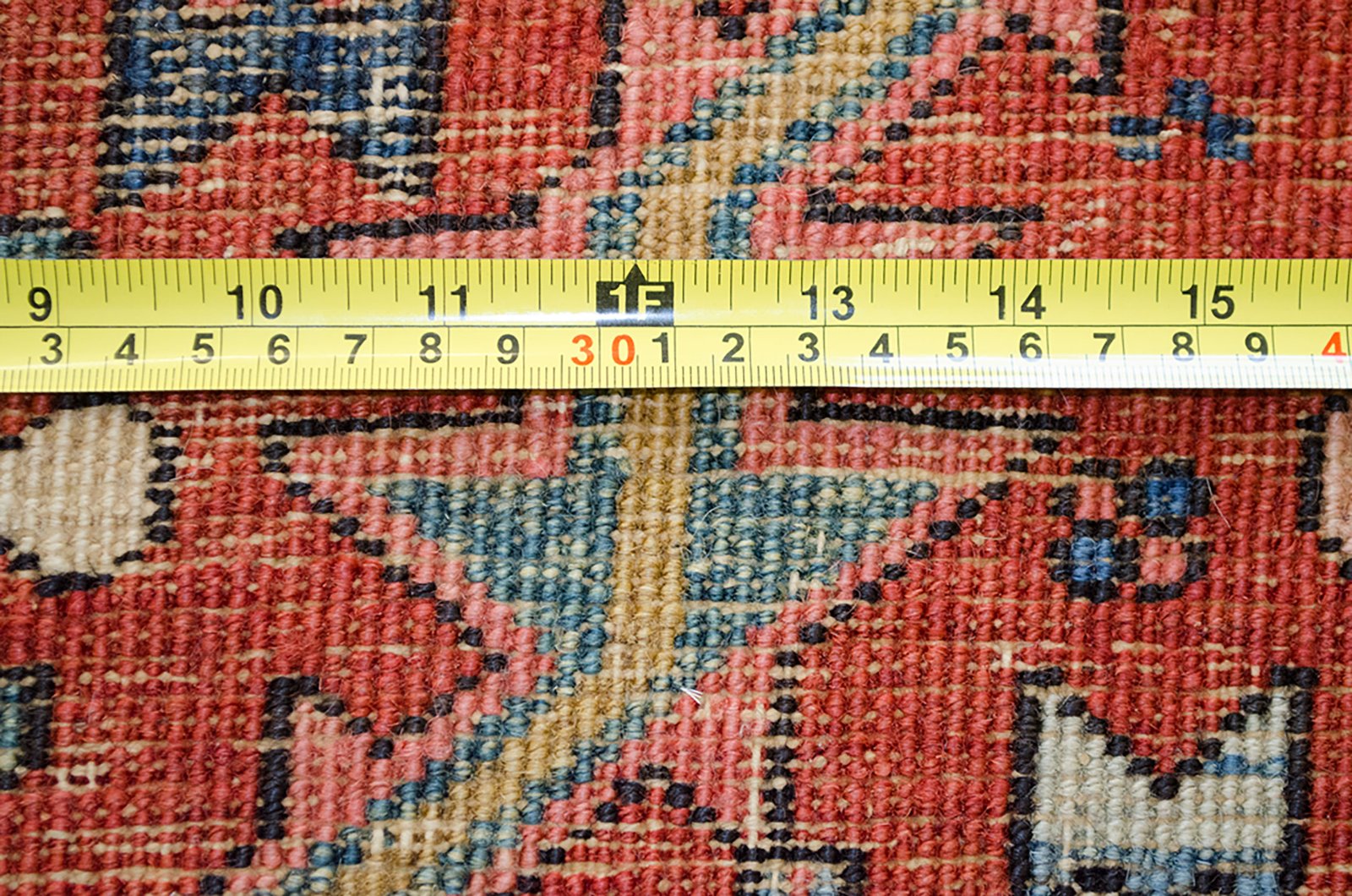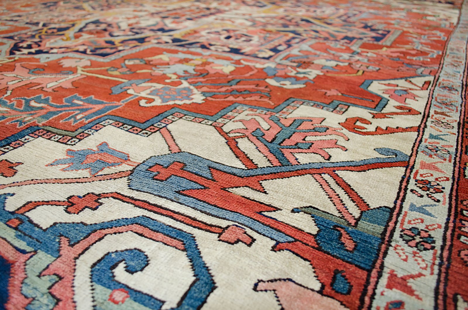 The weaving is tight and refined, typical of Serapi carpets, which distinguishes them from their Heriz counterparts. This level of detail and craftsmanship, combined with the natural dyes and handspun wool, results in a richly coloured surface with depth, sheen, and lasting beauty.