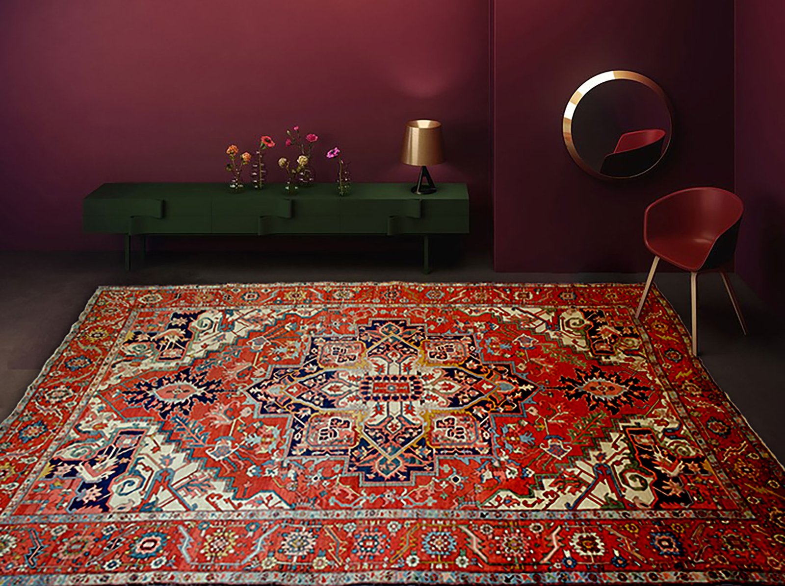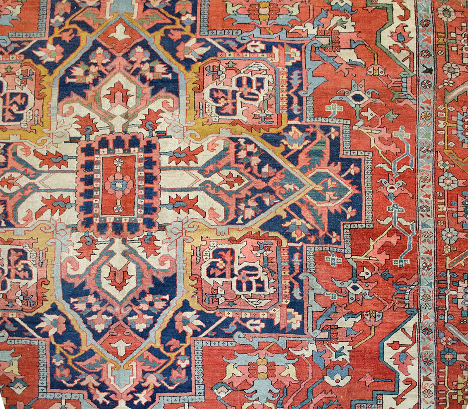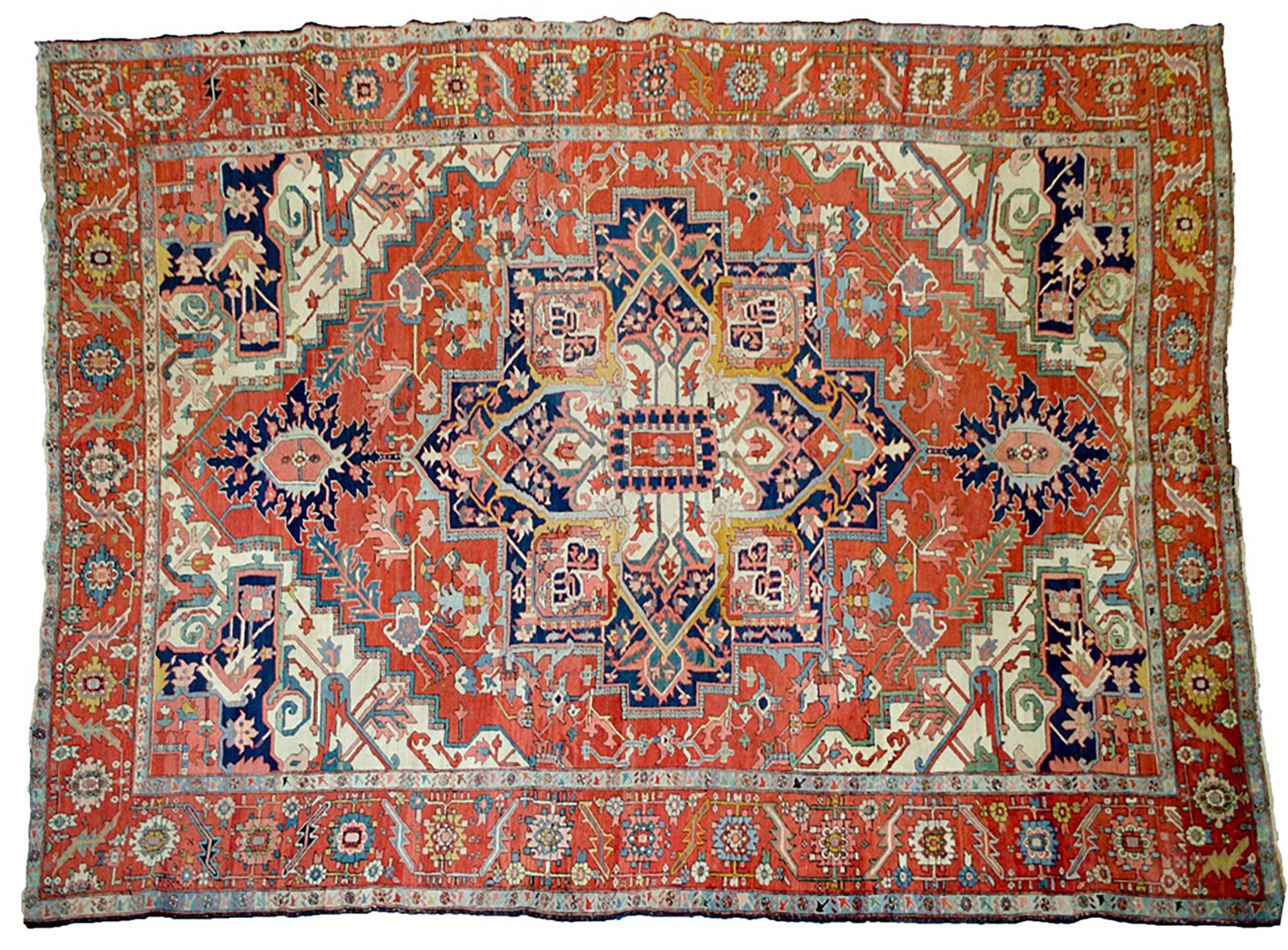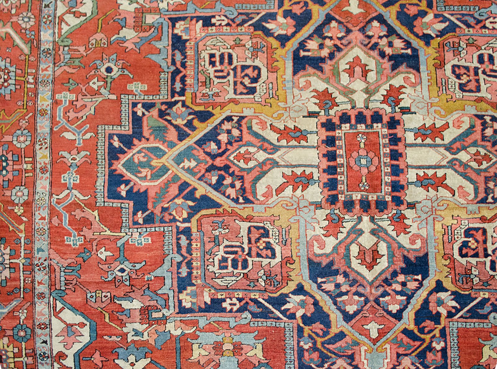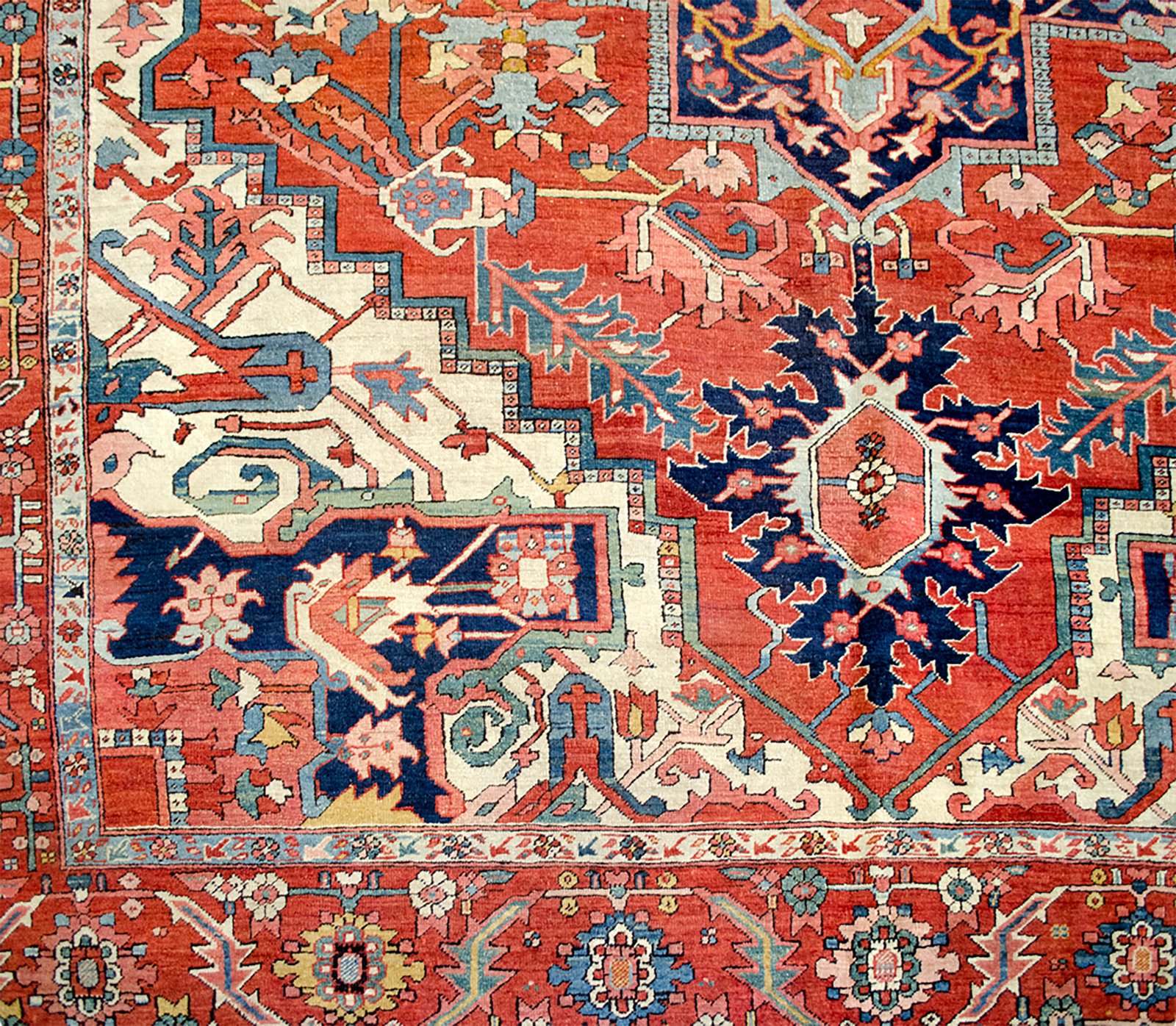 The weaving is tight and refined, typical of Serapi carpets, which distinguishes them from their Heriz counterparts. This level of detail and craftsmanship, combined with the natural dyes and handspun wool, results in a richly coloured surface with depth, sheen, and lasting beauty.