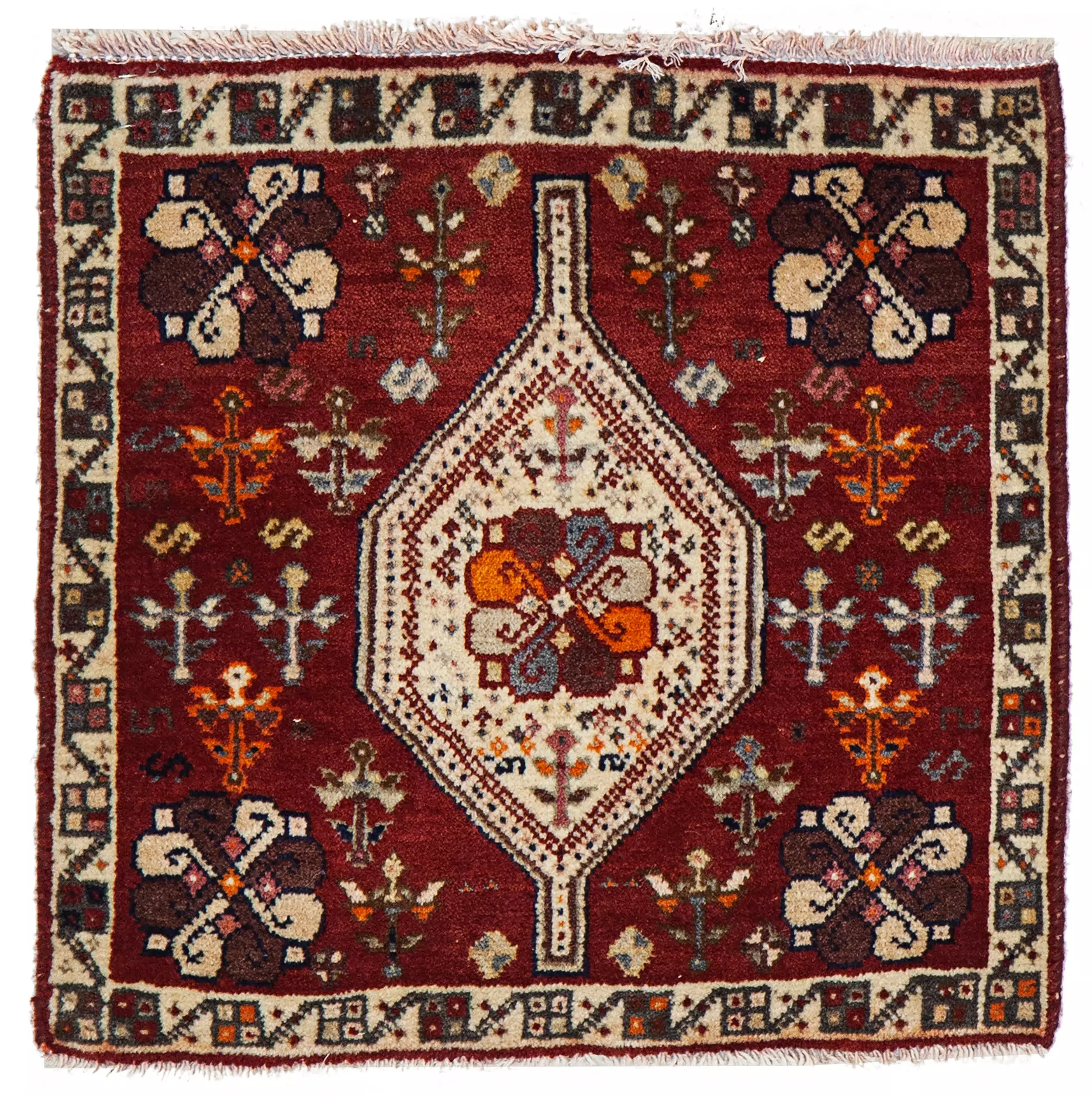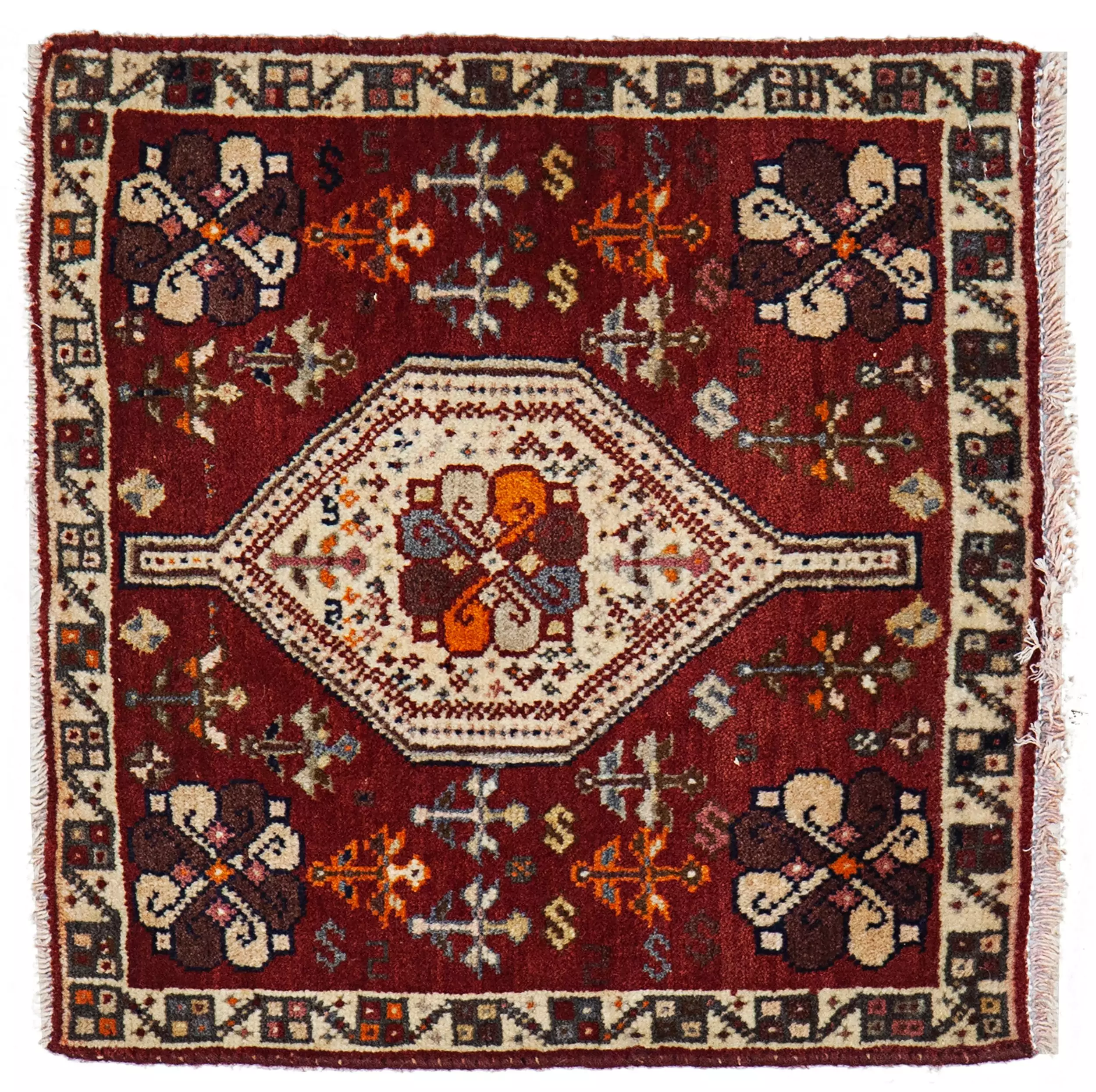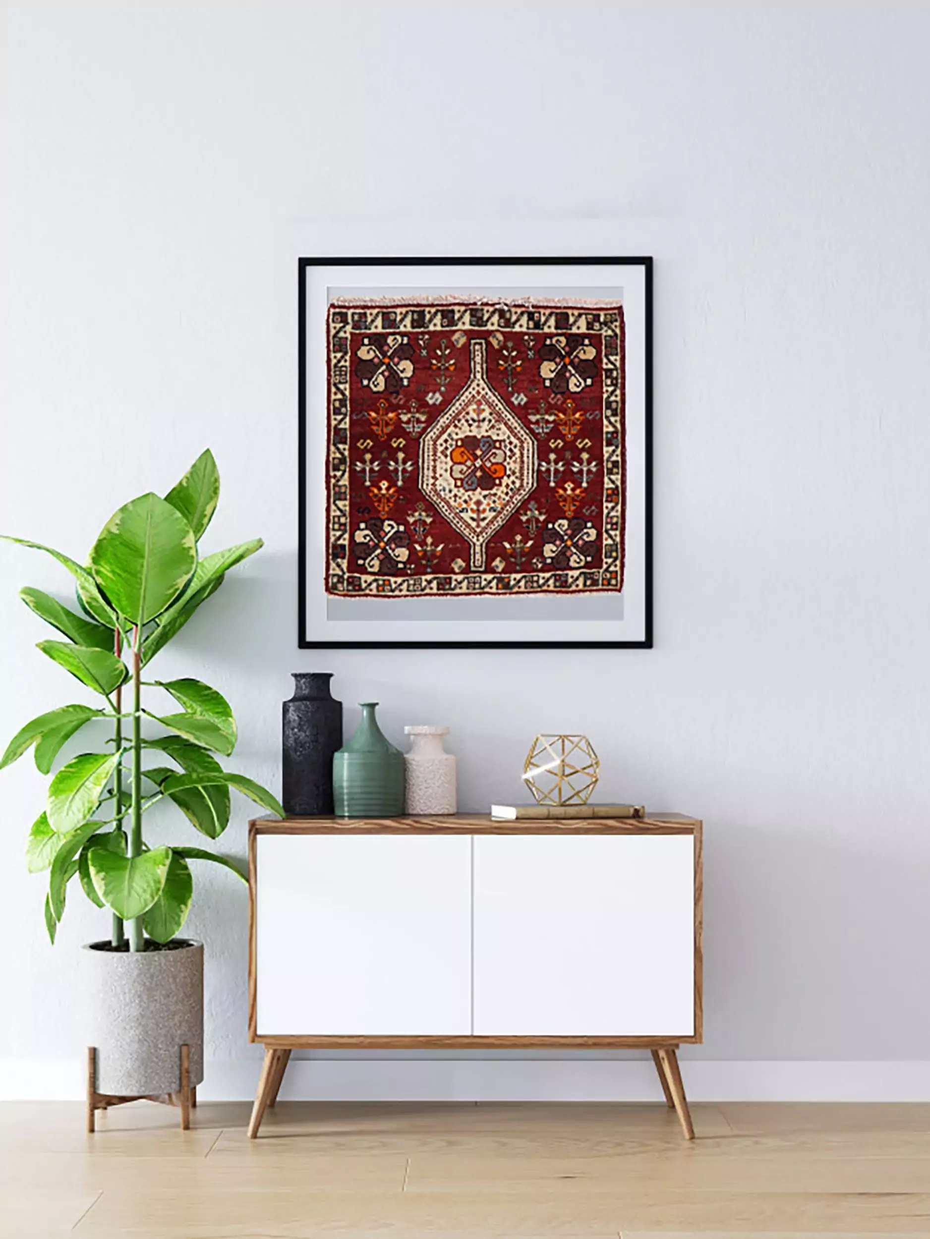 This charming little mat from Shiraz is a beautiful expression of tribal artistry in miniature format. Woven with soft, shiny wool and rich natural dyes, it offers both tactile appeal and vibrant colour—qualities that make Shiraz pieces so beloved among collectors and interior stylists alike.
