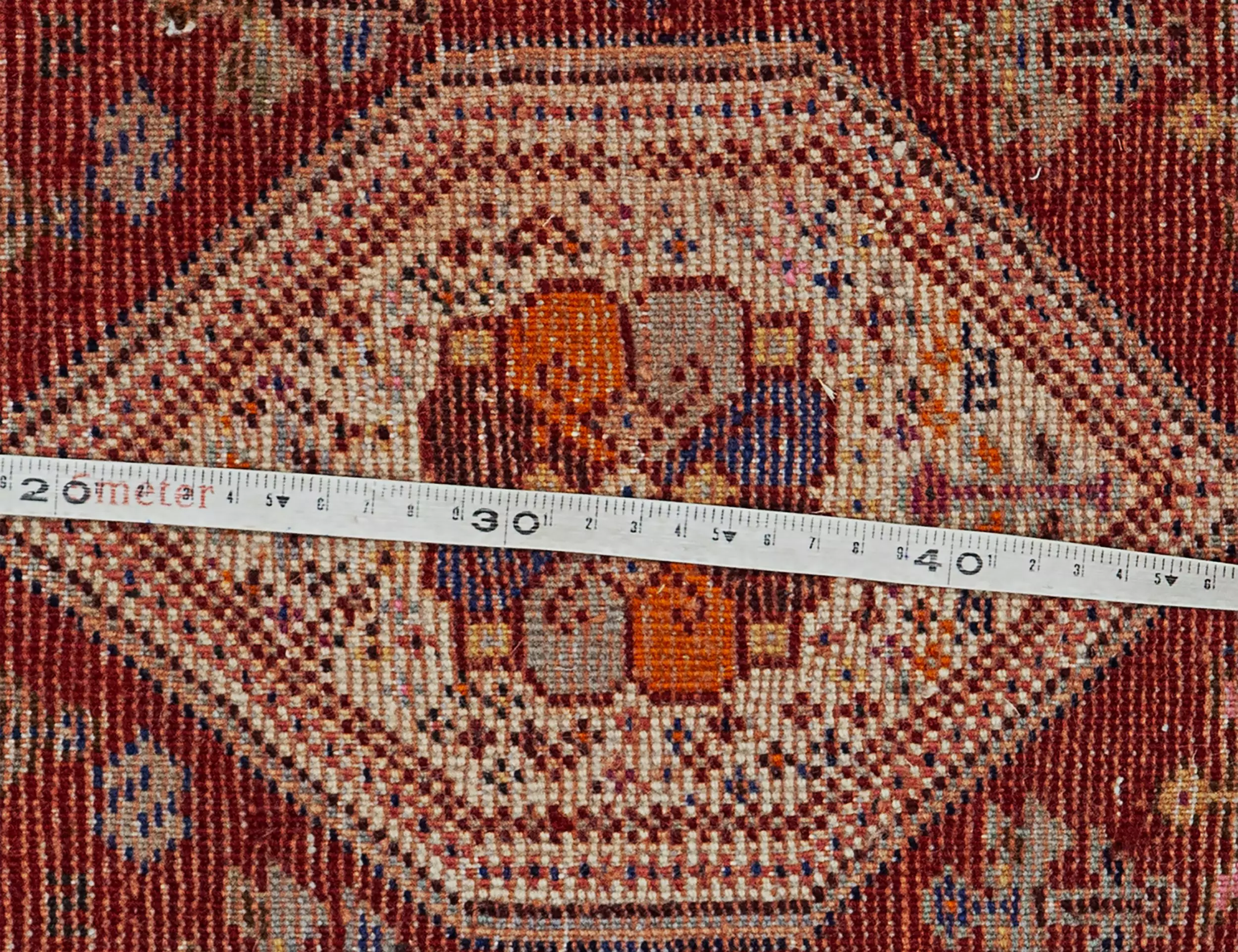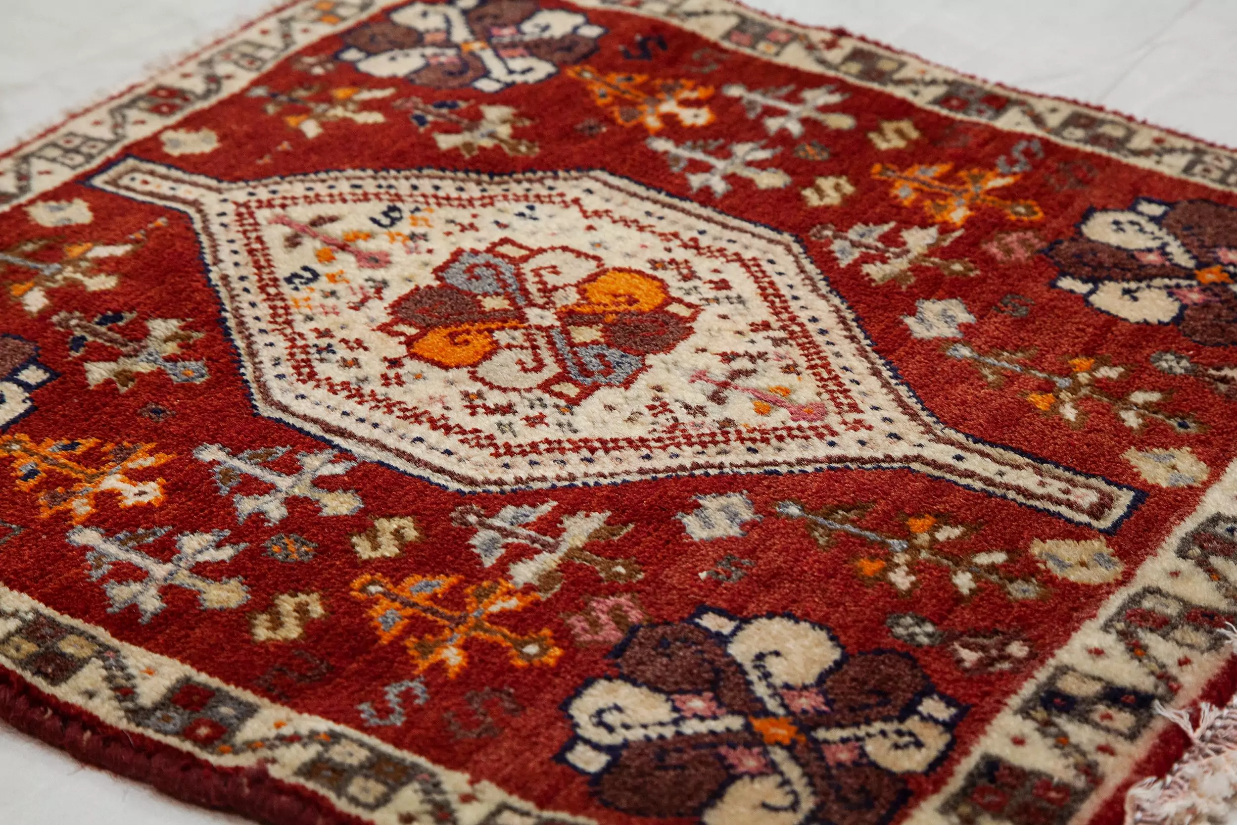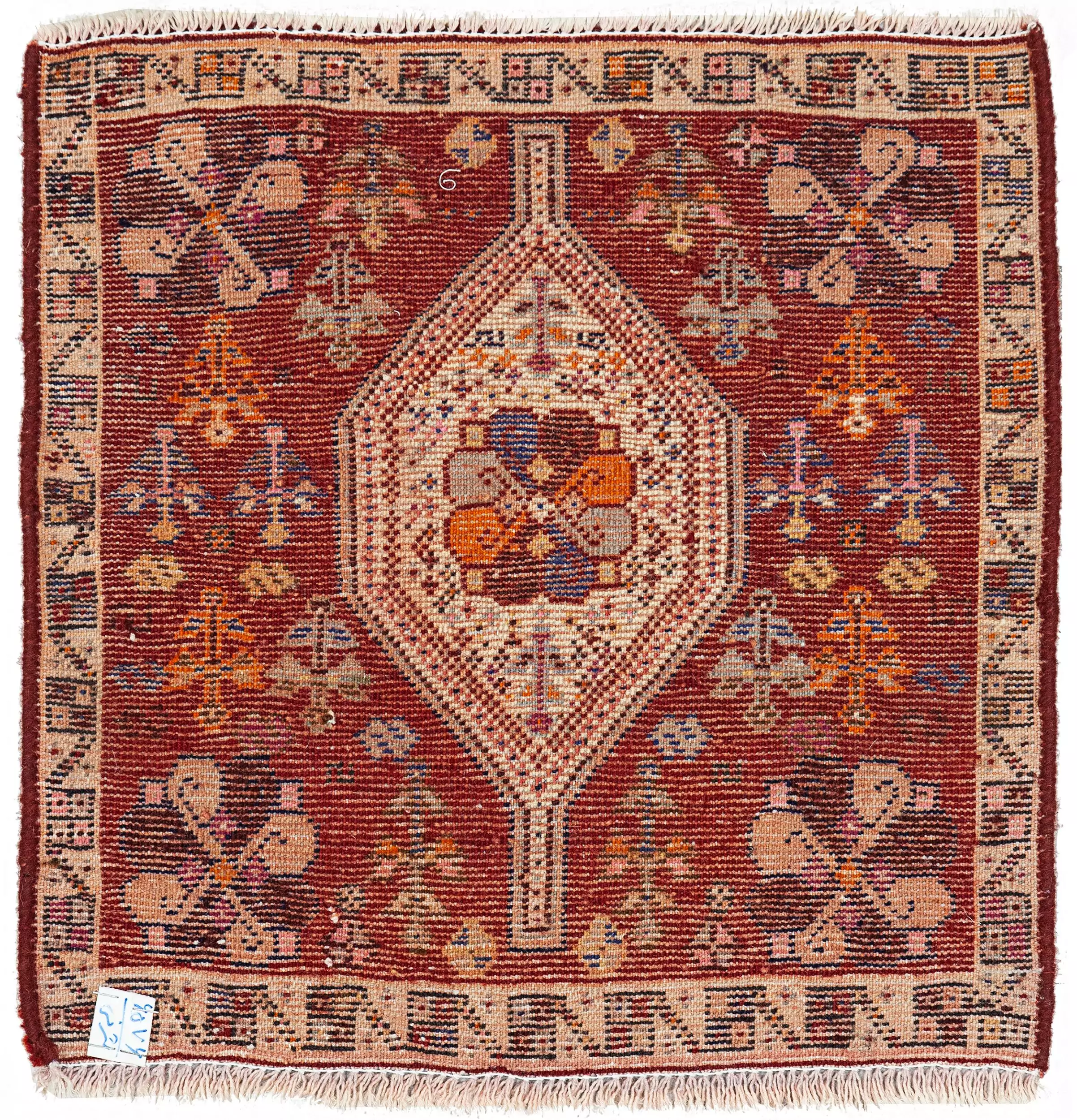 This charming little mat from Shiraz is a beautiful expression of tribal artistry in miniature format. Woven with soft, shiny wool and rich natural dyes, it offers both tactile appeal and vibrant colour—qualities that make Shiraz pieces so beloved among collectors and interior stylists alike.