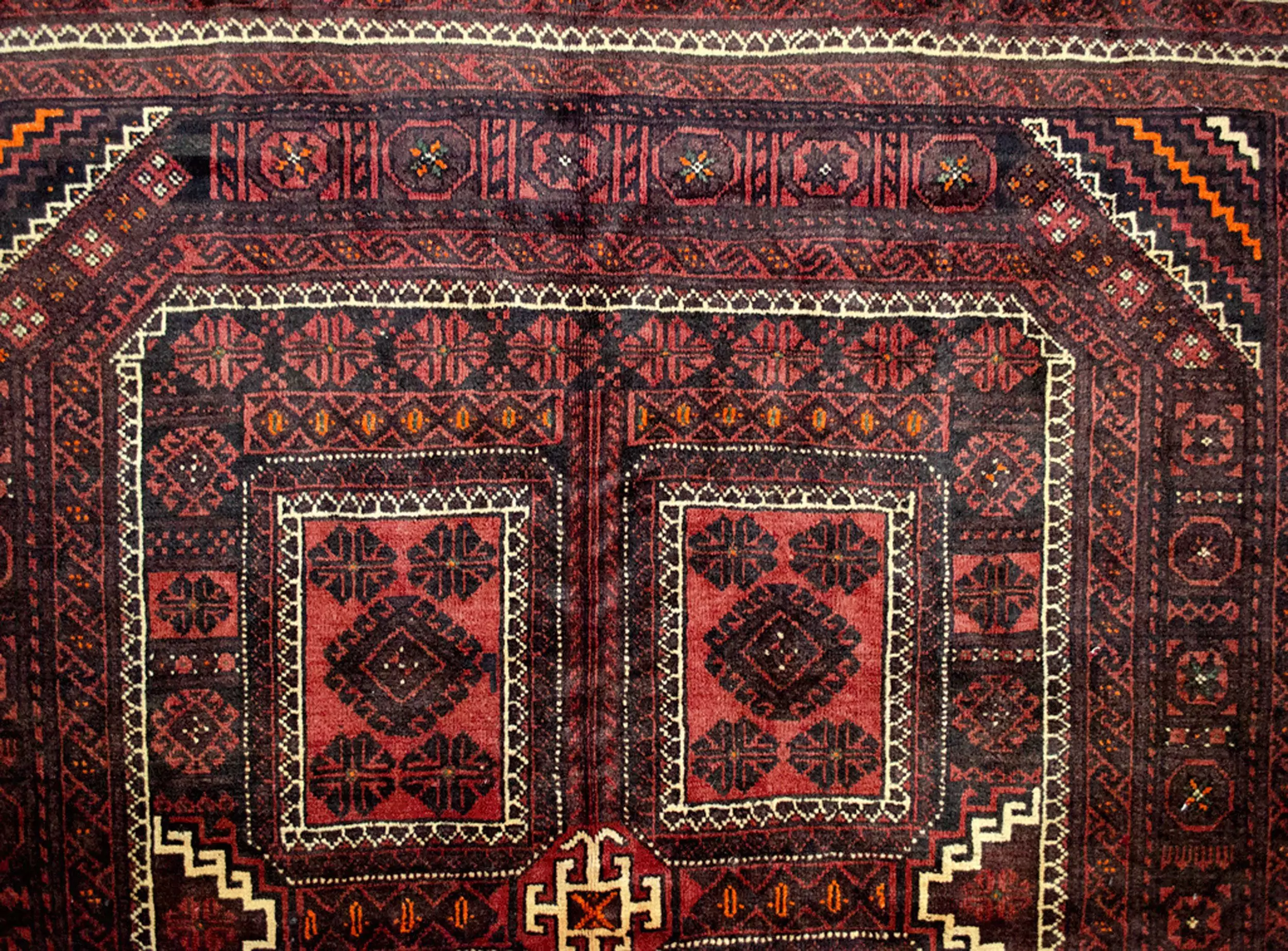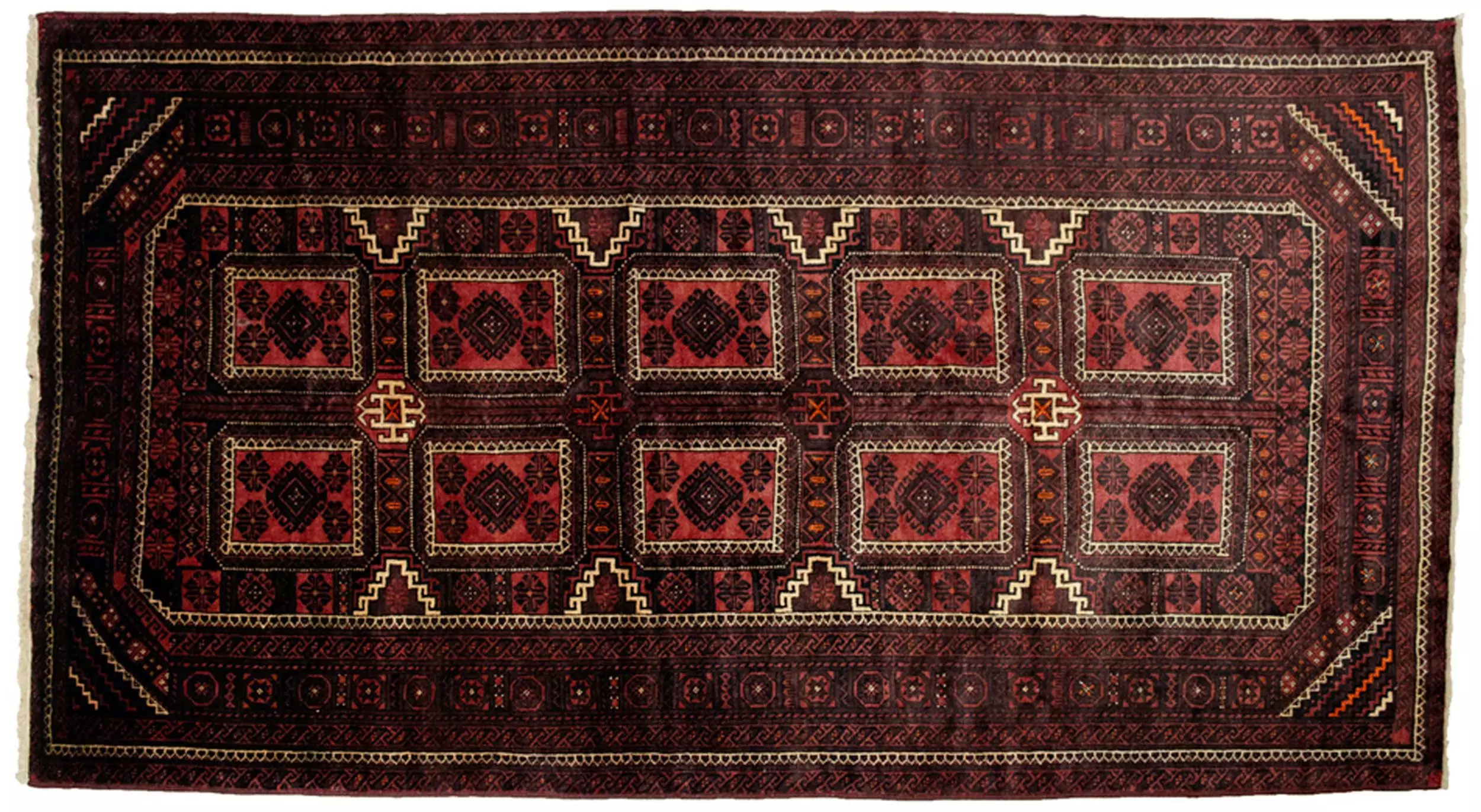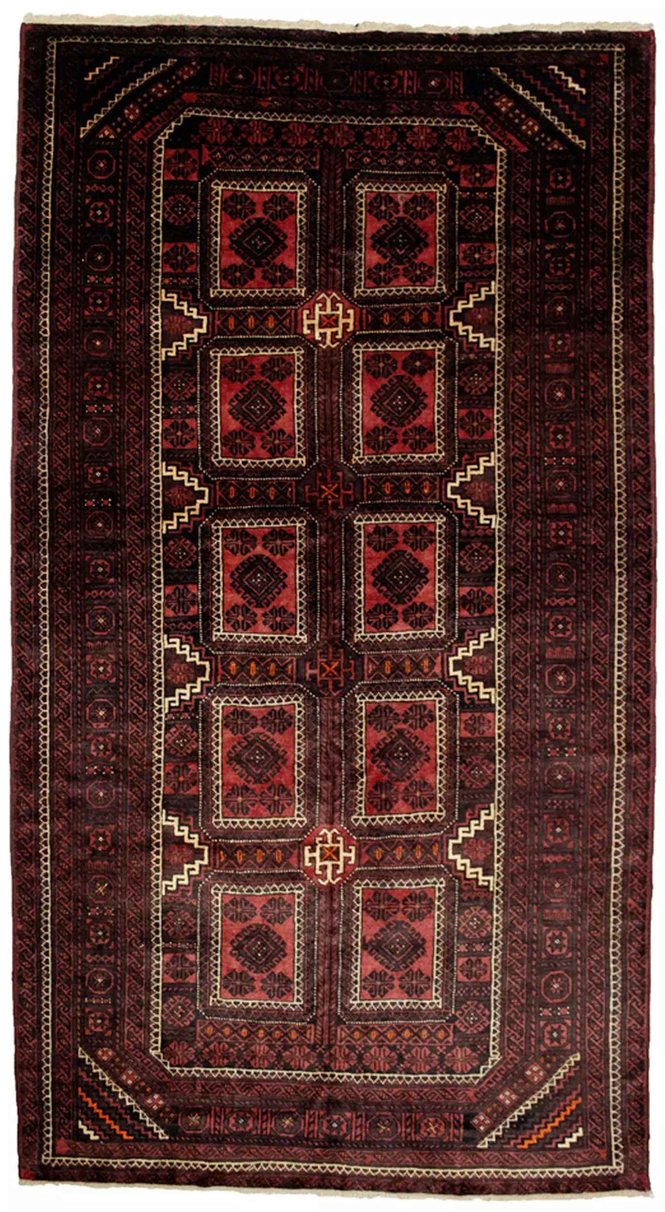 This charming vintage Baluch carpet from Northeast Iran is a beautiful example of tribal weaving with both visual appeal and cultural significance. At the heart of the design lie nine framed panels, each showcasing a bold lozenge motif, flanked by sets of eight stylised boteh patterns in every corner. These boteh clusters repeat across the field, enhancing the rhythm and tribal narrative of the piece.