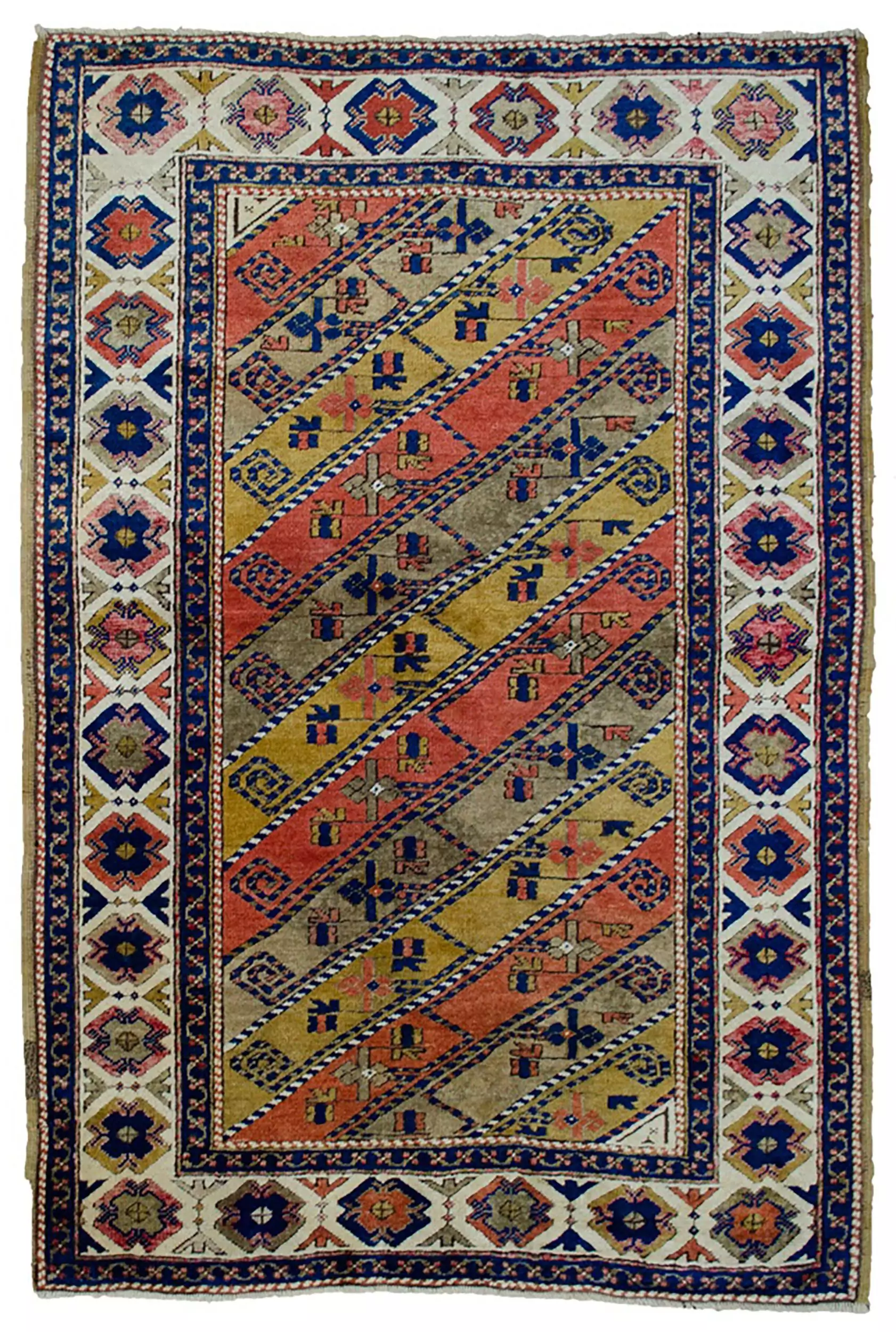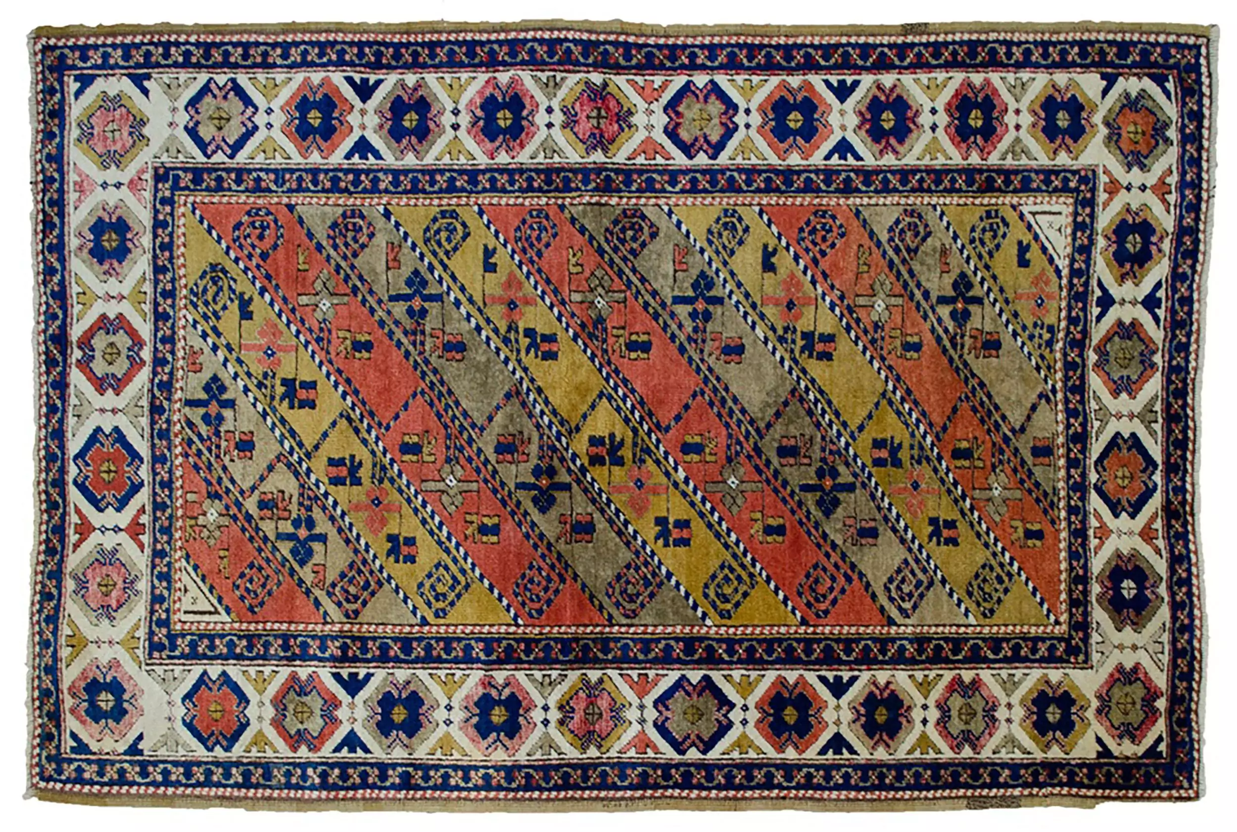 The ground is richly decorated with diagonally arranged bands in a multicoloured palette, each containing stylised floral and branching motifs that bring rhythm and vibrancy to the design. These dynamic diagonals lend a sense of movement while keeping the composition balanced and decorative.