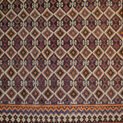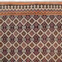 The kilim is designed with rows of multiple lozenges, each carefully placed to create a continuous visual flow. These are framed by a jagged border, a classic tribal motif that adds energy and framing to the composition. At each end, the kilim is completed with three plain character bands, offering a thoughtful and subtle contrast to the central pattern.