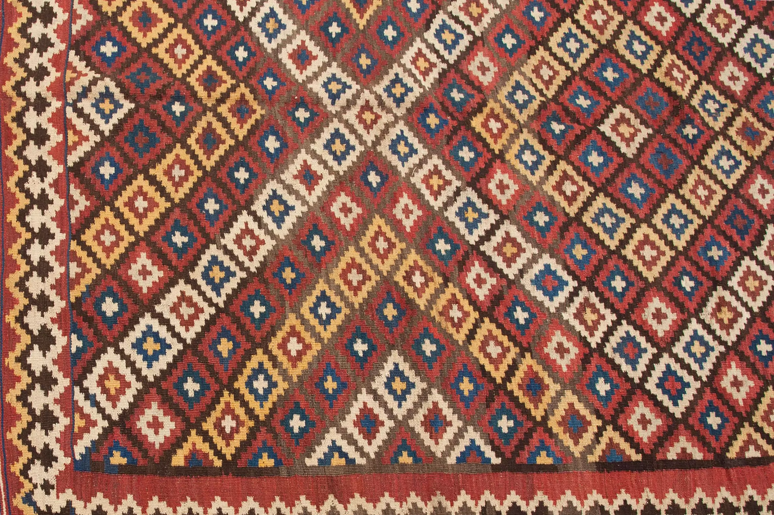 The surface is built around repeated diamond motifs that move steadily across the field, creating a sense of rhythm and order. These forms are framed by a bold geometric border that anchors the design and gives the piece visual clarity without feeling heavy. The cream ground softens the composition, while red and gold accents add depth and quiet richness.