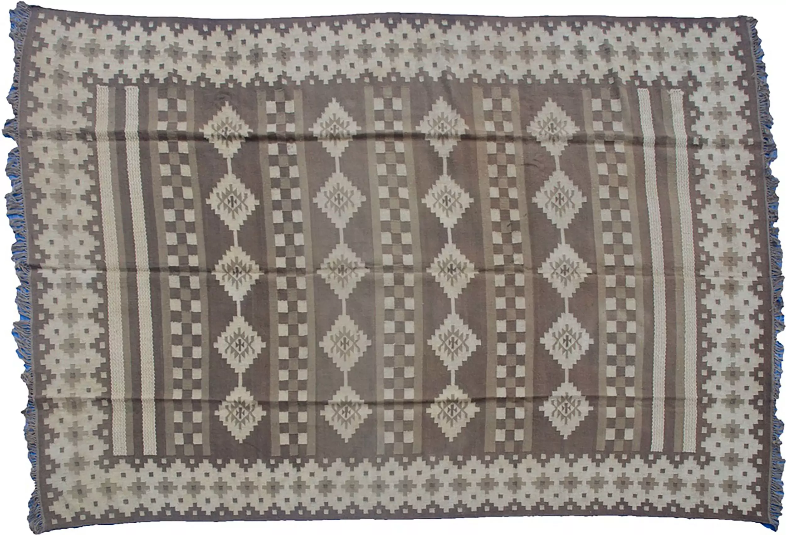 What sets this kilim apart is the rare weaving technique used at both ends. The two cream bands have been executed differently from the rest of the kilim — a highly unusual feature in Afghan weaving, making this rug not only beautiful but also distinctive and collectible.