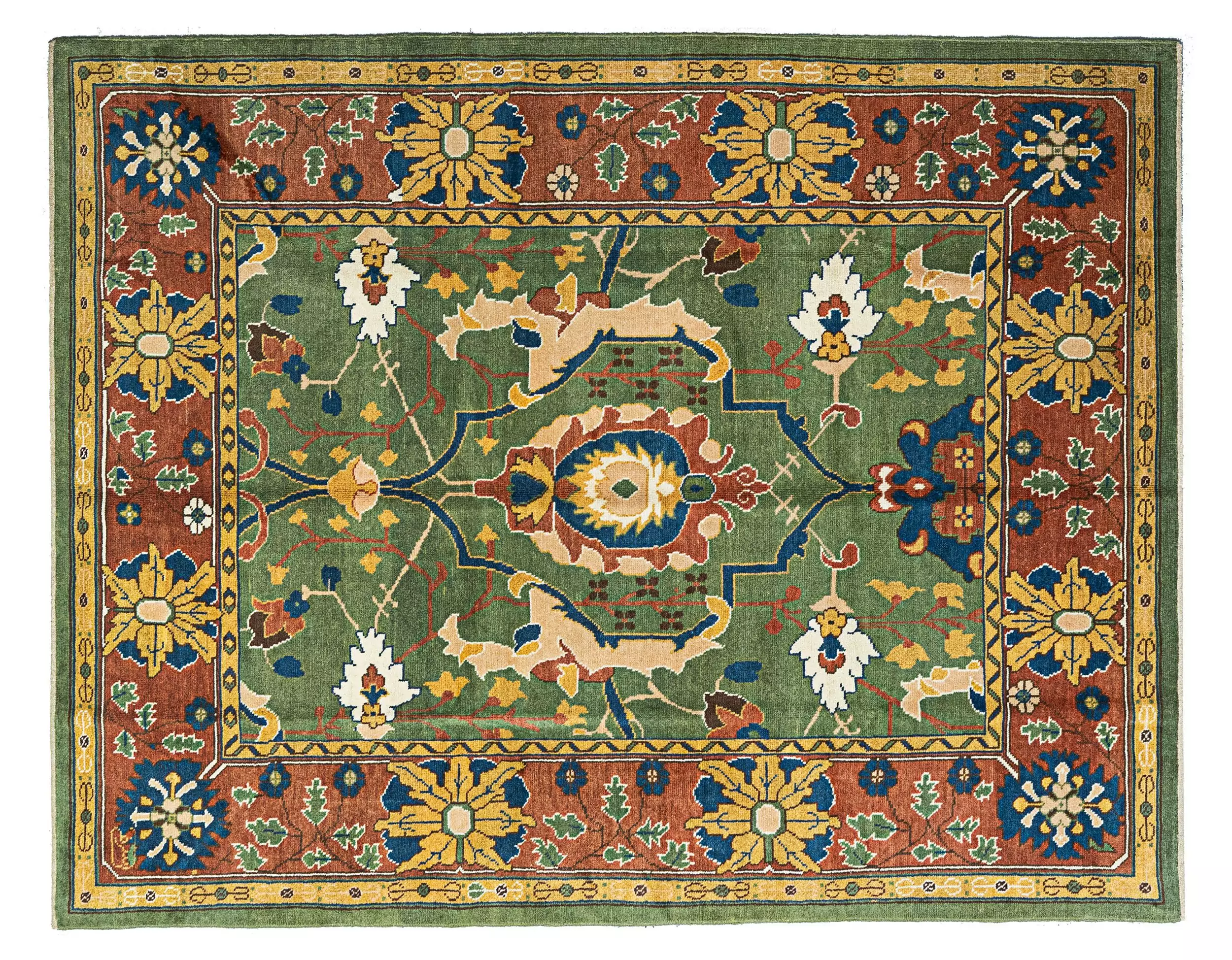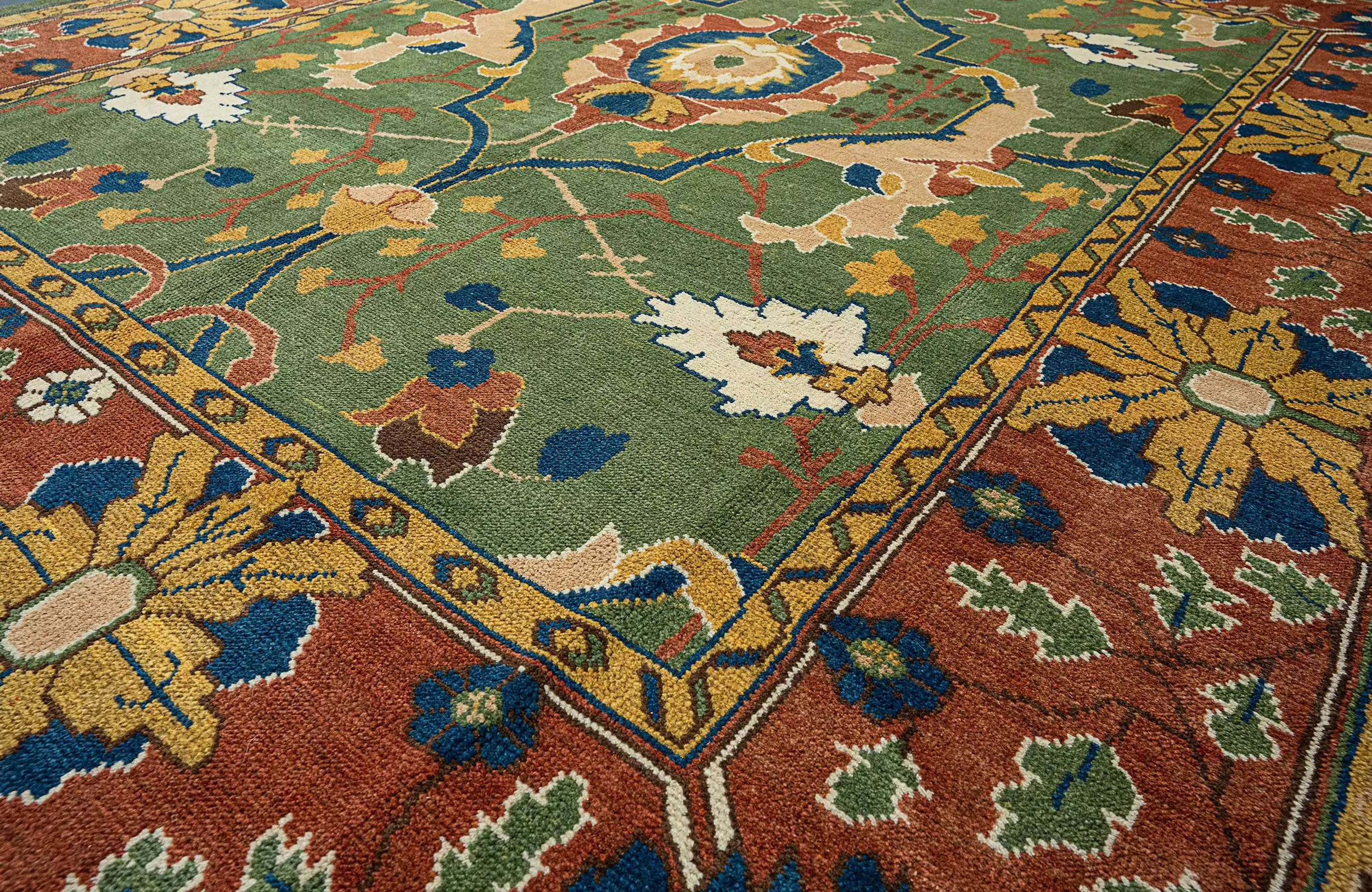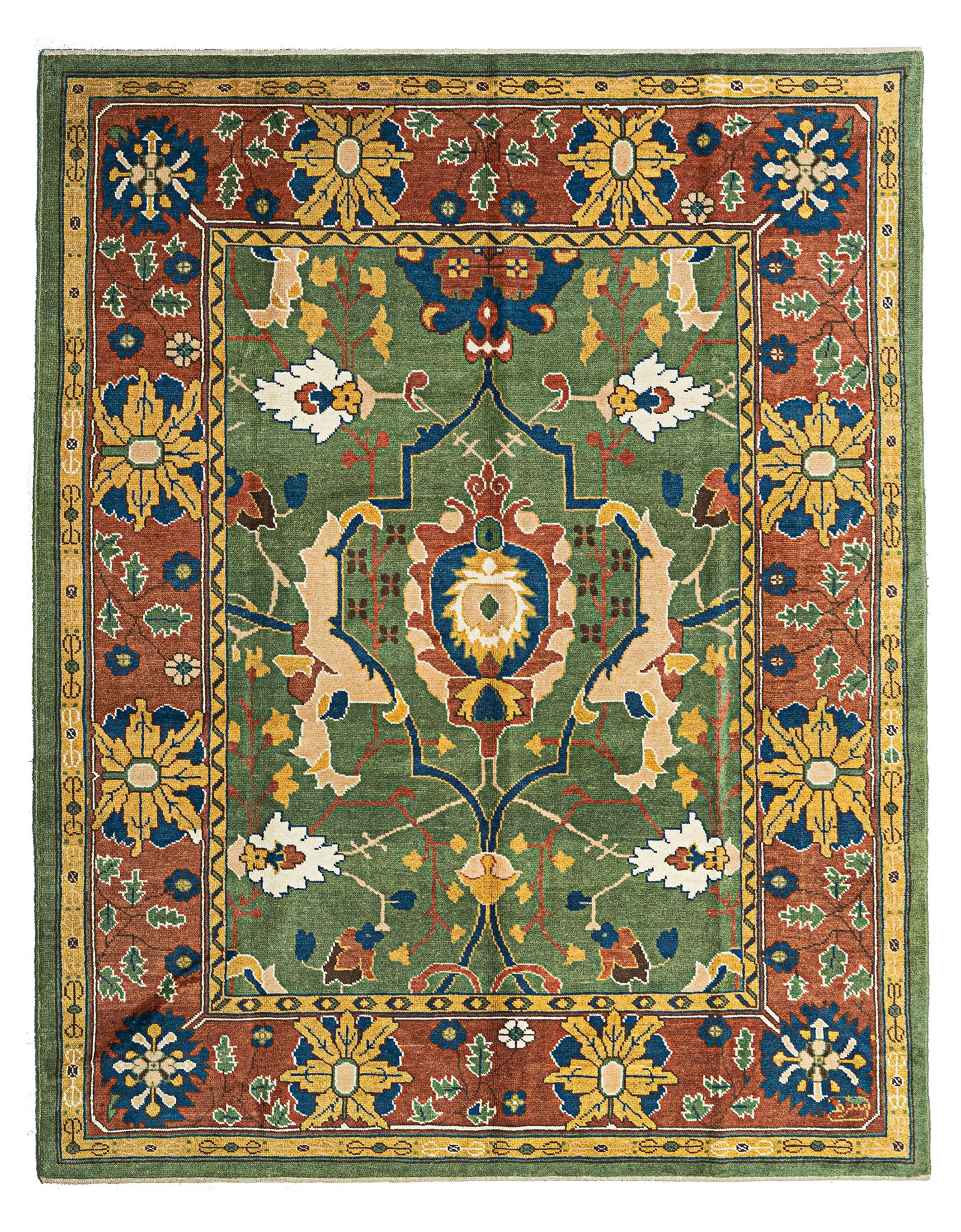 The carpet features a lush green background, acting as a serene and sophisticated canvas that’s brought to life with subtle abrash (color gradation) and depth. Atop this base bloom large, stylized floral heads, intricately woven and connected by flowing blue branches that introduce a dynamic rhythm to the piece. Each flower is carefully detailed, drawing the eye to the craftsmanship and visual balance of the design.