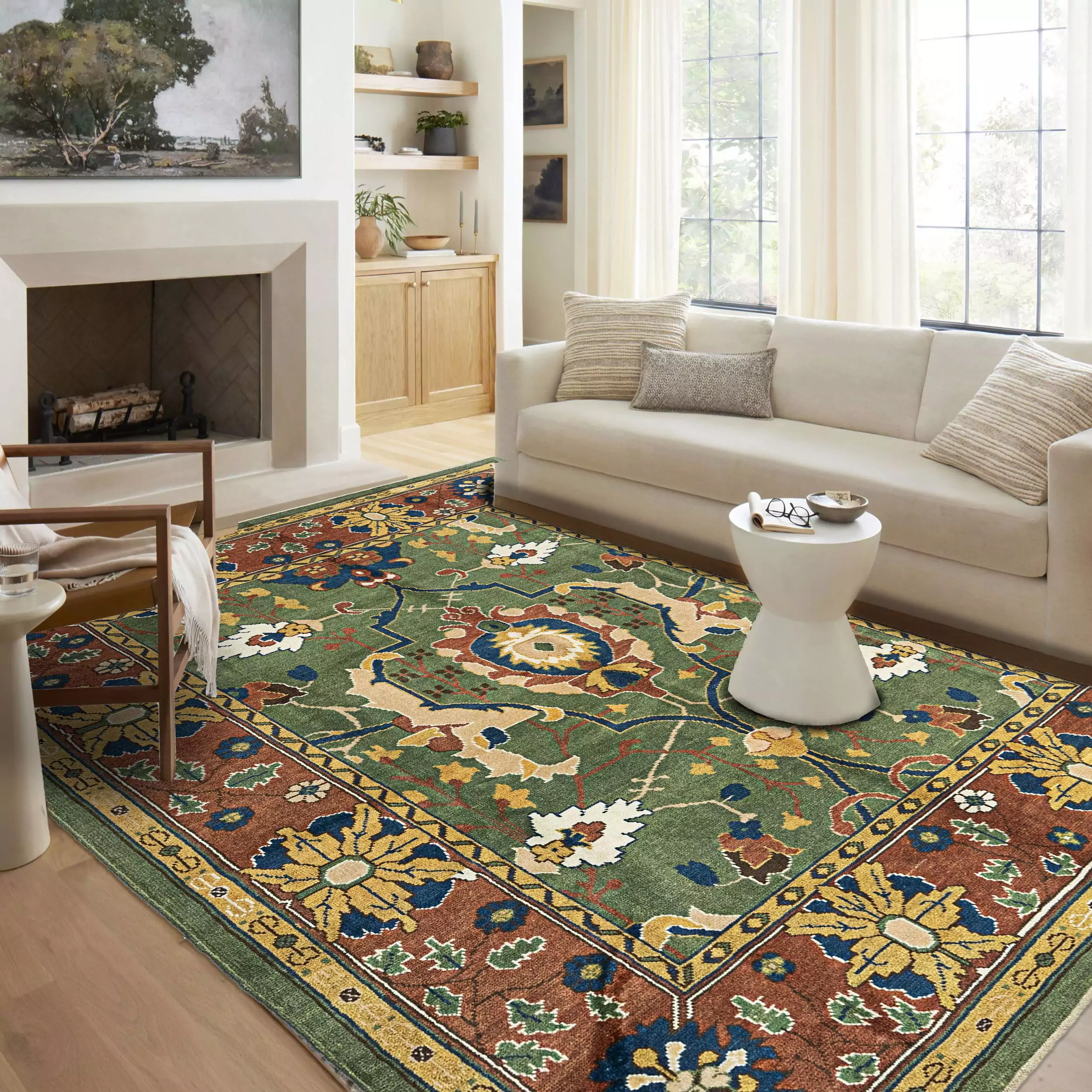 This stunning Donegal-inspired Ushak carpet is a true celebration of craftsmanship and heritage, blending the elegance of Irish Donegal designs with the timeless artistry of traditional Ushak weaving. Handcrafted by our expert artisans, it is made from premium handspun wool and dyed with natural plant-based pigments, ensuring exceptional quality, environmental responsibility, and rich, enduring color.