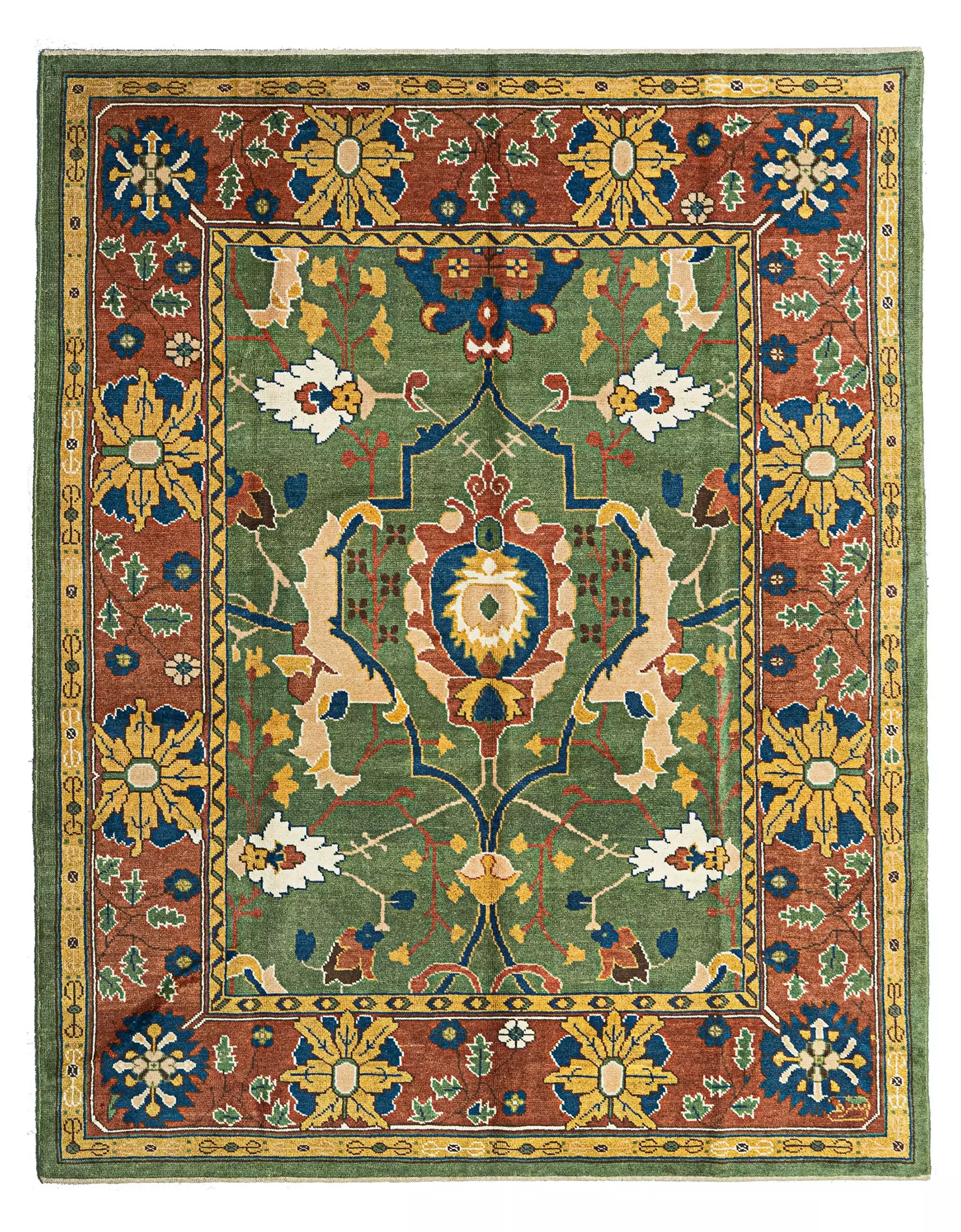 A striking red border encircles the field, creating a bold and refreshing contrast that enhances the piece’s decorative impact. Multiple narrow outer guard borders frame the central motifs, further emphasizing the carpet’s elegance and attention to detail.