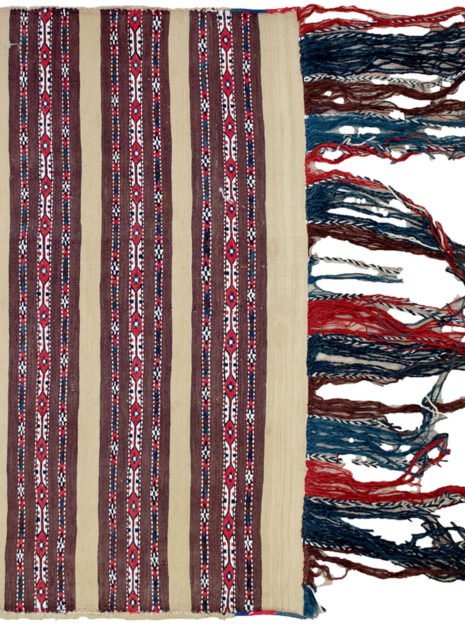 The Tobreh is adorned with a finely detailed pattern woven with natural-dyed wool, showcasing a refined colour palette that is both decorative and harmonious. The addition of tassels along three sides adds movement, charm, and a sense of authenticity, making this an exceptional display piece.