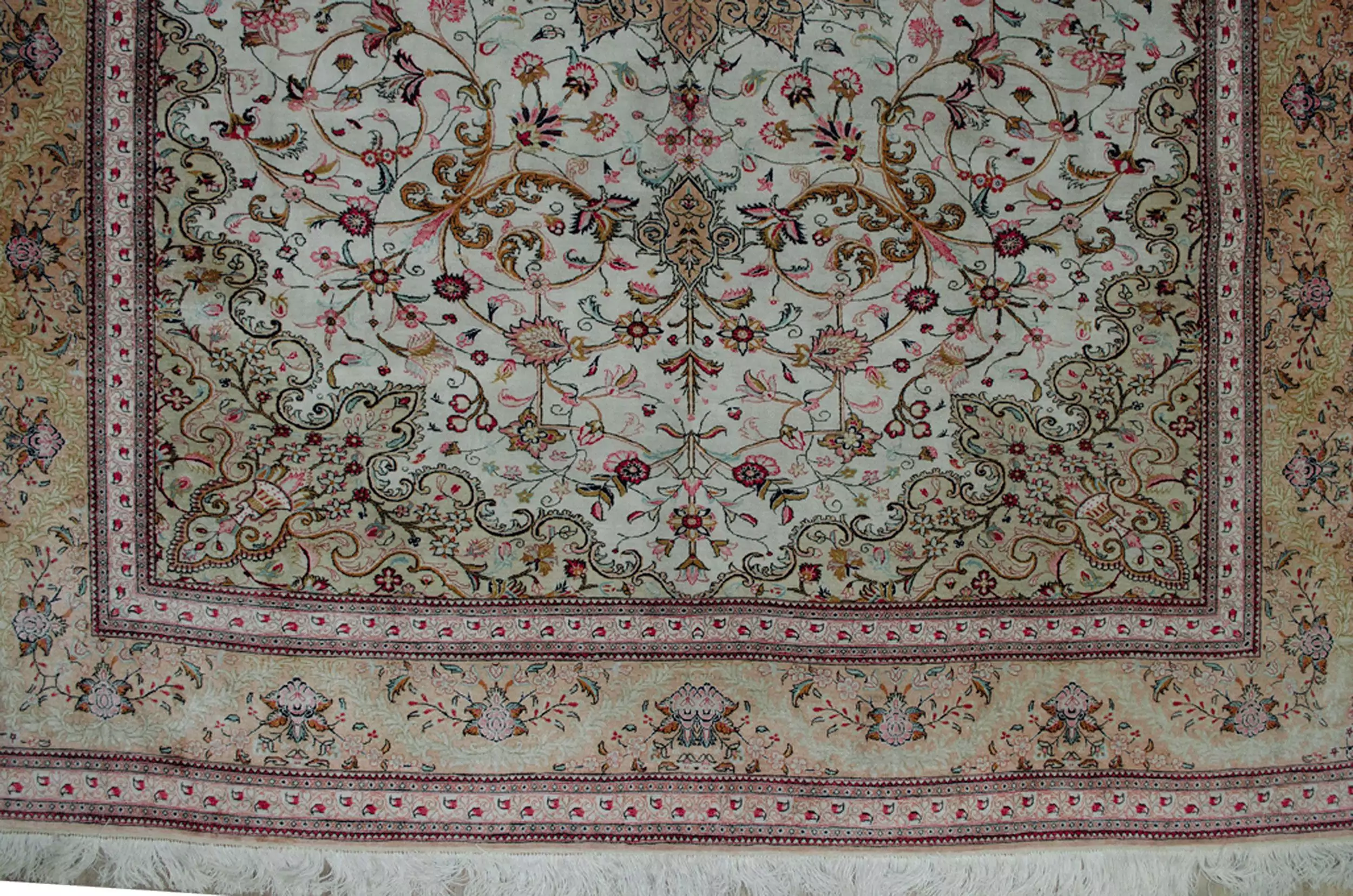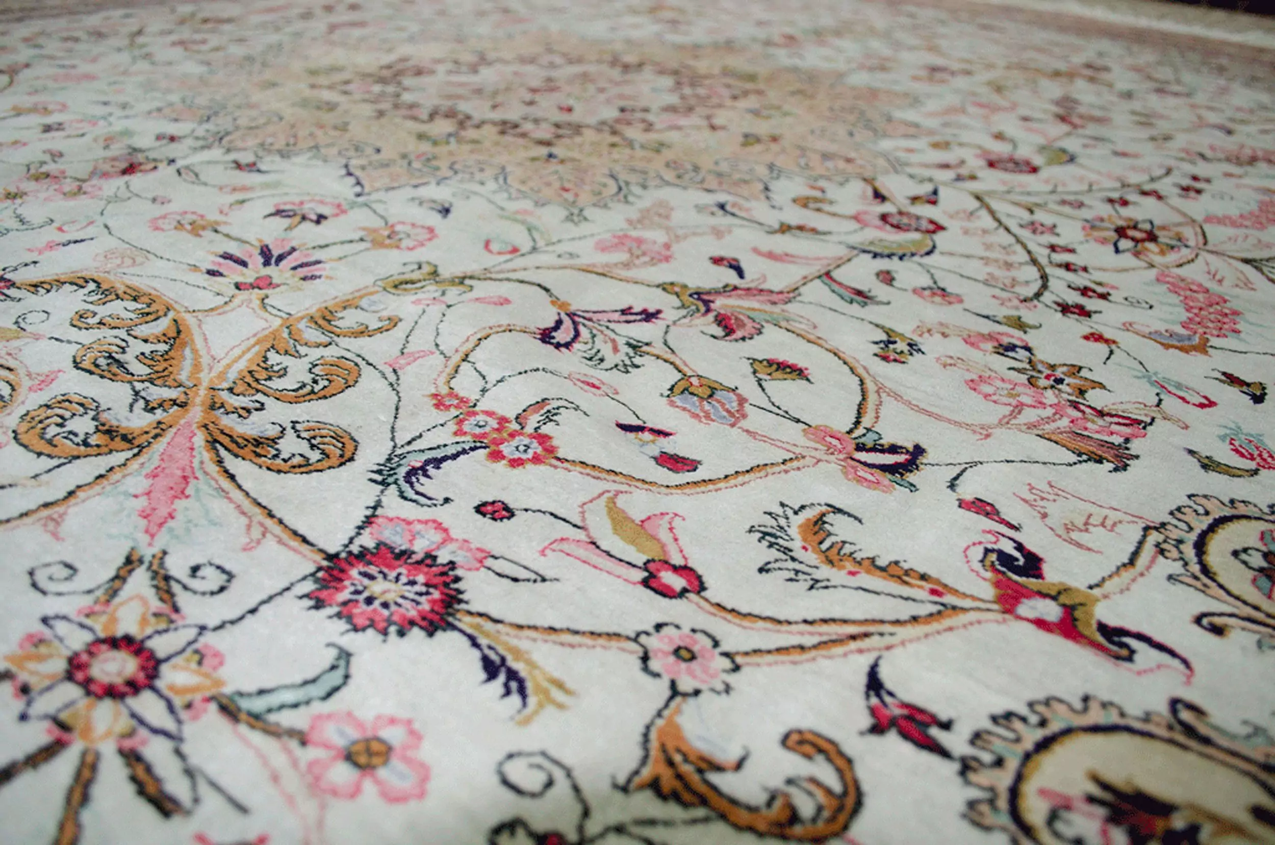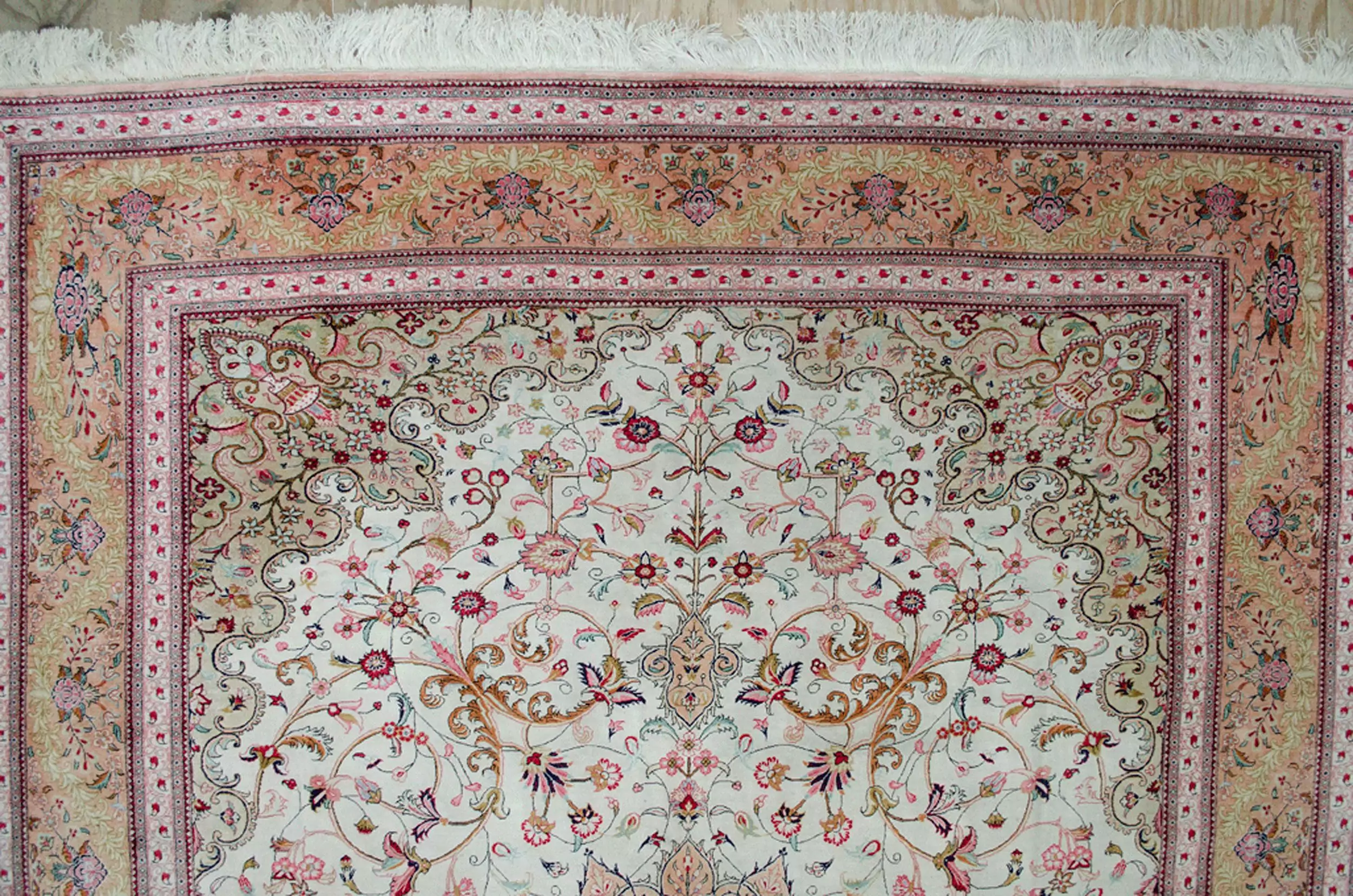 Ideal for collectors or discerning decorators, this Qum carpet offers a blend of aesthetic beauty, cultural heritage, and technical excellence. Whether placed in a formal setting, bedroom, or gallery space, it promises to be an eye-catching centrepiece that brings warmth and sophistication.