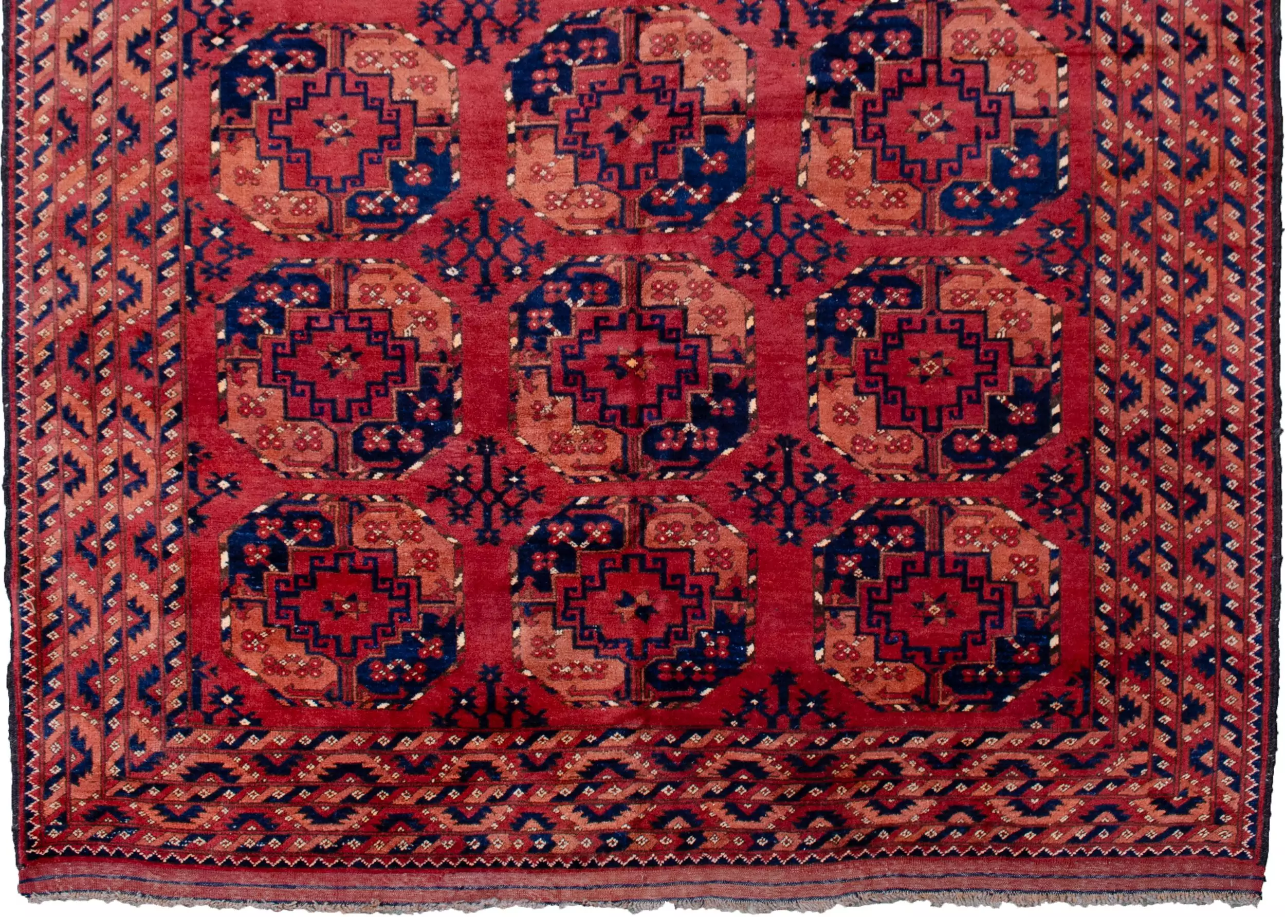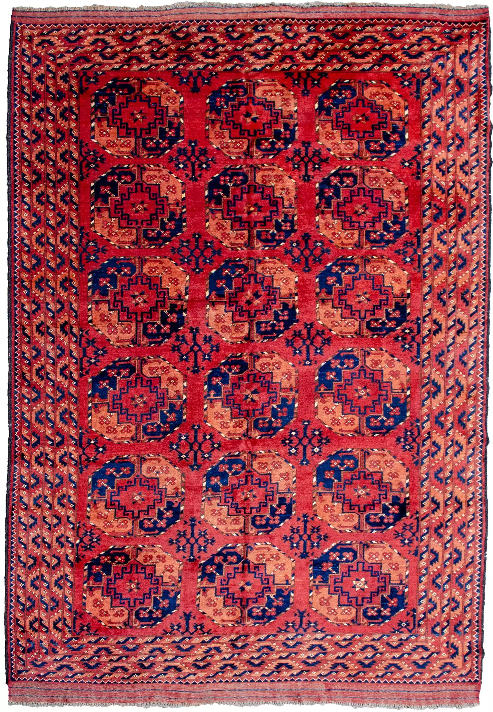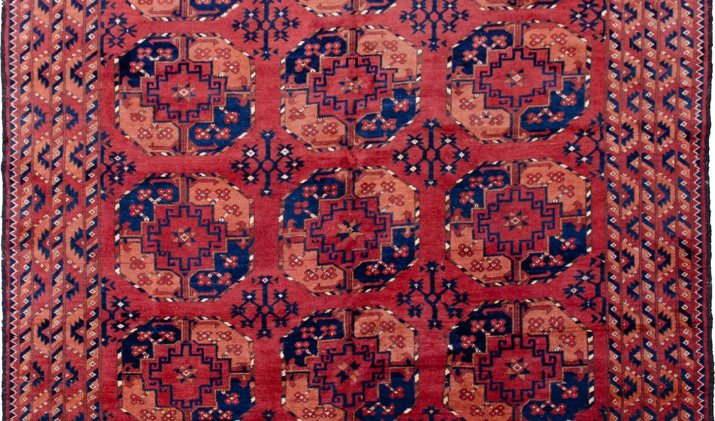 The soft red ground provides a warm, earthy backdrop for three rows of large octagonal guls, a distinctive Ersari hallmark, traditionally used to represent tribal identity and protection. These motifs are deeply rooted in Central Asian heritage and lend a strong yet elegant graphic presence to the rug.