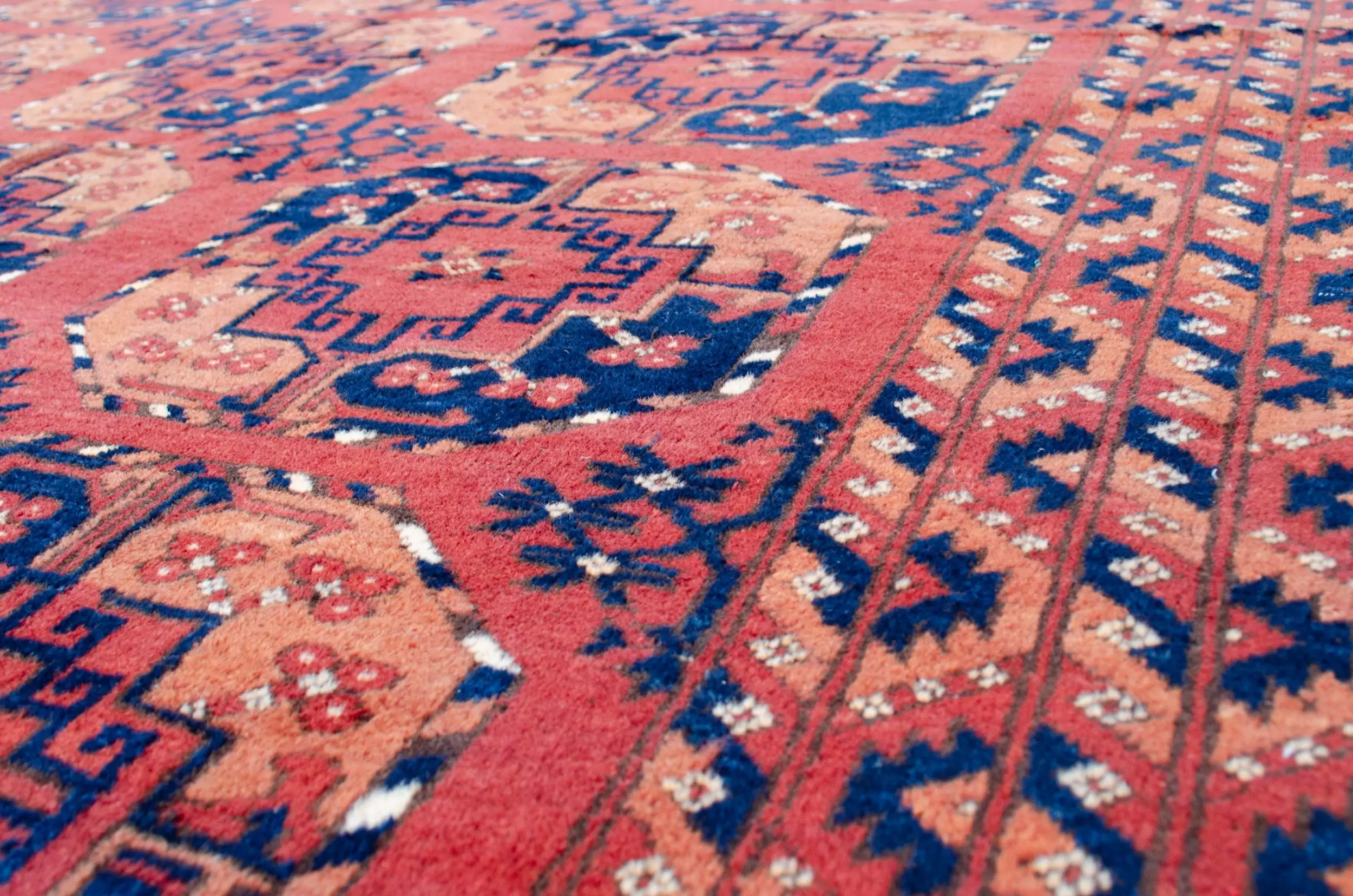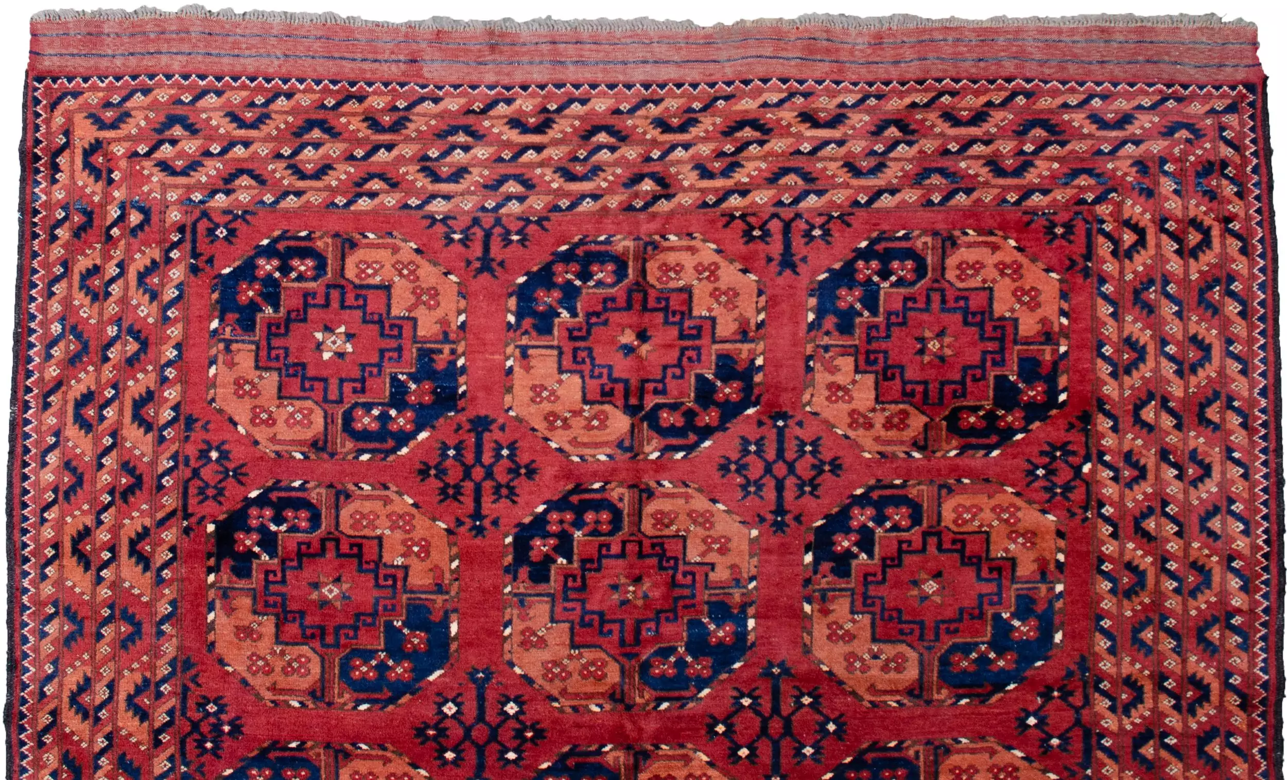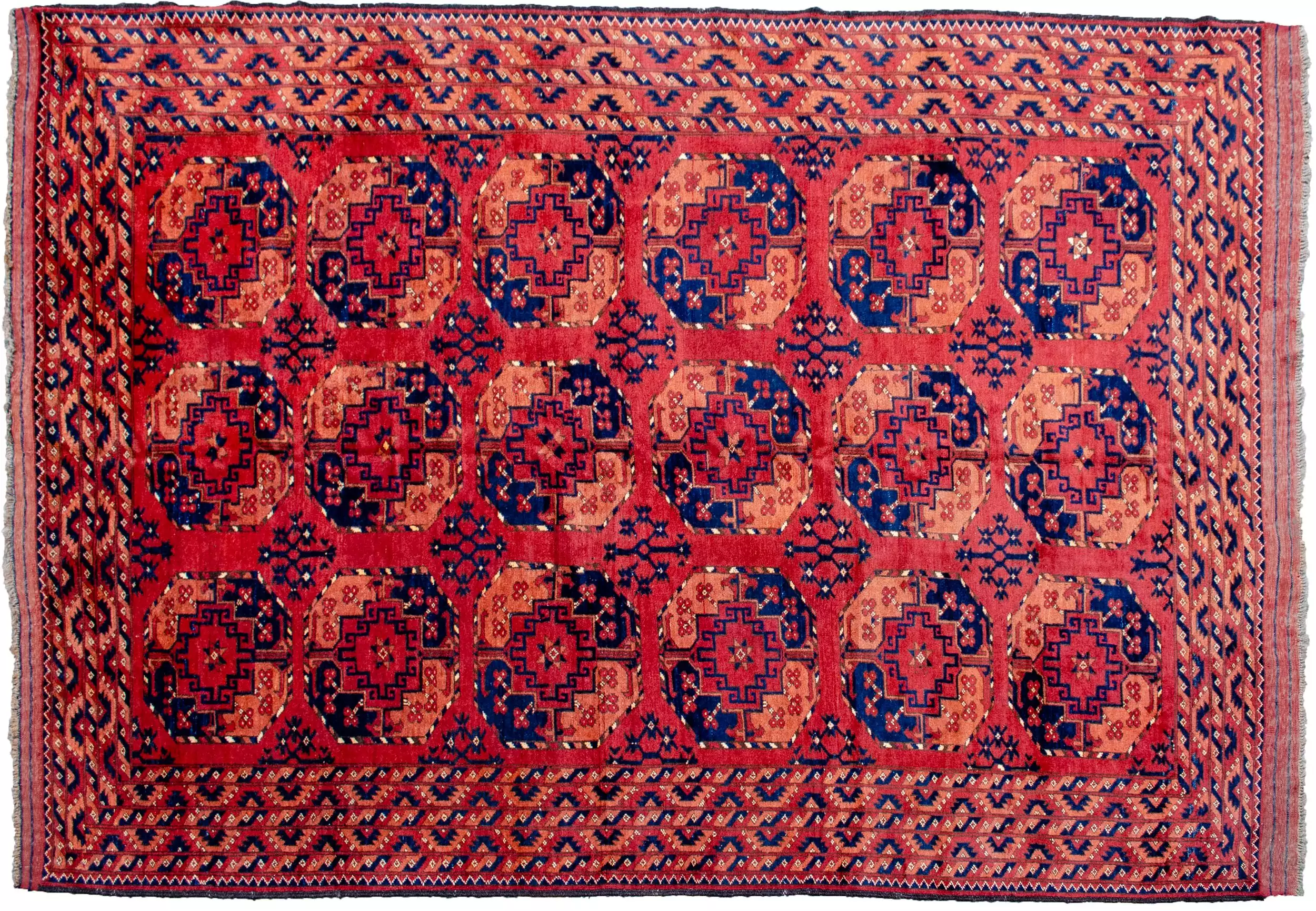 The soft red ground provides a warm, earthy backdrop for three rows of large octagonal guls, a distinctive Ersari hallmark, traditionally used to represent tribal identity and protection. These motifs are deeply rooted in Central Asian heritage and lend a strong yet elegant graphic presence to the rug.