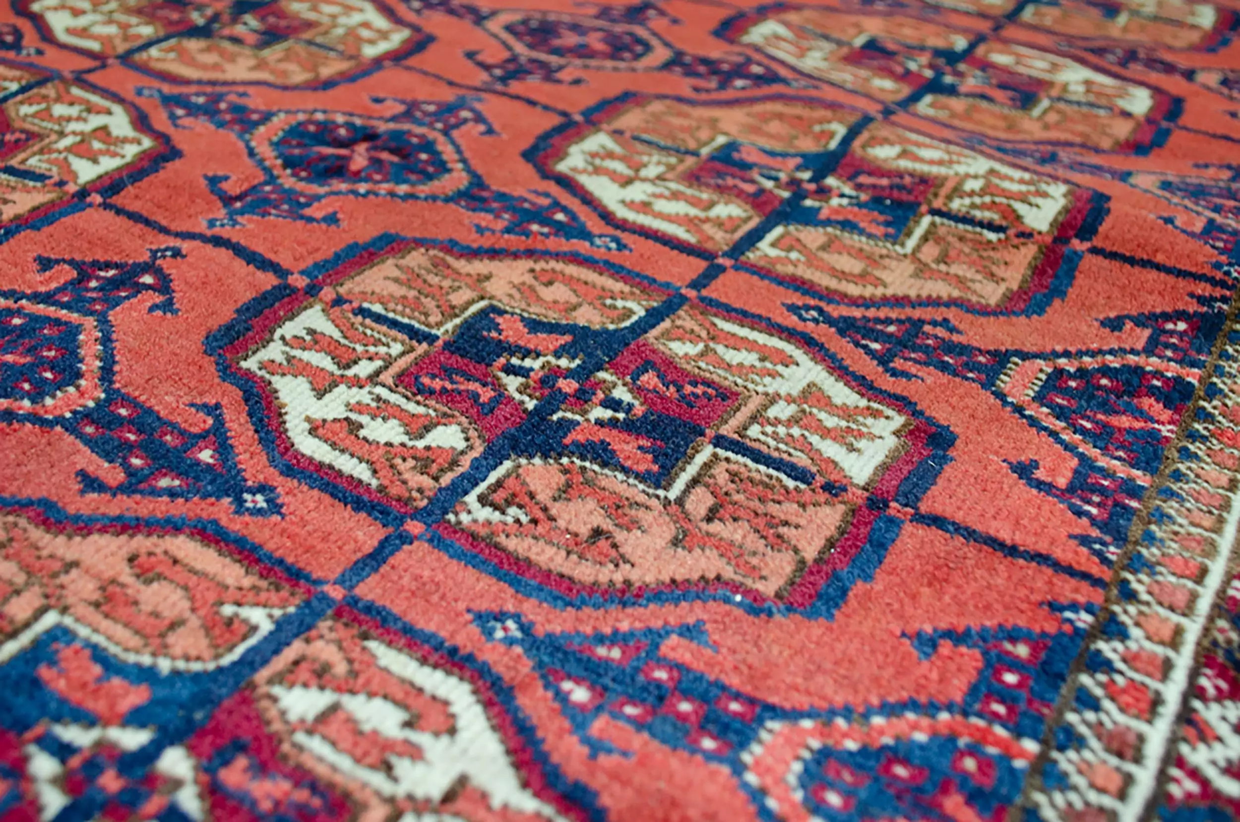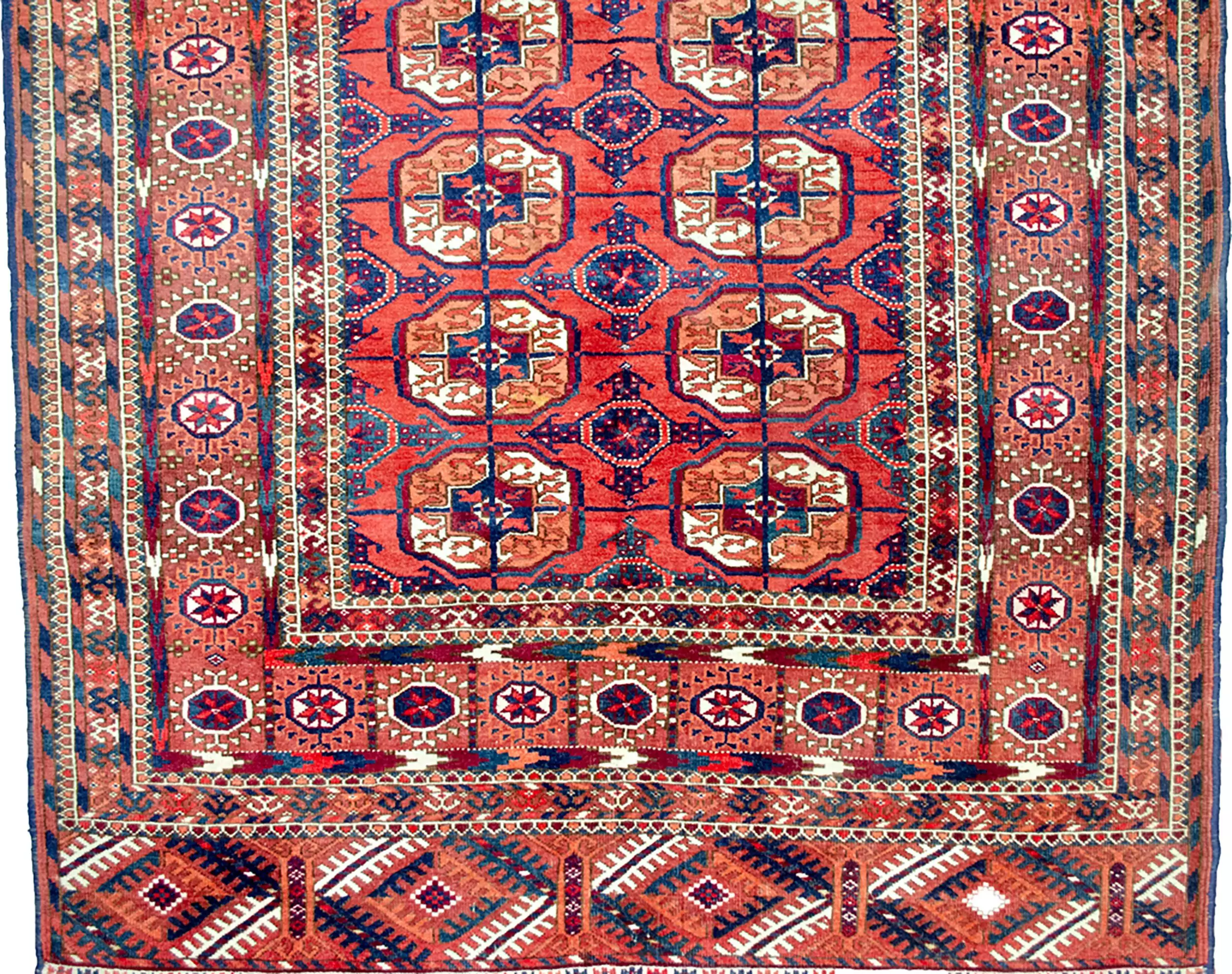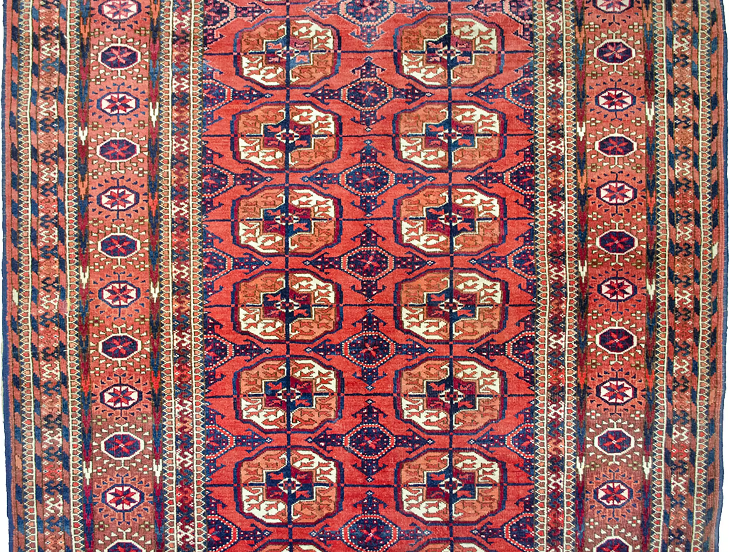 This excellent antique Tekke Turkmen rug is a true reflection of Central Asian nomadic craftsmanship and heritage. Woven with care and precision, the rug showcases two distinct rows of the iconic ‘elephant foot’ guls — a hallmark of the Tekke tribe’s weaving tradition.