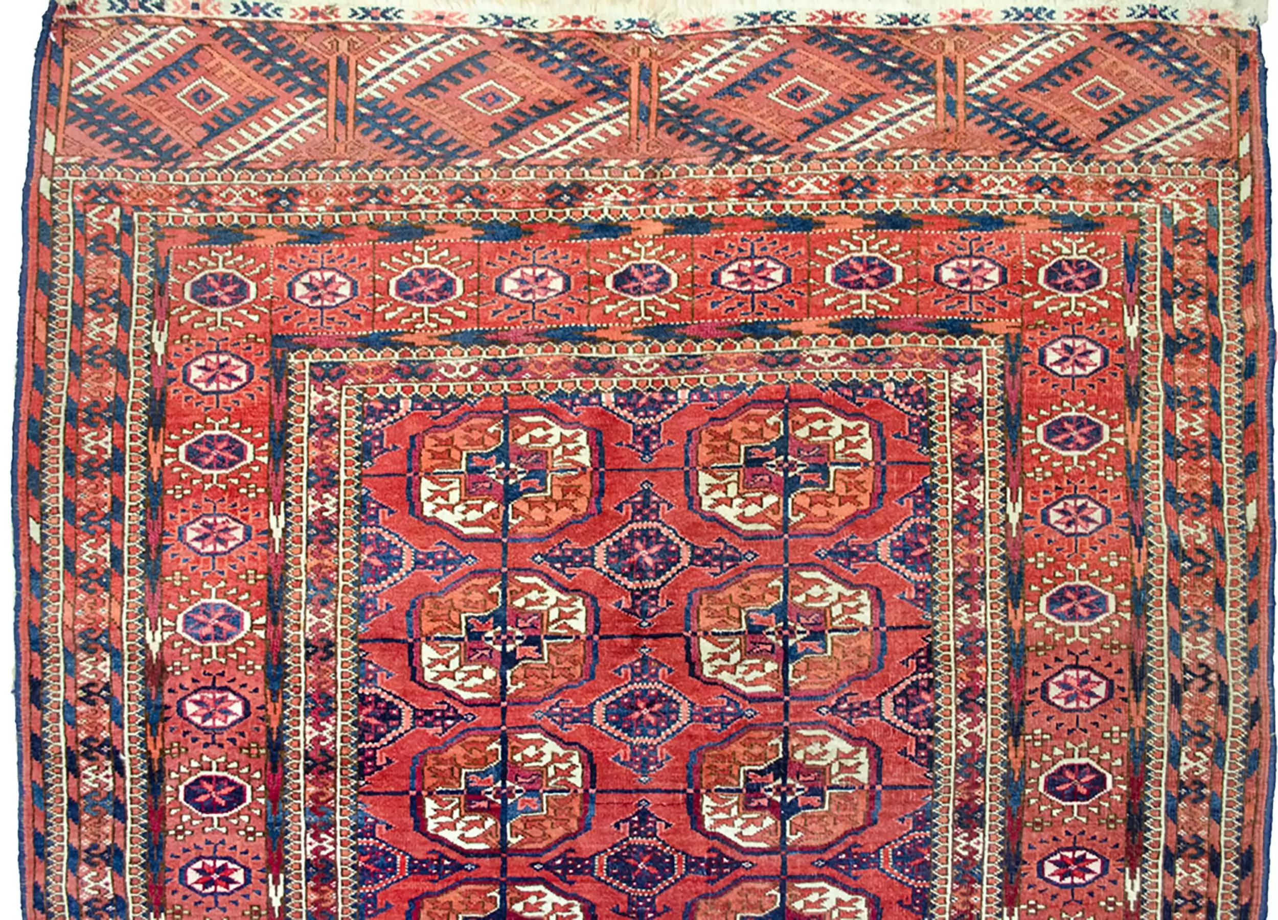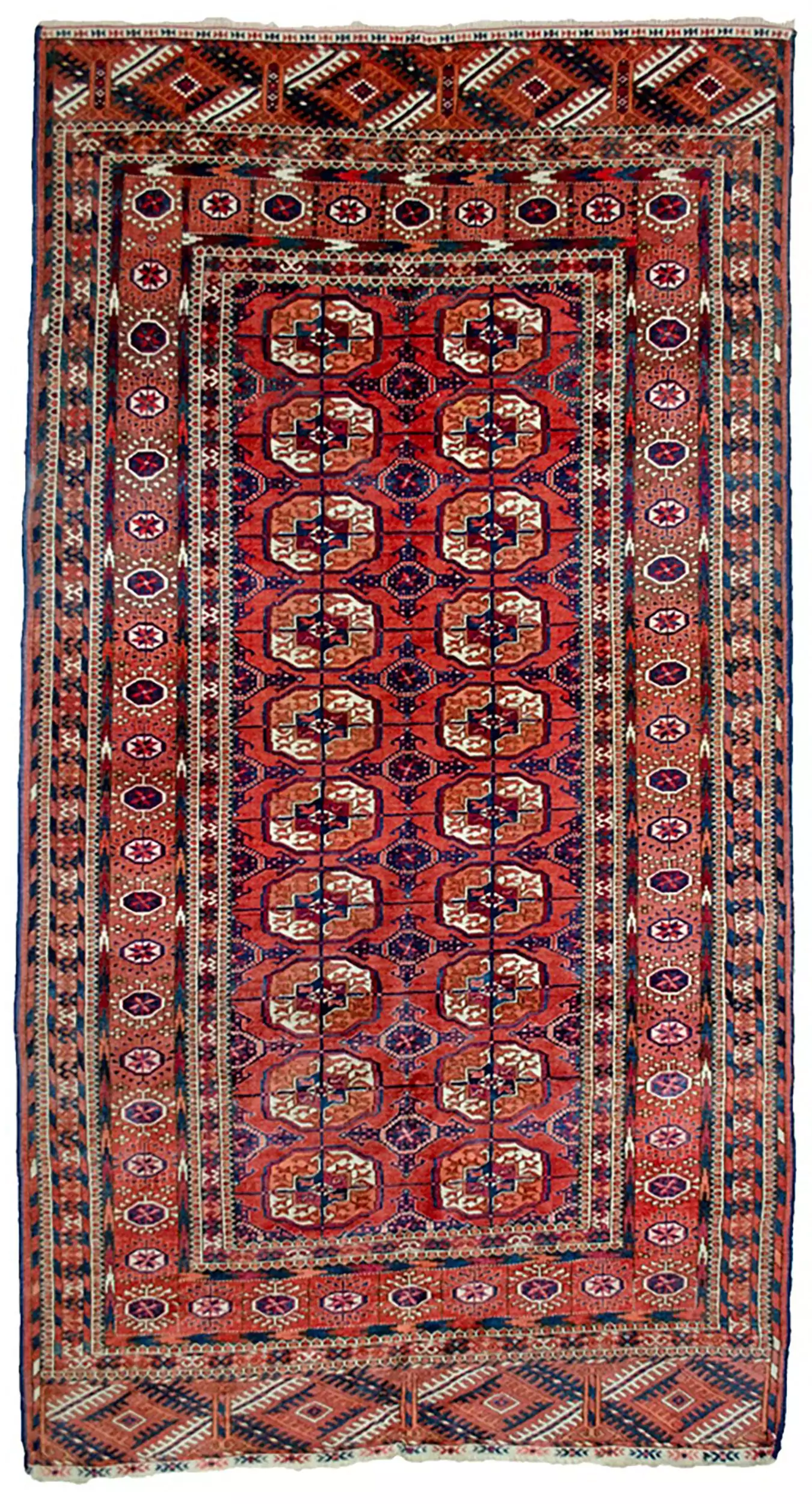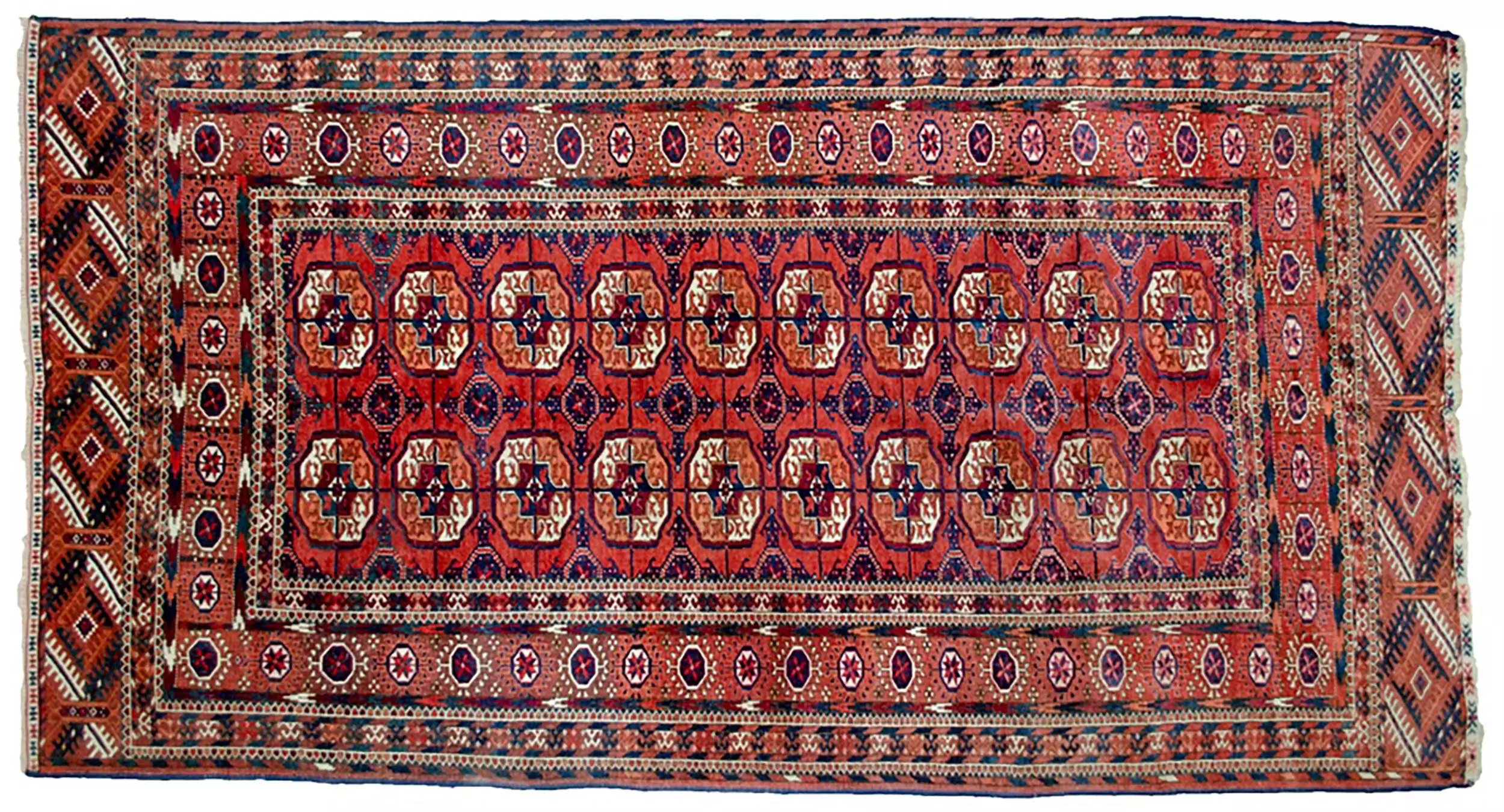 This excellent antique Tekke Turkmen rug is a true reflection of Central Asian nomadic craftsmanship and heritage. Woven with care and precision, the rug showcases two distinct rows of the iconic ‘elephant foot’ guls — a hallmark of the Tekke tribe’s weaving tradition.