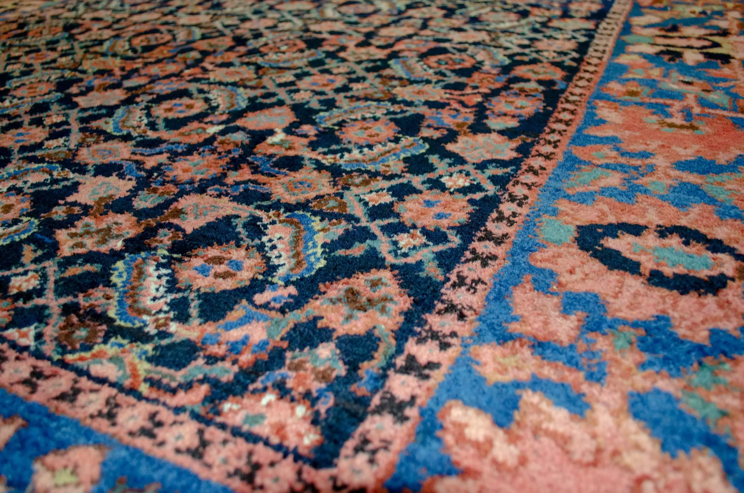 Adding further beauty is the light blue border, adorned with large stylised floral motifs that soften the overall composition and create a captivating contrast to the darker field. This colour pairing—navy and light blue—is both timeless and decorative, making the rug versatile for use in traditional or transitional interiors.