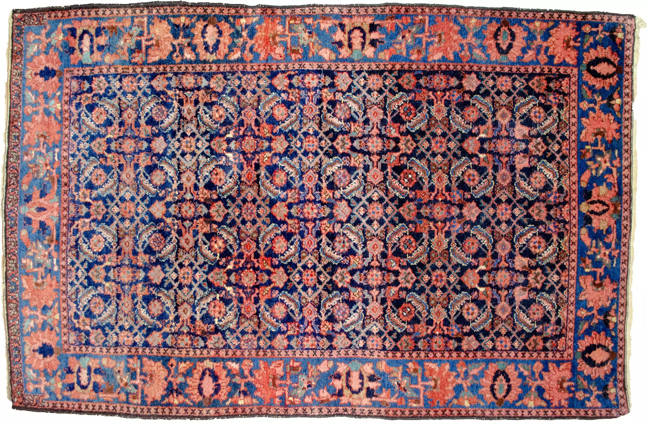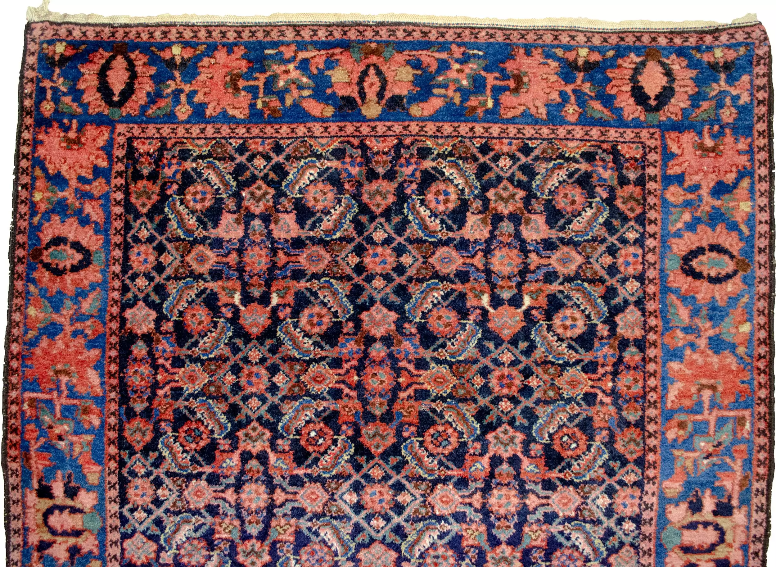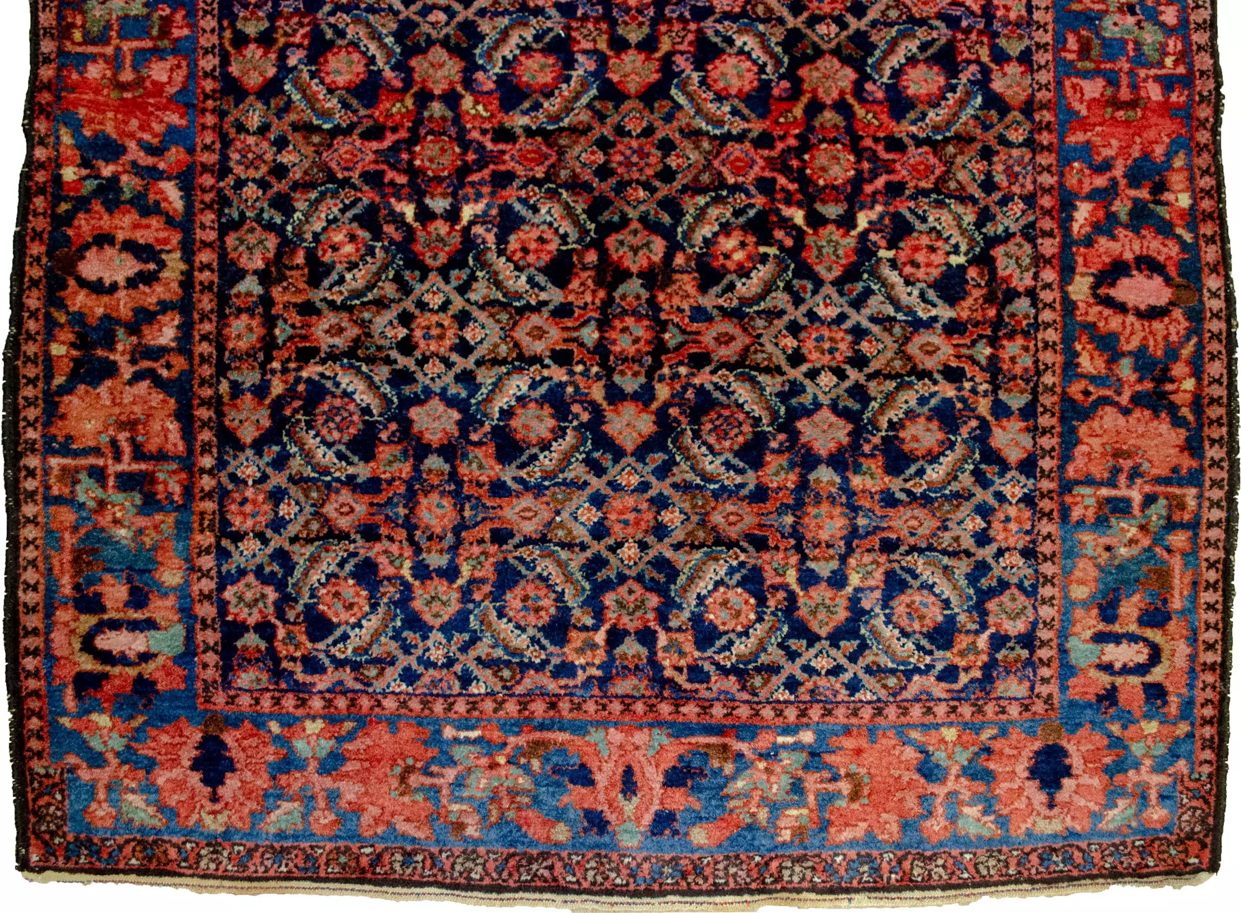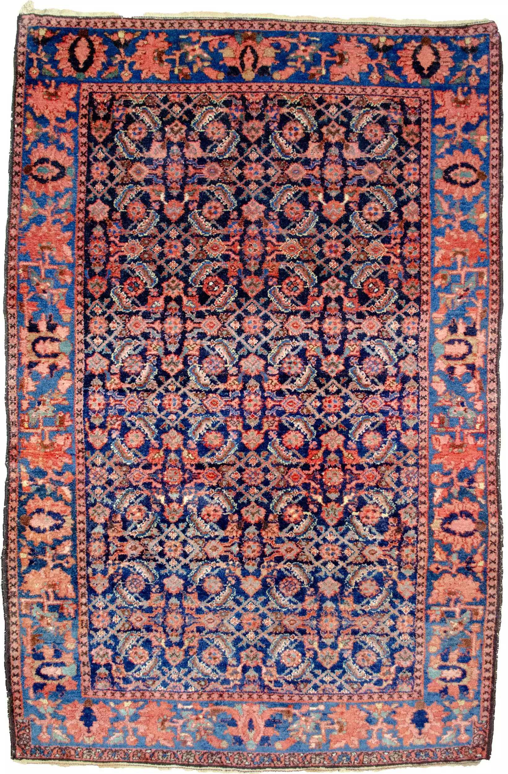 The design features a striking Herati (Mahi) pattern, which stands out vividly against the deep navy blue background, offering a classic, rhythmic elegance prized by collectors and decorators alike. The finely woven details enhance the clarity and symmetry of the pattern, making this a truly distinguished example of its kind.