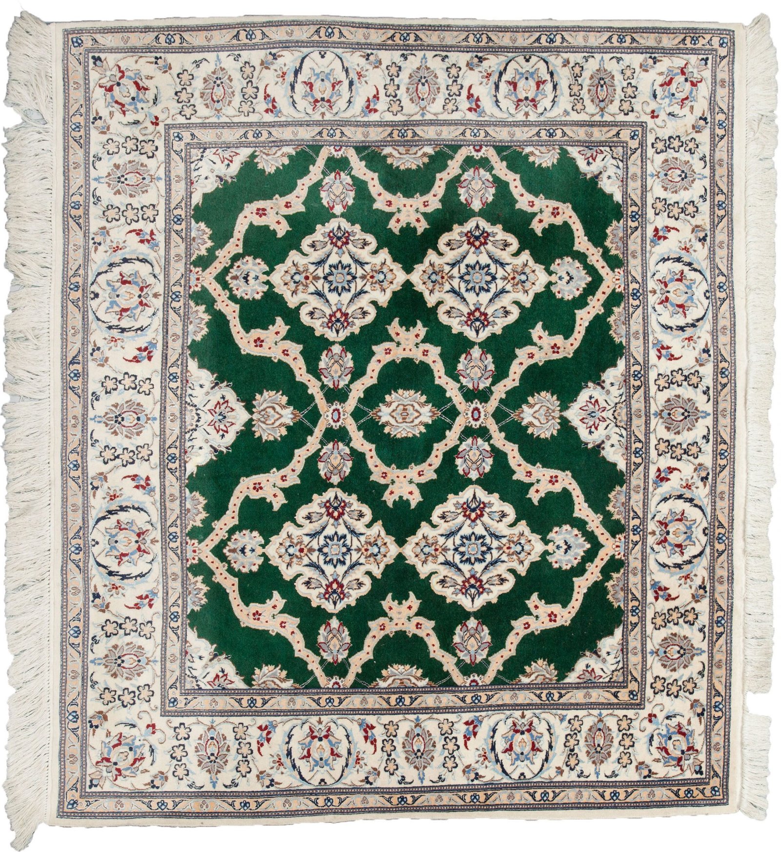 This exquisite fine Nain rug is a truly remarkable piece, especially rare in its 129x145cm size and green and cream tones. Meticulously handwoven in central Iran, this rug exemplifies the renowned precision and elegance of Nain craftsmanship.