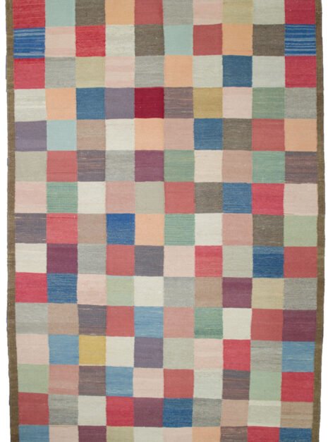 This fine Persian kilim is a part of our exclusive in-house production and showcases the elegance of traditional weaving with a modern, decorative twist. The multicoloured checkered design is lively and refined, brought to life by subtle abrushes—the naturally occurring colour variations in the hand-dyeing process. These variations add movement, depth, and visual charm to the design, making each piece truly unique.