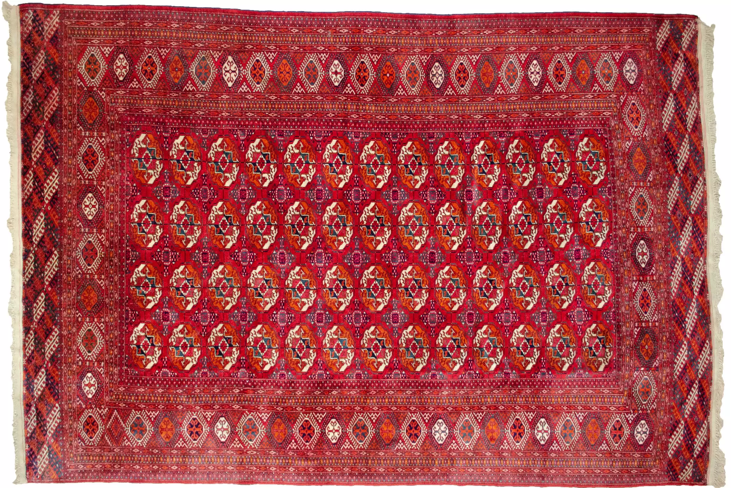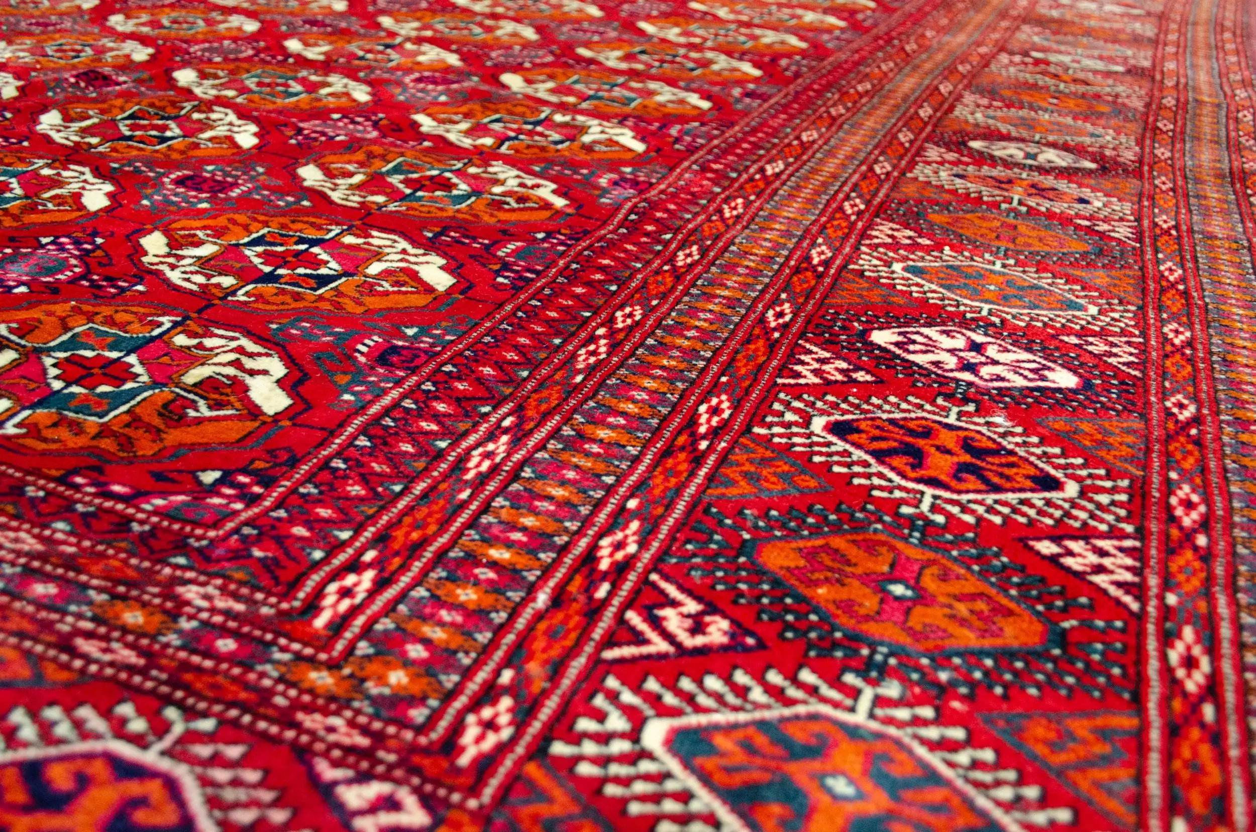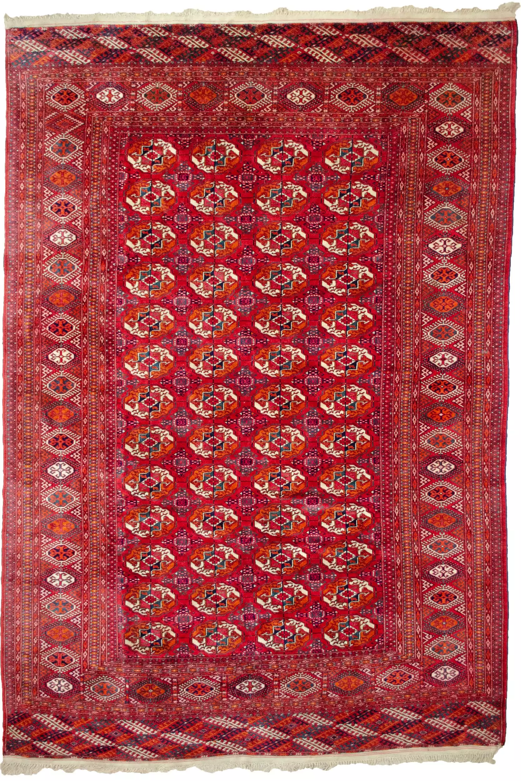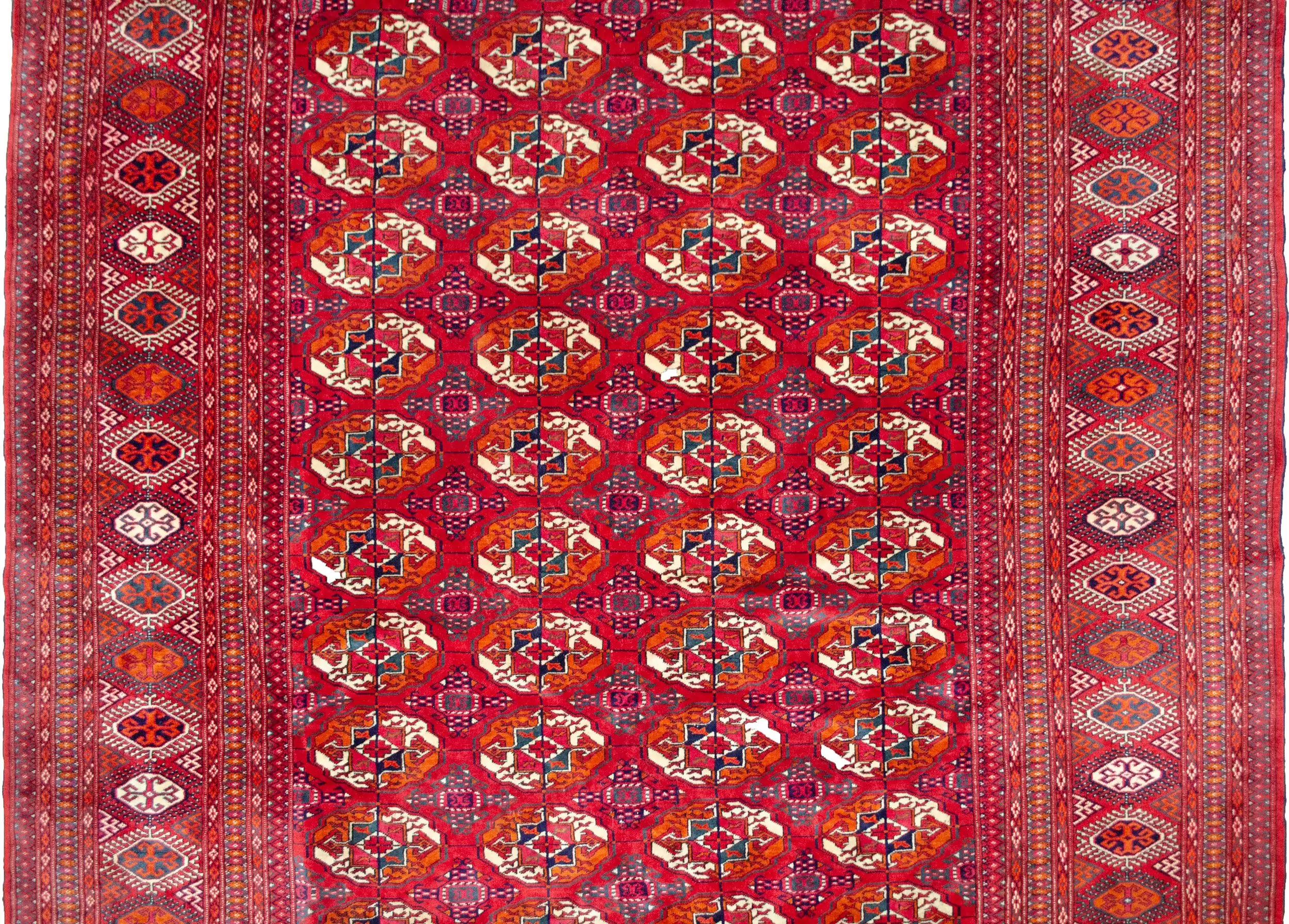 The Tekke Gul is the signature design of the Tekke tribe, one of the most well-known Turkmen groups, and symbolises strength, protection, and identity. This carpet’s layout is meticulously executed, with a field full of repeated guls that create a rhythmic and visually satisfying pattern. The secondary motifs and borders are equally sharp, adding to the balance and elegance of the piece.