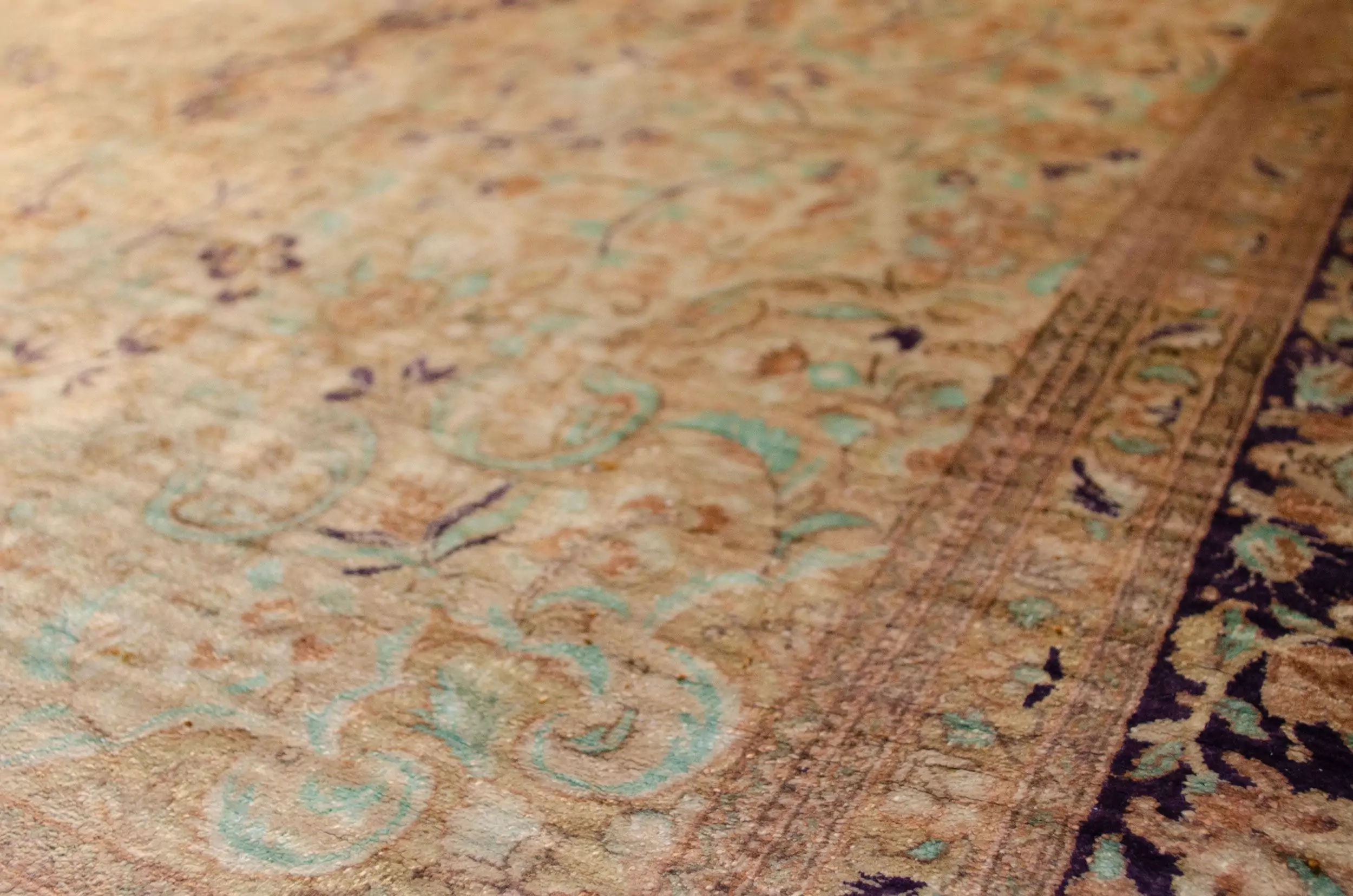 This very finely woven silk Qum rug from Central Iran is a refined example of Persian luxury weaving, offering both technical excellence and aesthetic grace. Crafted in one of Iran’s most prestigious weaving centres, this piece is distinguished by its silk construction, detailed drawing, and a carefully executed tea-wash finish that gives it a harmonious, aged elegance.