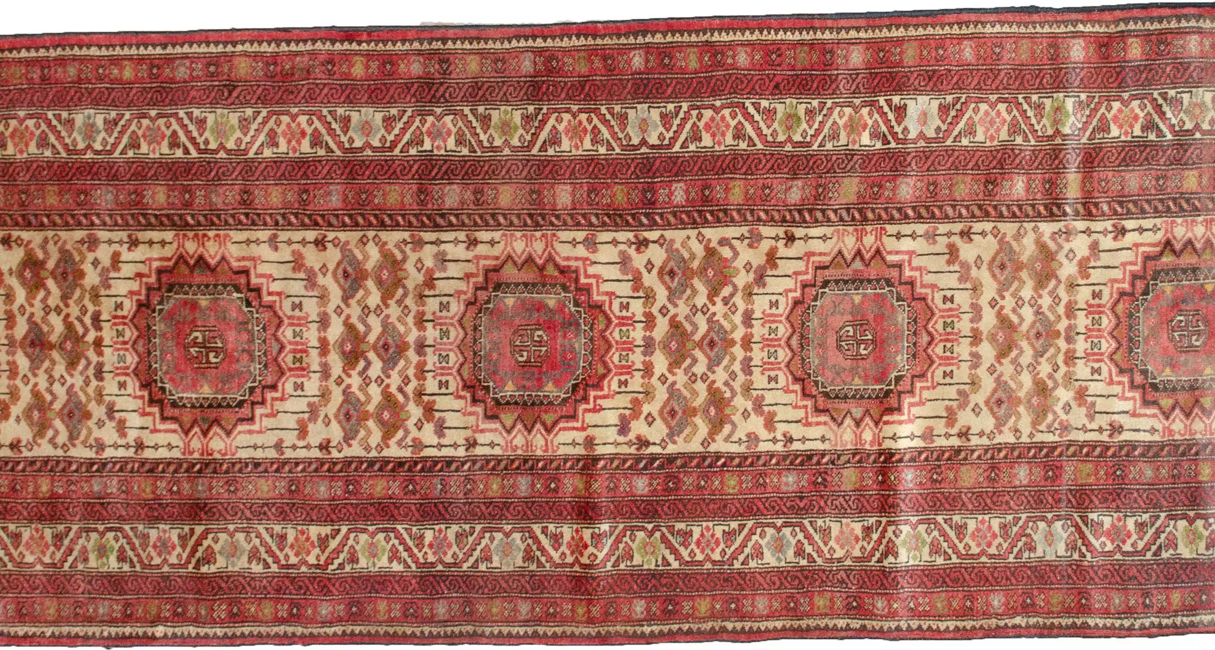 Woven with soft, high-grade wool, the rug has a supple feel and a subtle sheen that reflects the craftsmanship behind it. The cream ground acts as a clean, bright canvas for a series of multiple soft red medallions, creating a repeating, harmonious rhythm across the runner. The matching cream border completes the composition with grace, adding balance without distraction.